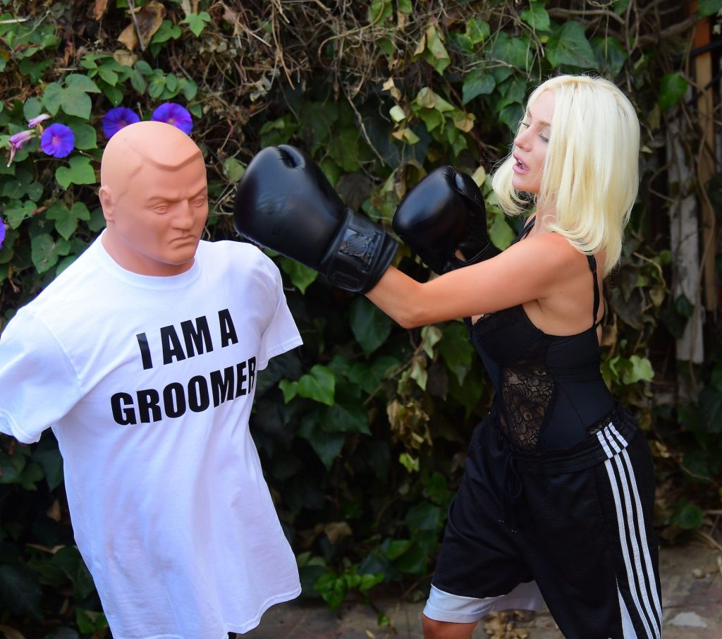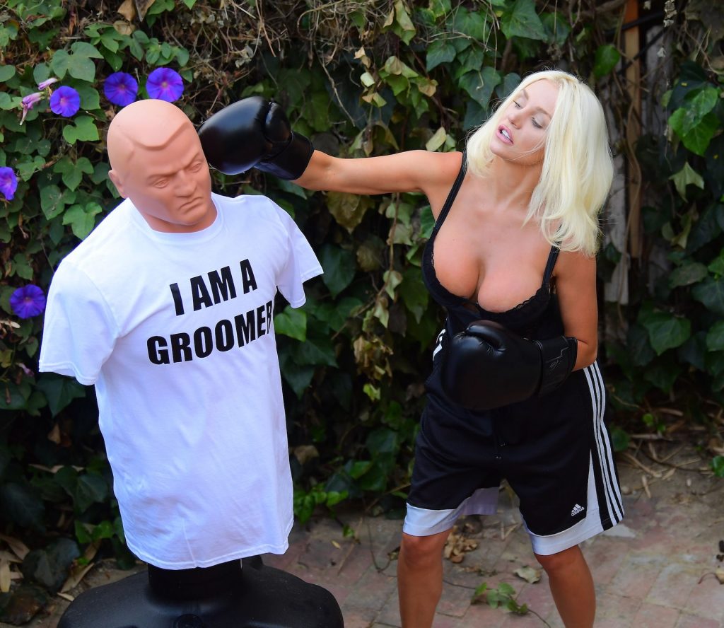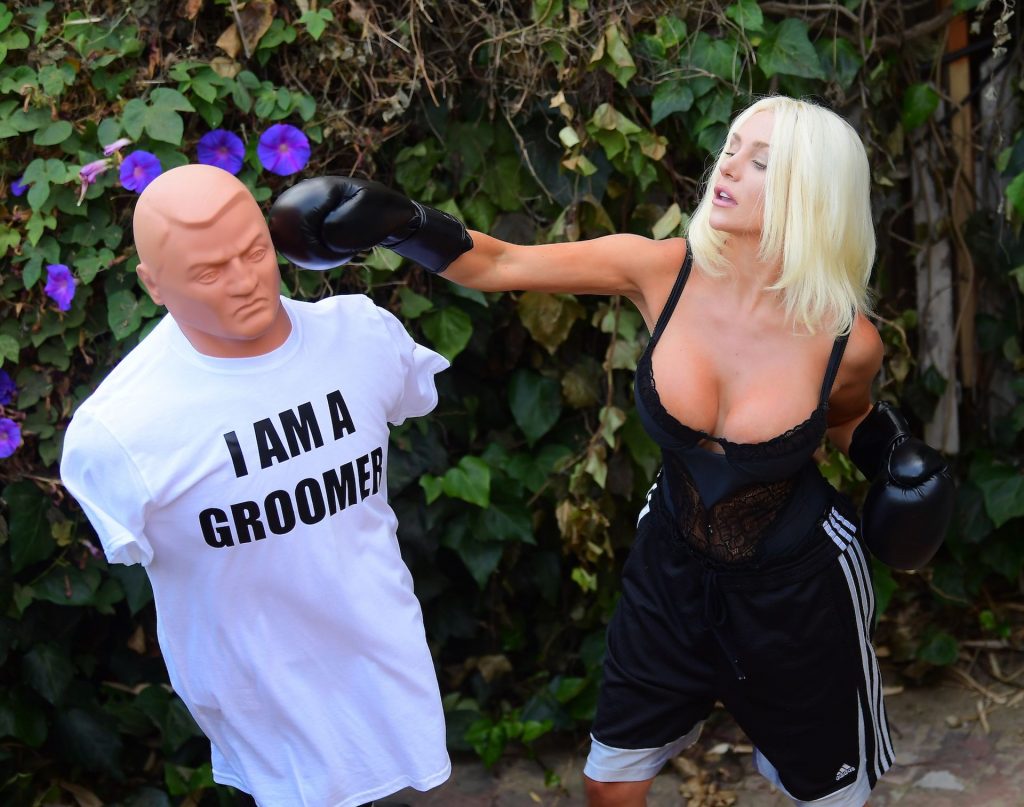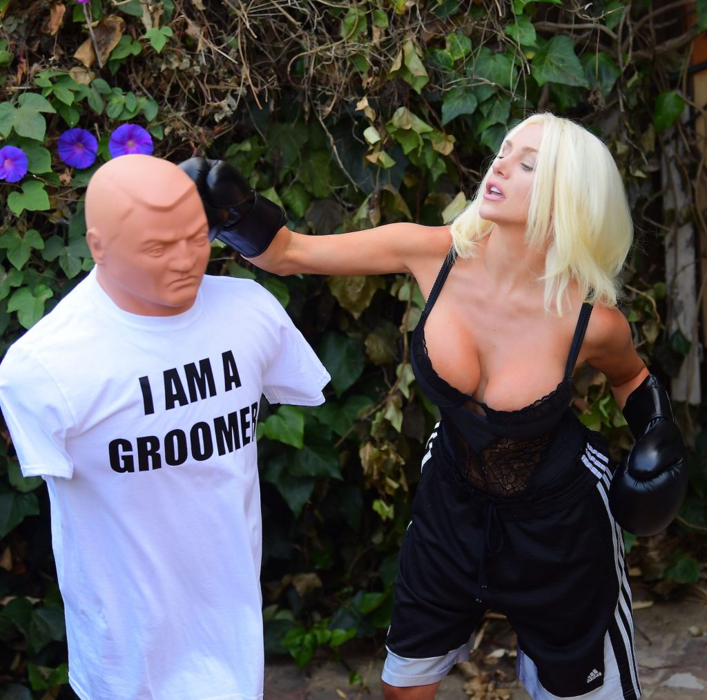 La modelo/cantante voluptuosa Courtney Stodden lanza golpes a su ex Doug Hutchinson golpeando y pateando un maniquí que lleva una camiseta con la frase “I AM A GROOMER” en Beverly Hills, 07/07/2020.