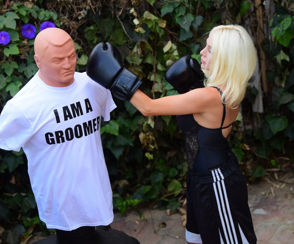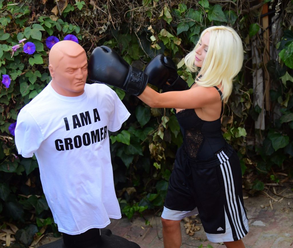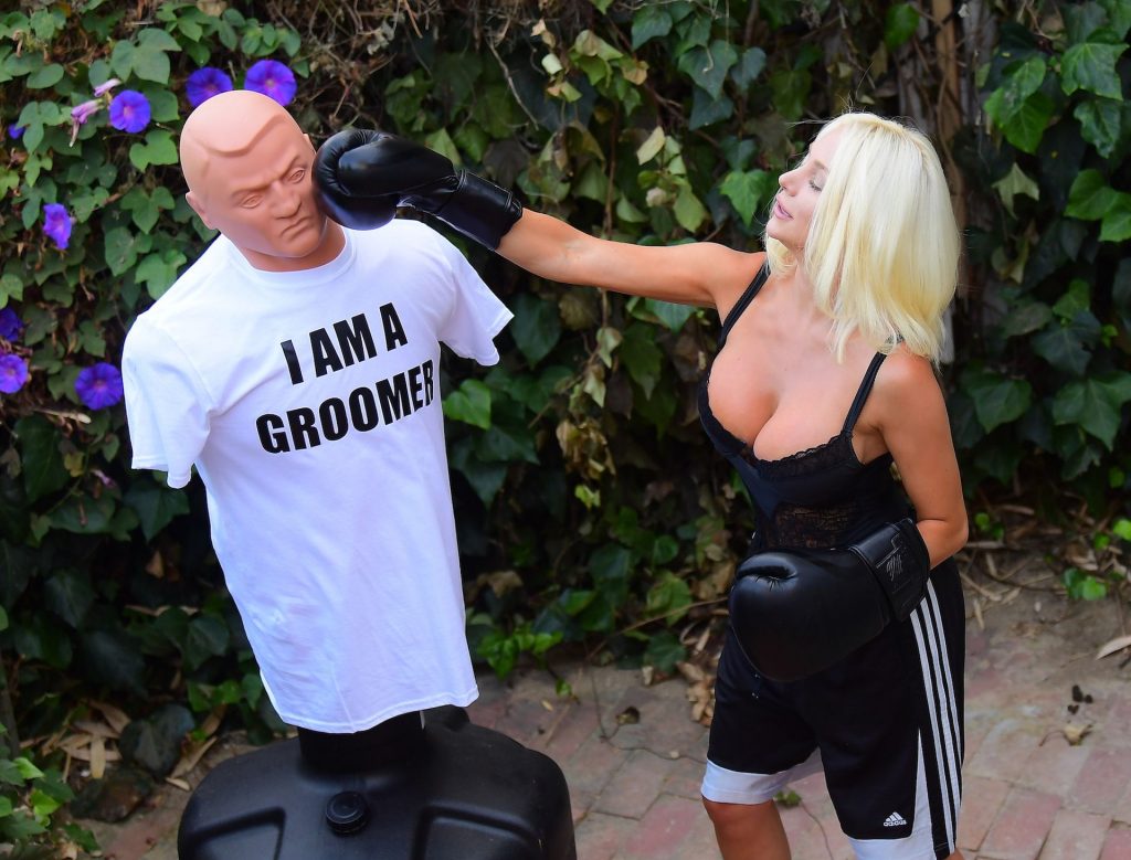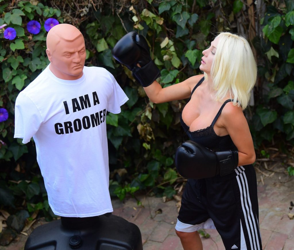 La modelo/cantante voluptuosa Courtney Stodden lanza golpes a su ex Doug Hutchinson golpeando y pateando un maniquí que lleva una camiseta con la frase “I AM A GROOMER” en Beverly Hills, 07/07/2020.