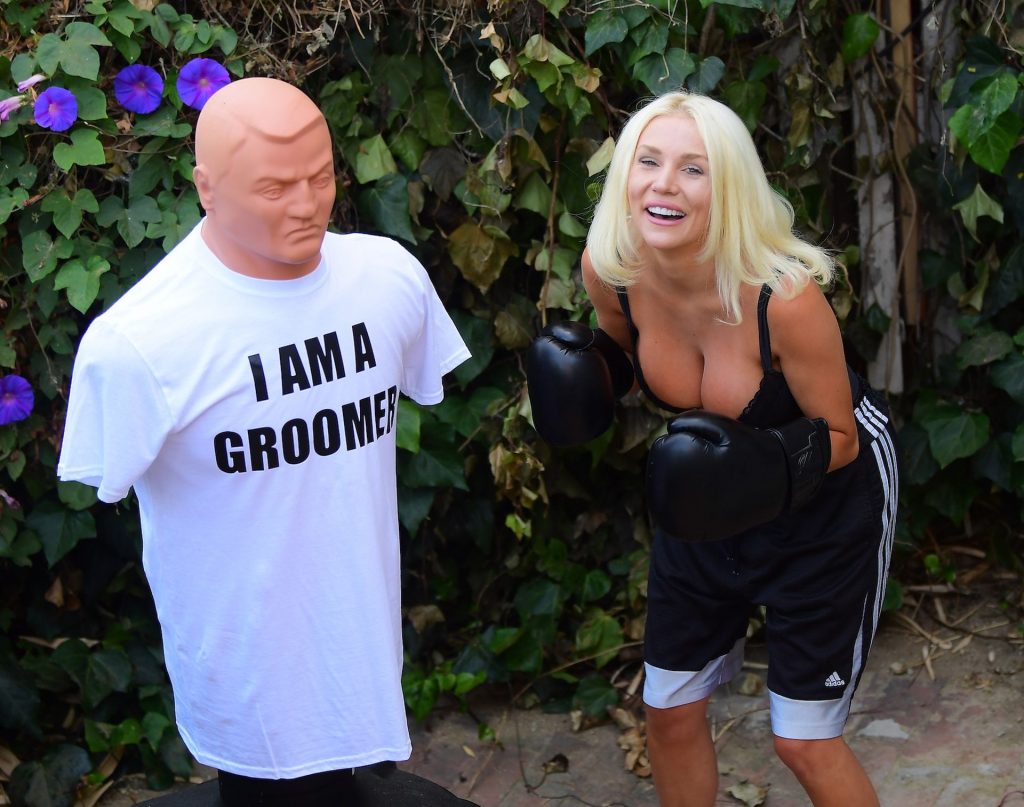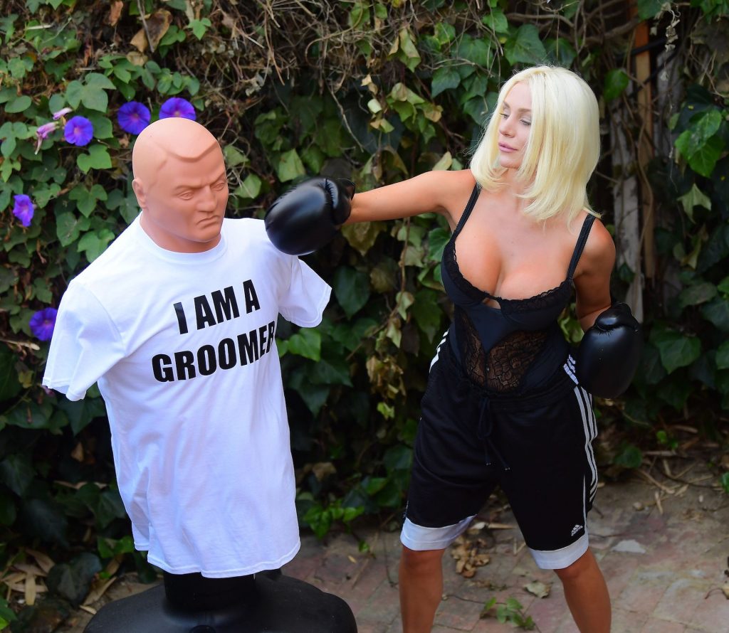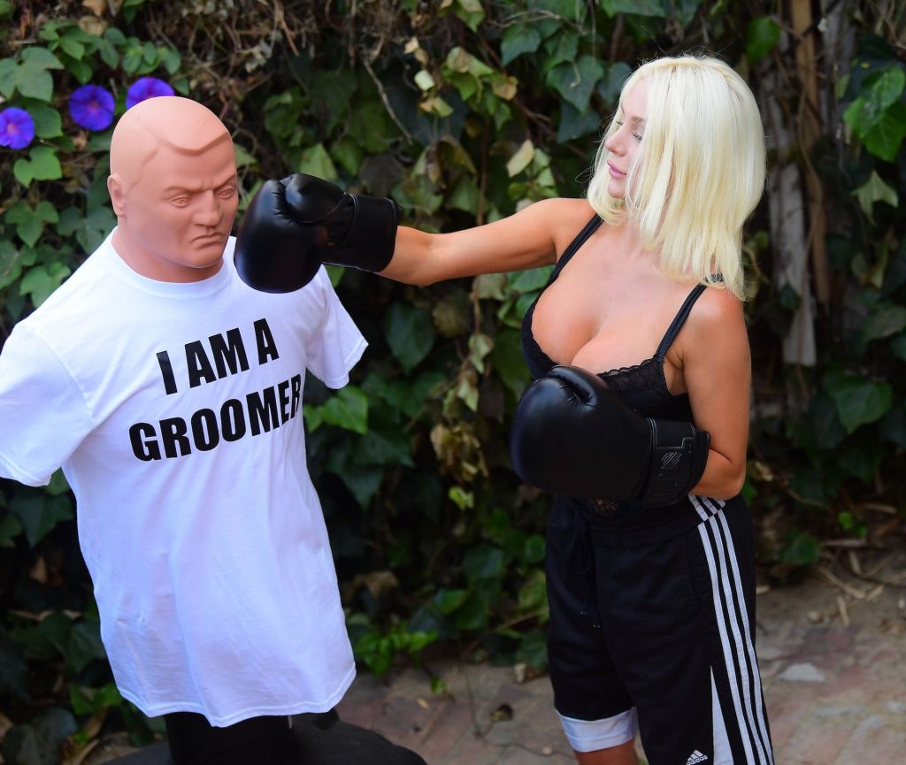Courtney se puso equipo de boxeo mientras golpeaba fuerte al maniquí. Famosamente llamó a su ex esposo un groomer, y reportes dicen que su aventura Brian Austin Green es igual de mala.