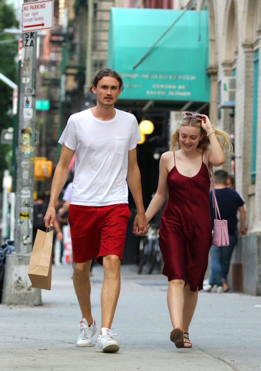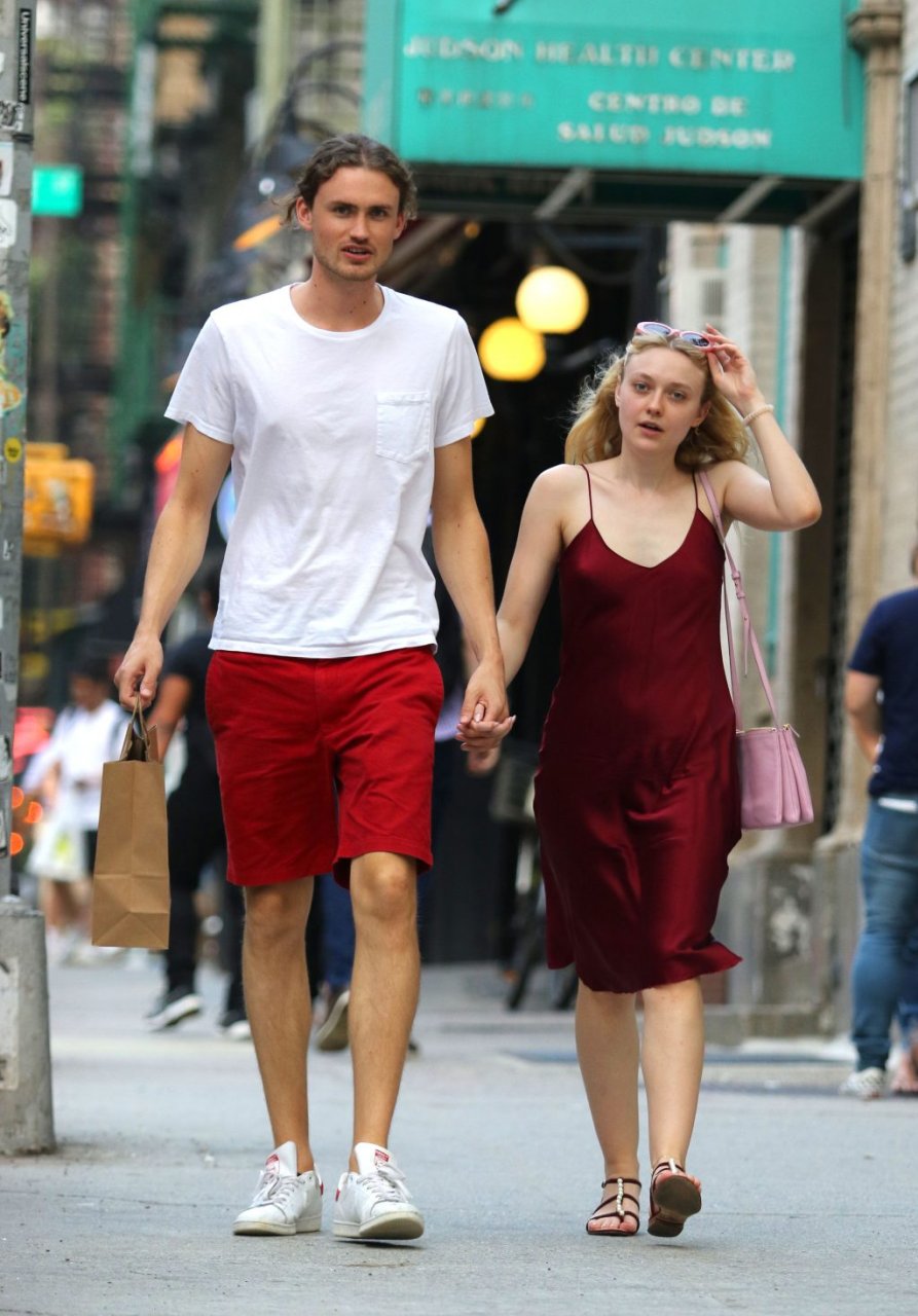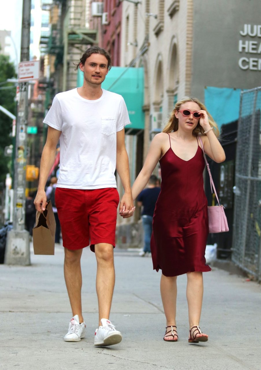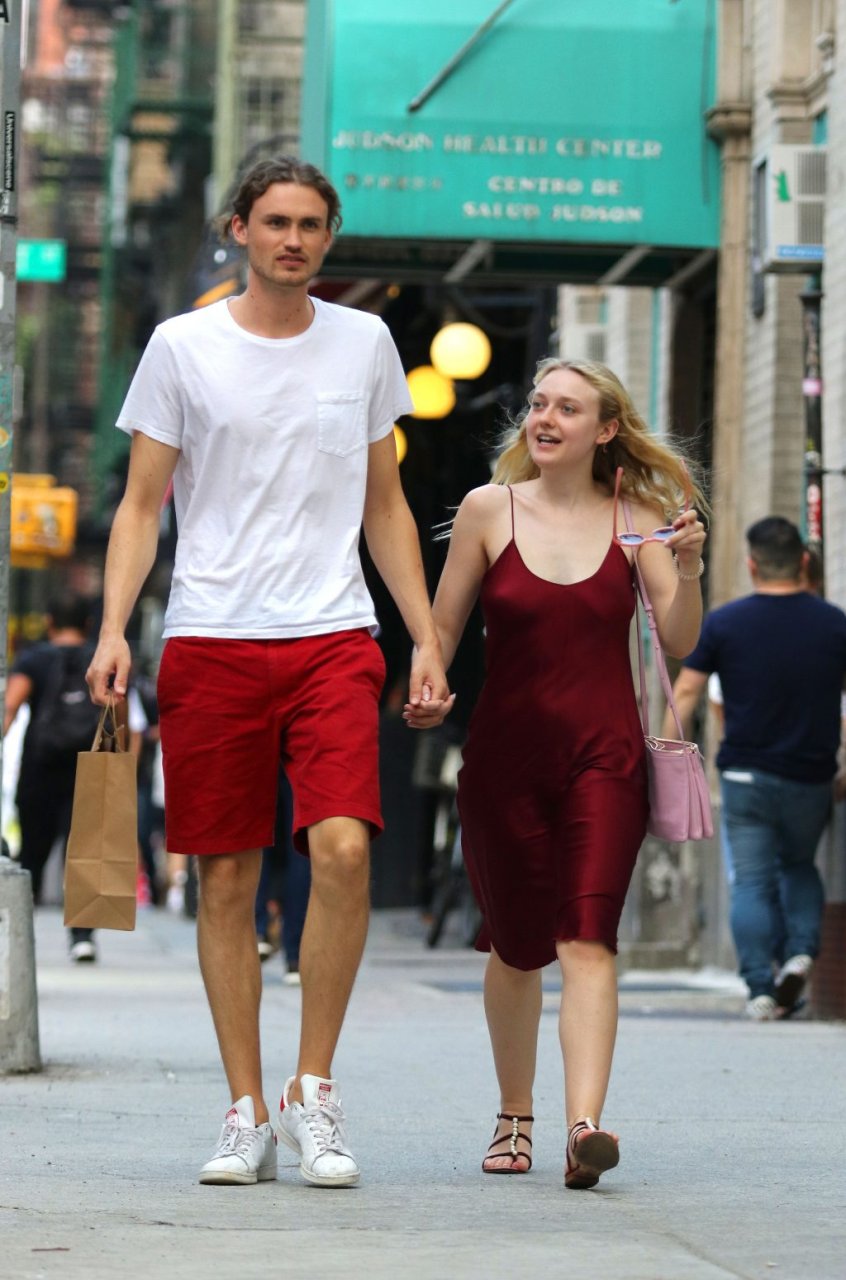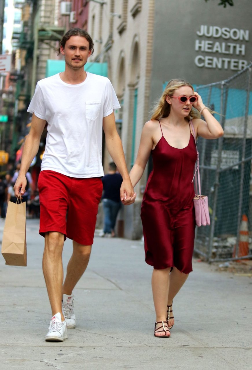 Actriz Dakota Fanning y su novio Henry Frye se toman de la mano mientras pasean románticamente después de cenar en el barrio Soho de Manhattan, 27/08/2018.