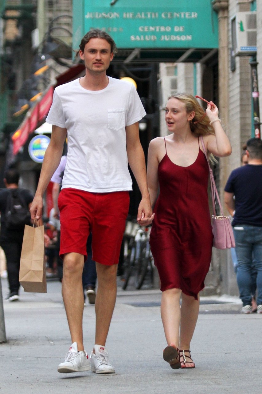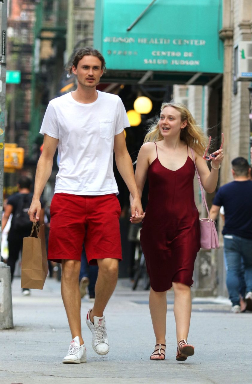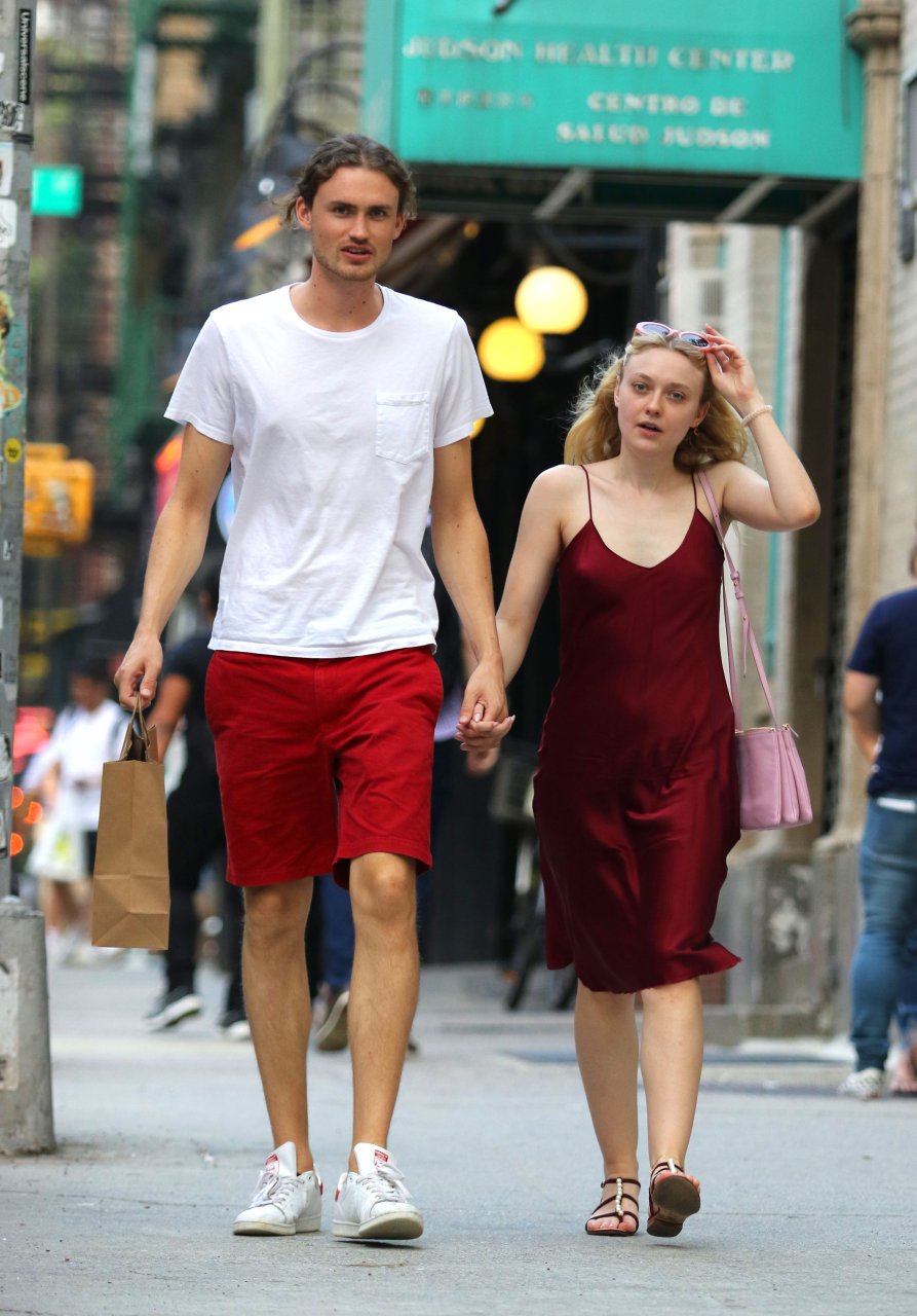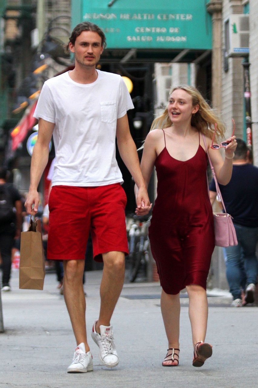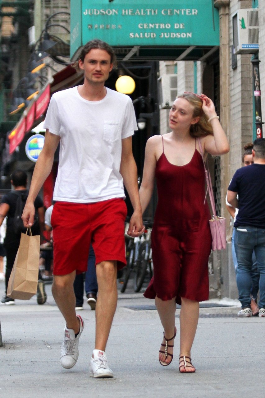 Actriz Dakota Fanning y su novio Henry Frye se toman de la mano mientras pasean románticamente después de cenar en el barrio Soho de Manhattan, 27/08/2018.