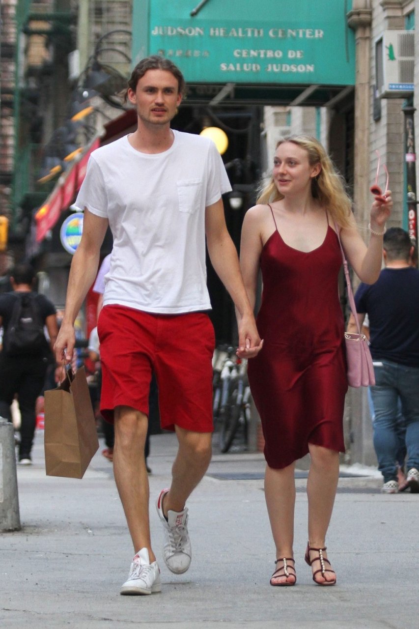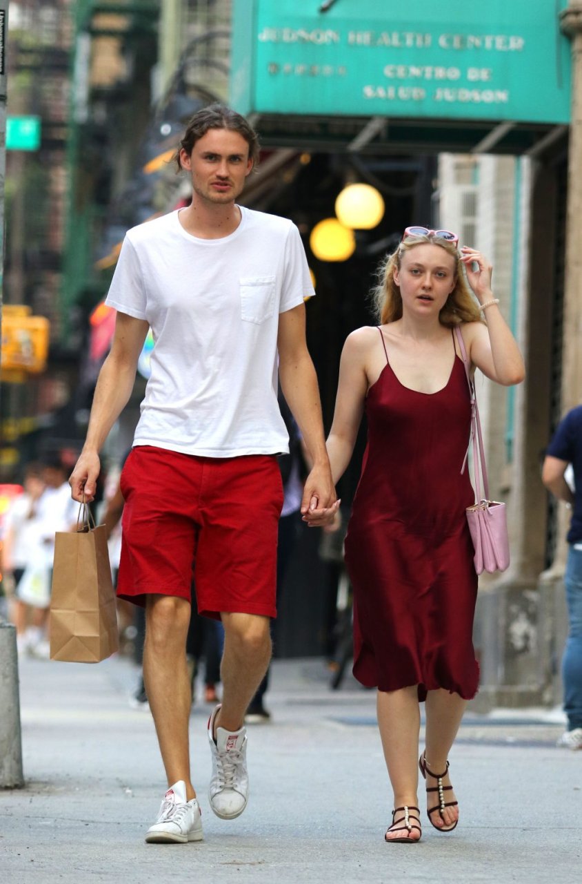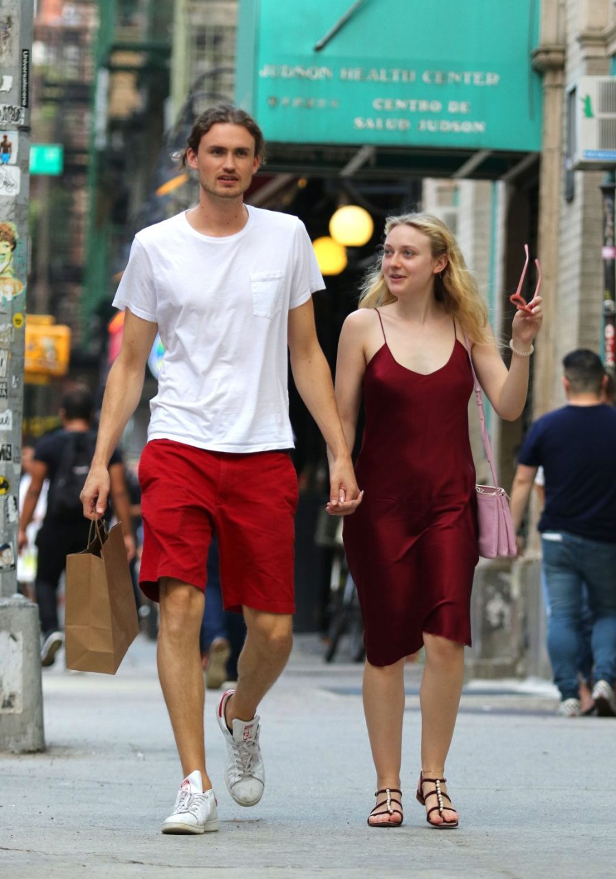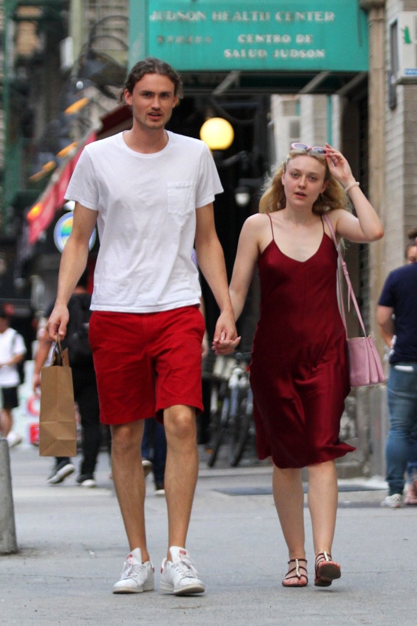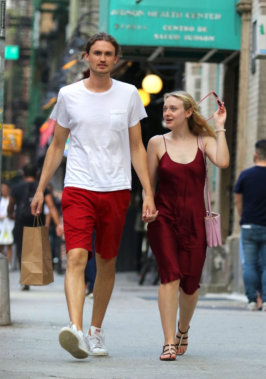 Actriz Dakota Fanning y su novio Henry Frye se toman de la mano mientras pasean románticamente después de cenar en el barrio Soho de Manhattan, 27/08/2018.
