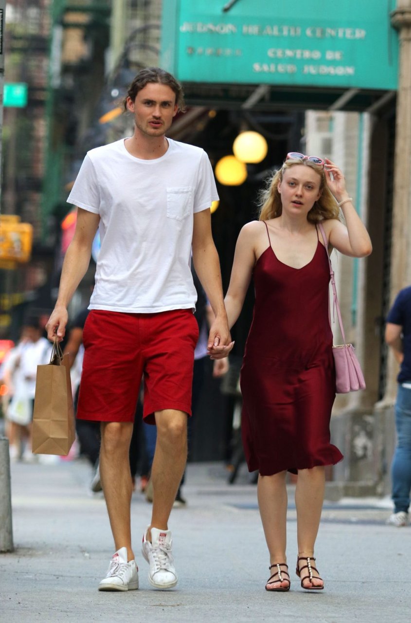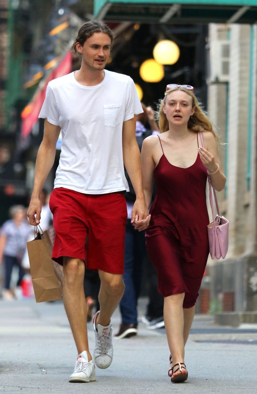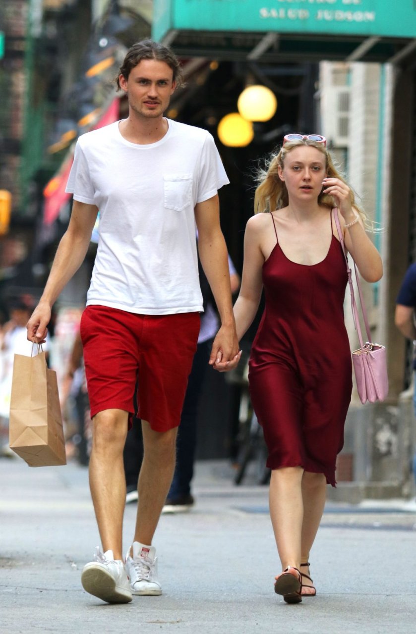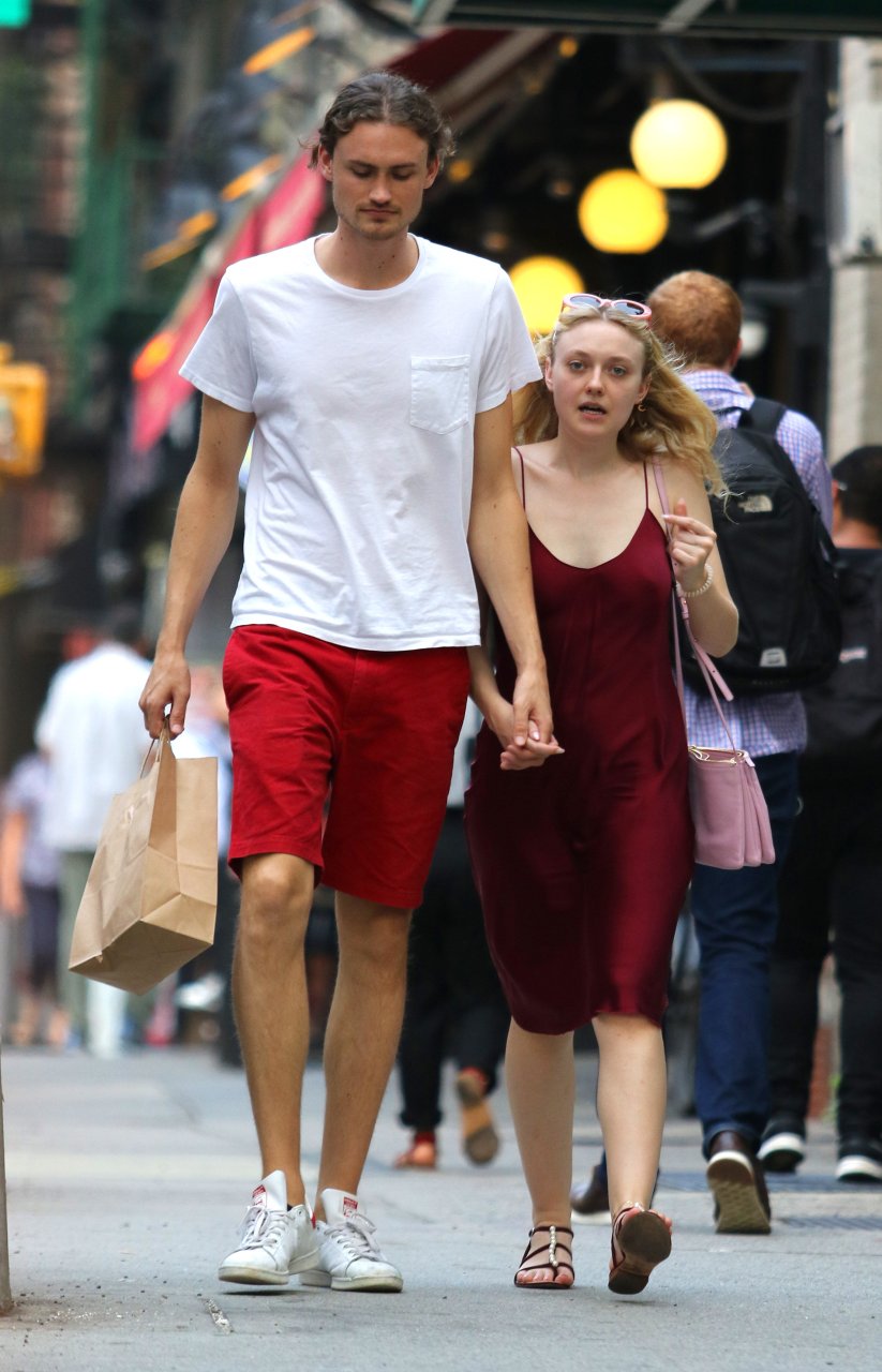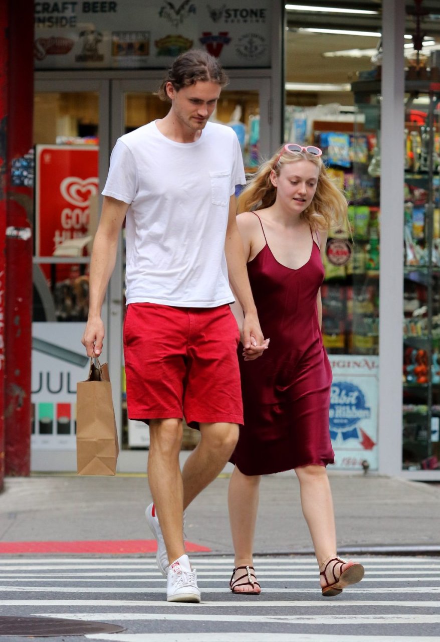 Actriz Dakota Fanning y su novio Henry Frye se toman de la mano mientras pasean románticamente después de cenar en el barrio Soho de Manhattan, 27/08/2018.