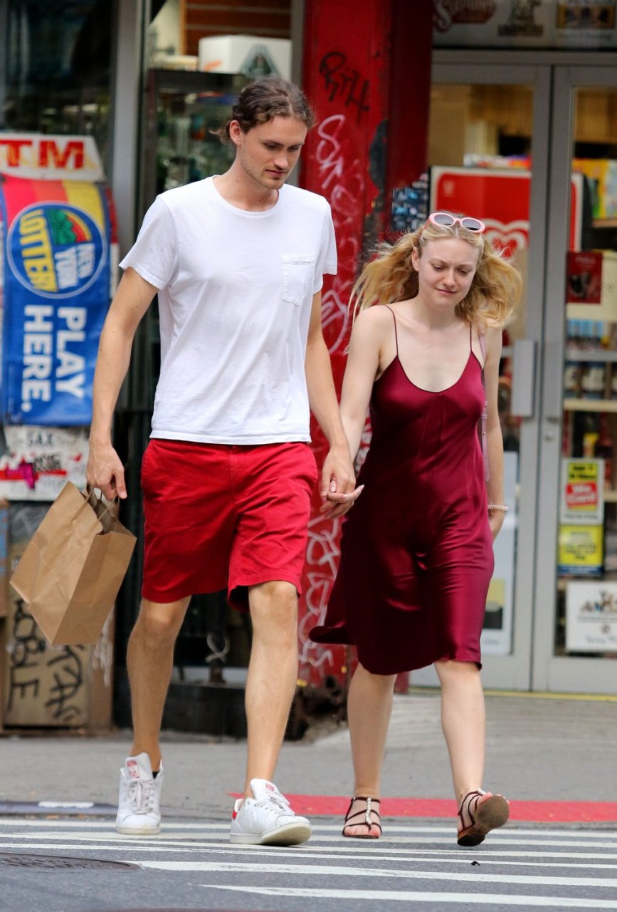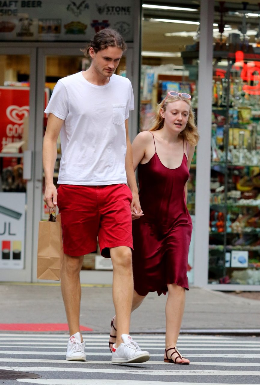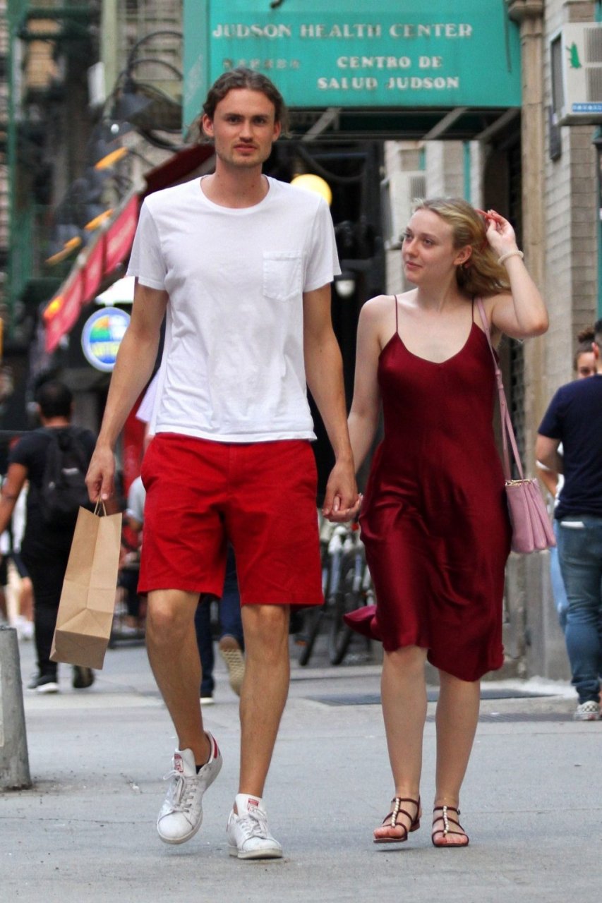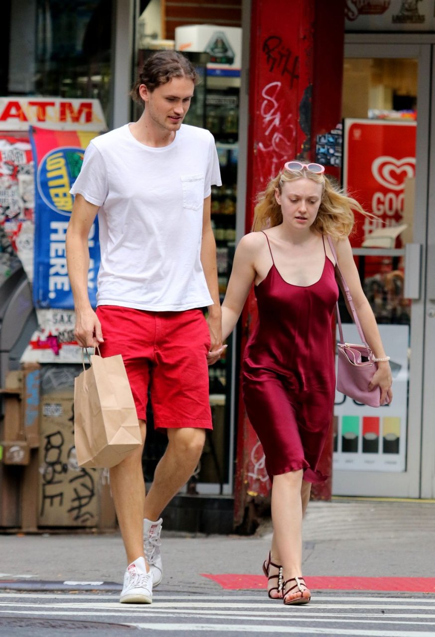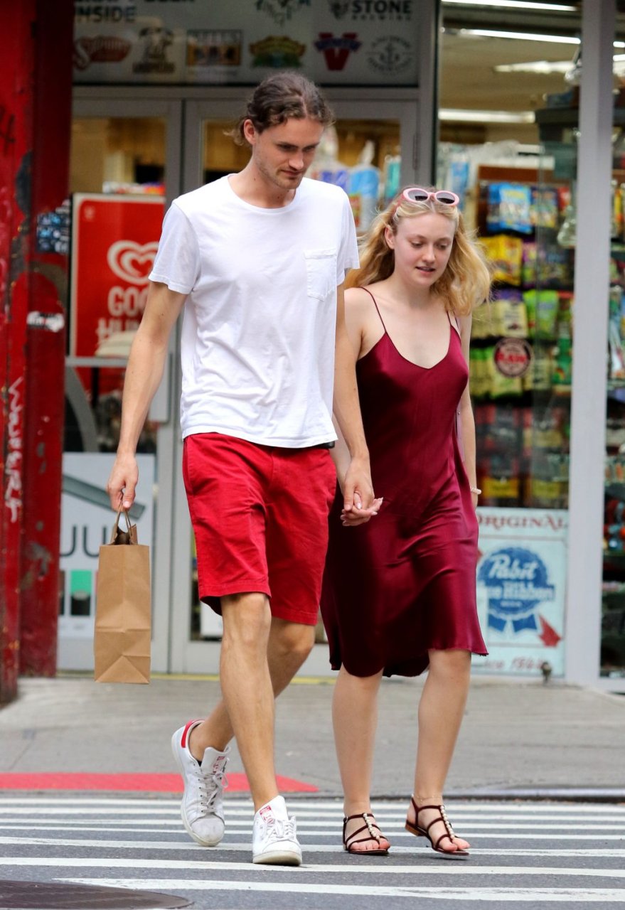 Actriz Dakota Fanning y su novio Henry Frye se toman de la mano mientras pasean románticamente después de cenar en el barrio Soho de Manhattan, 27/08/2018.