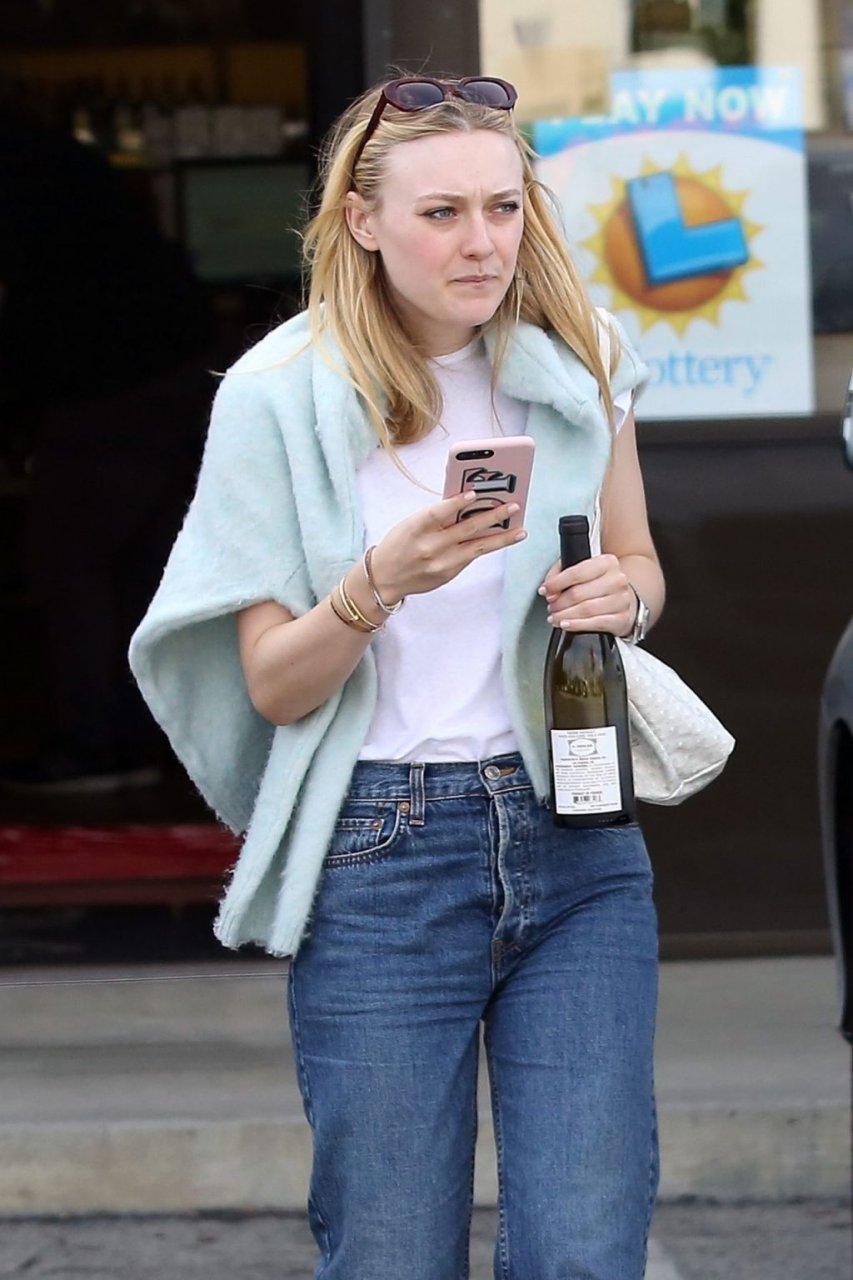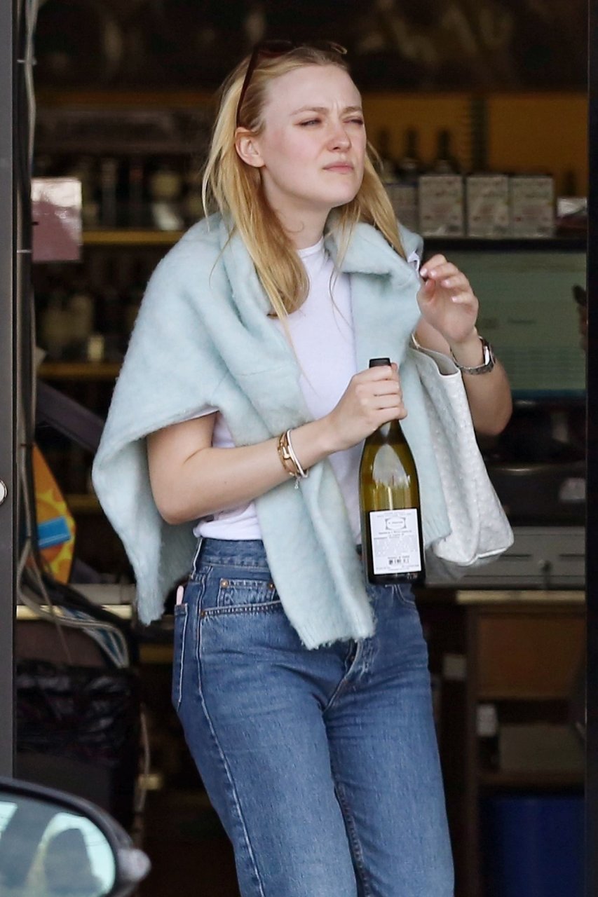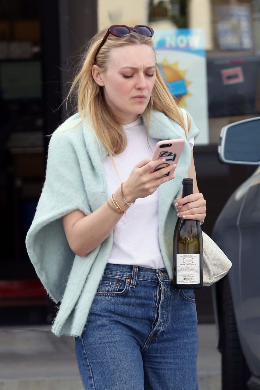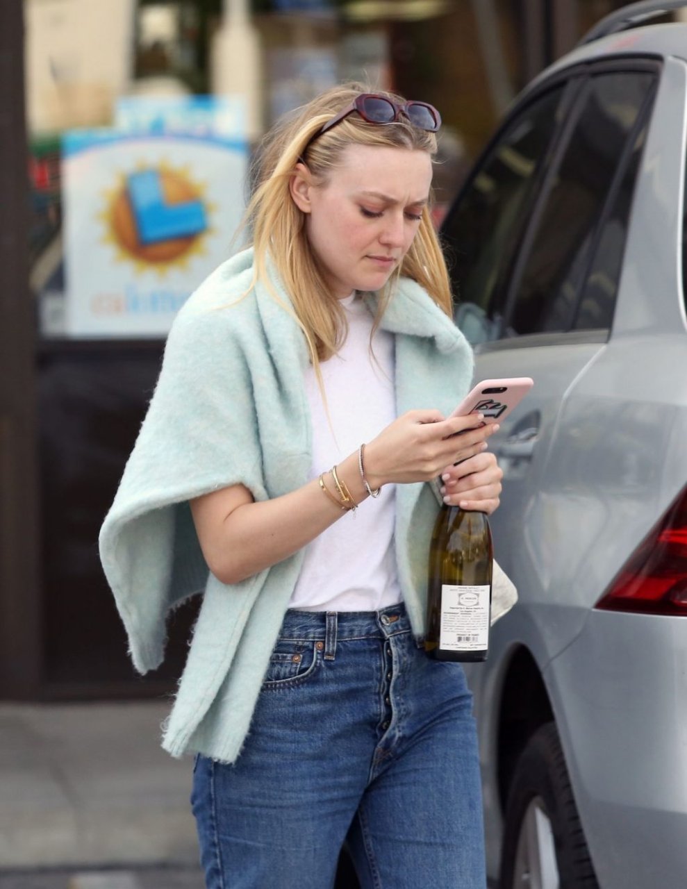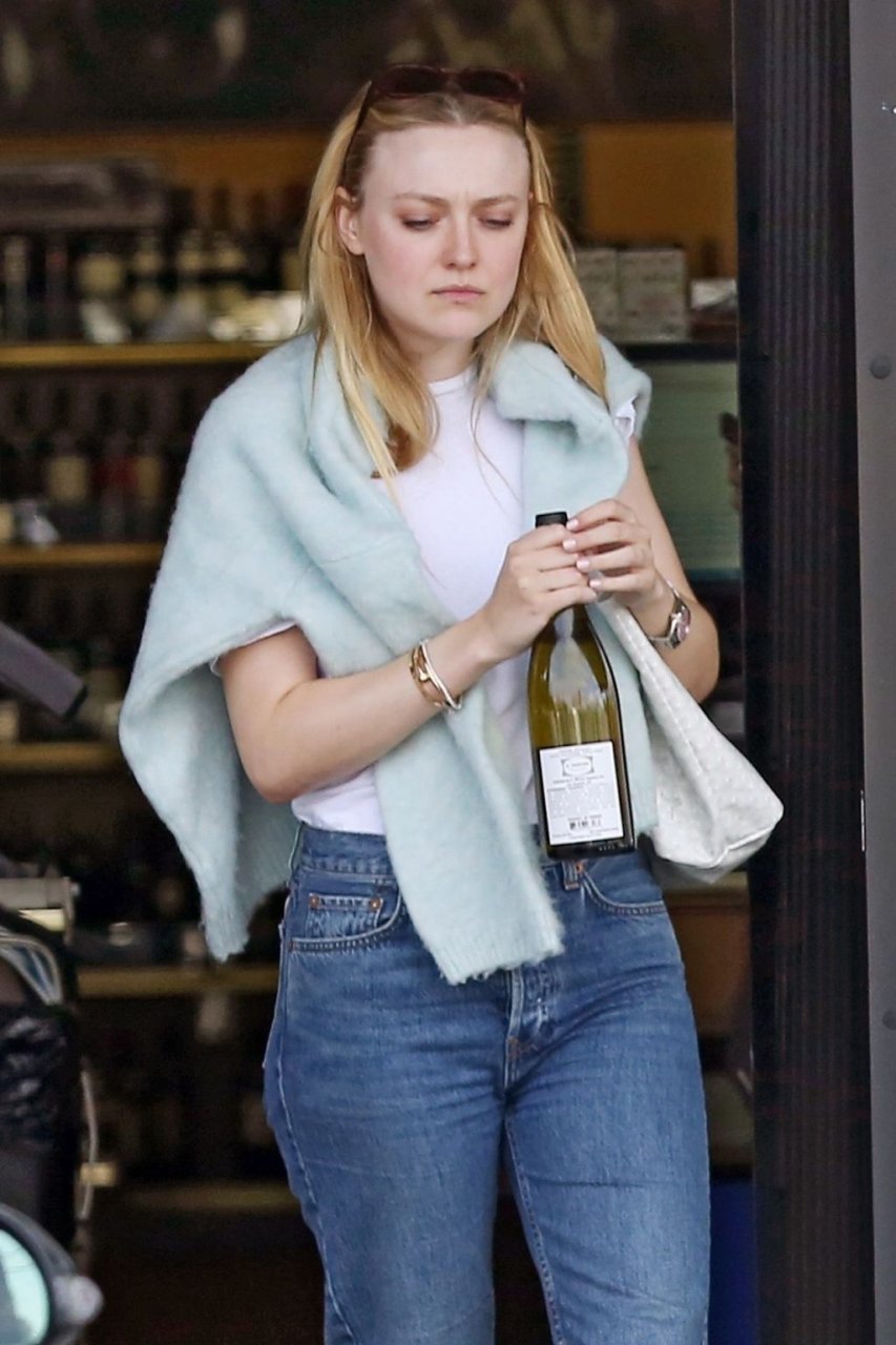 La actriz Dakota Fanning es vista con un contratista en una propiedad inmobiliaria en Toluca Lake, 03/04/2019. La actriz se detiene para tomar un poco de vino antes de regresar a casa. ¿Quizás un brindis de celebración es apropiado?