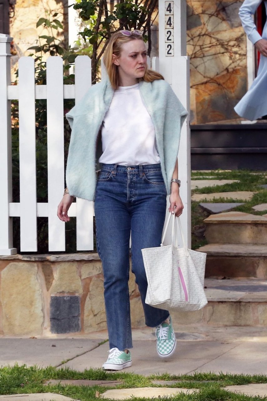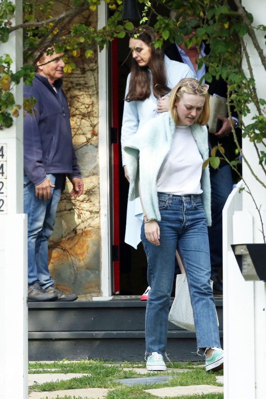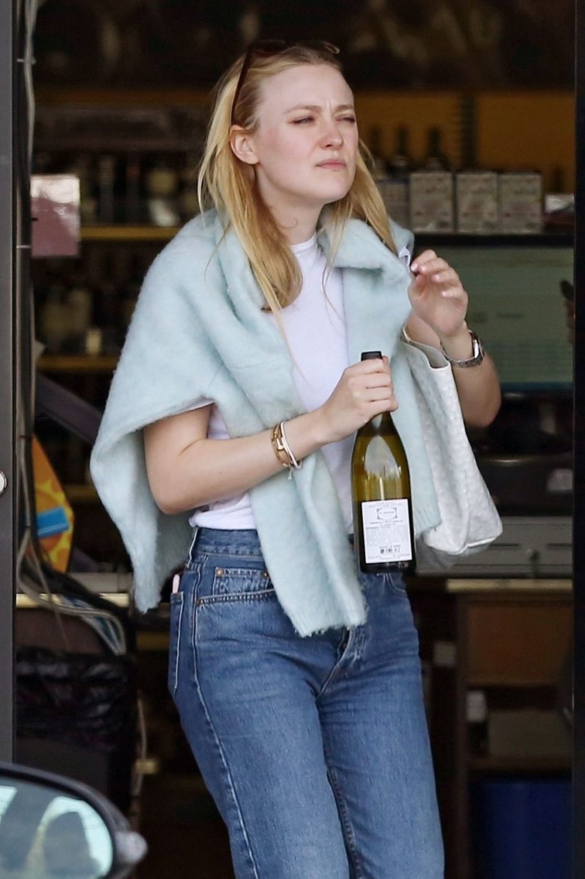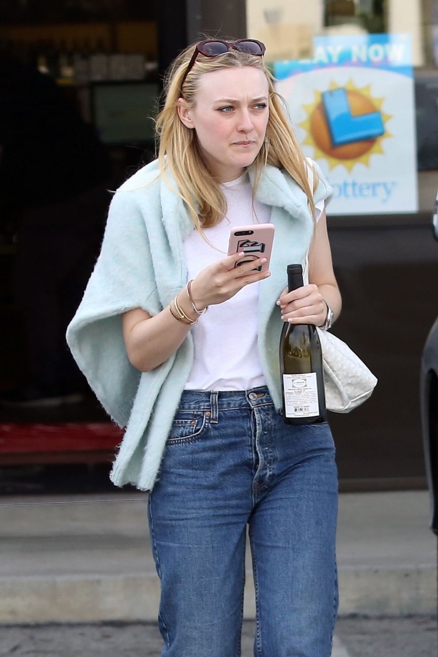 La actriz Dakota Fanning es vista con un contratista en una propiedad inmobiliaria en Toluca Lake, 03/04/2019. La actriz se detiene para tomar un poco de vino antes de regresar a casa. ¿Quizás un brindis de celebración es apropiado?