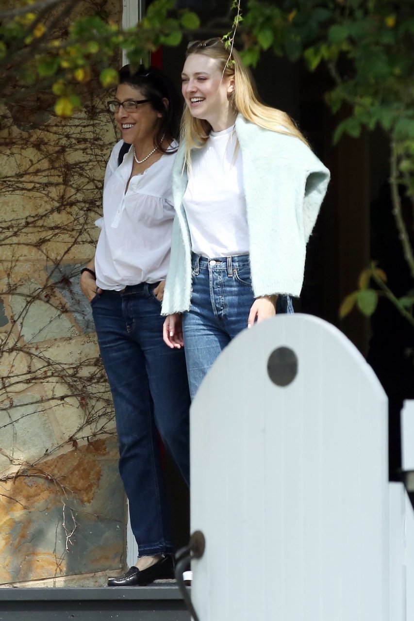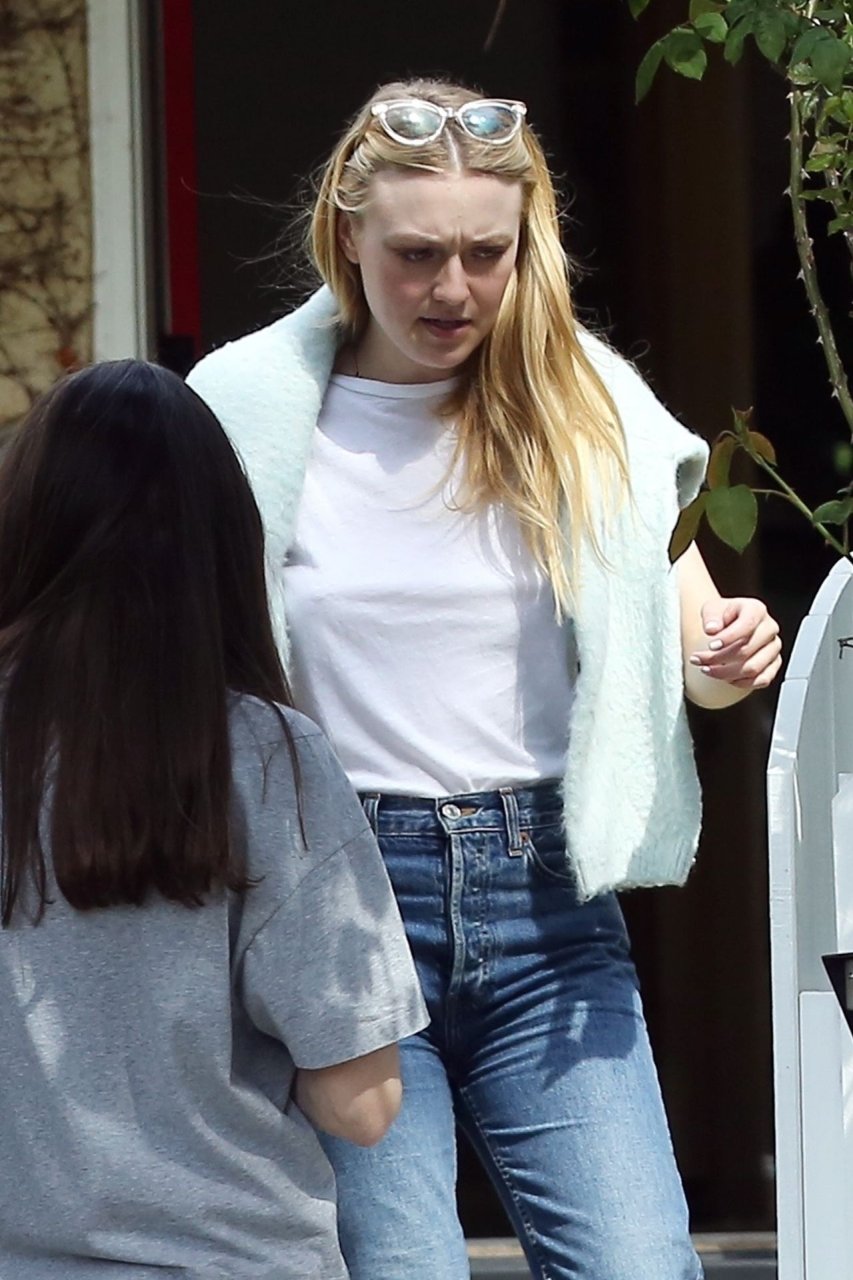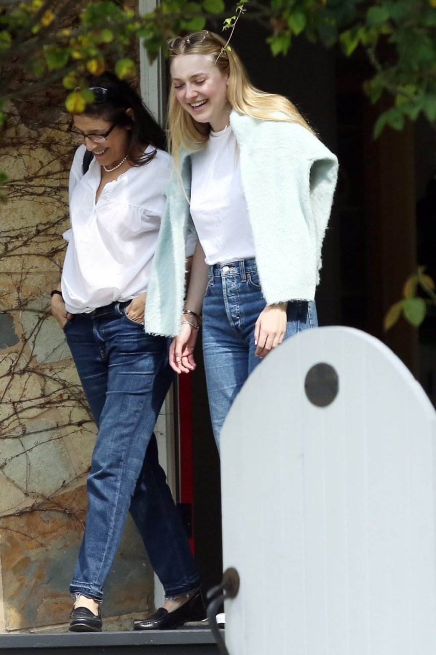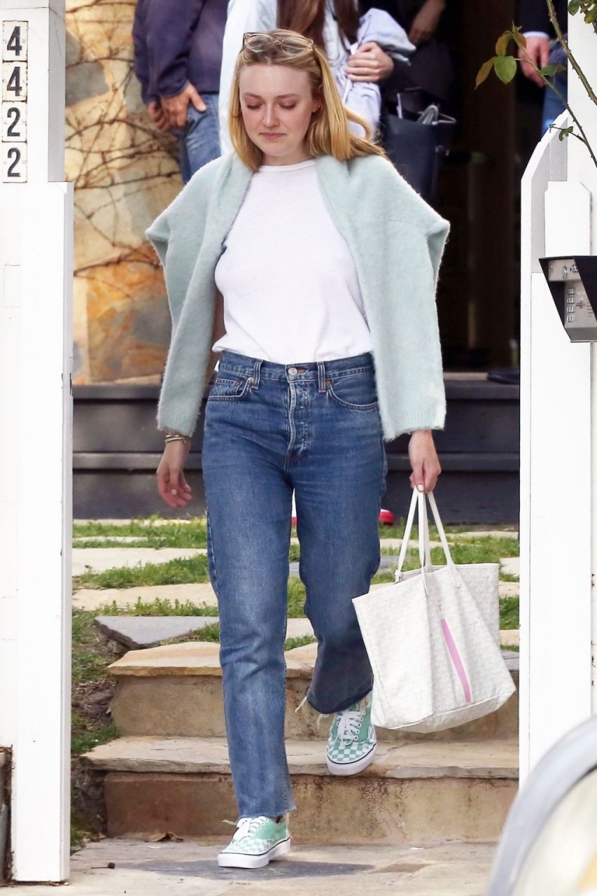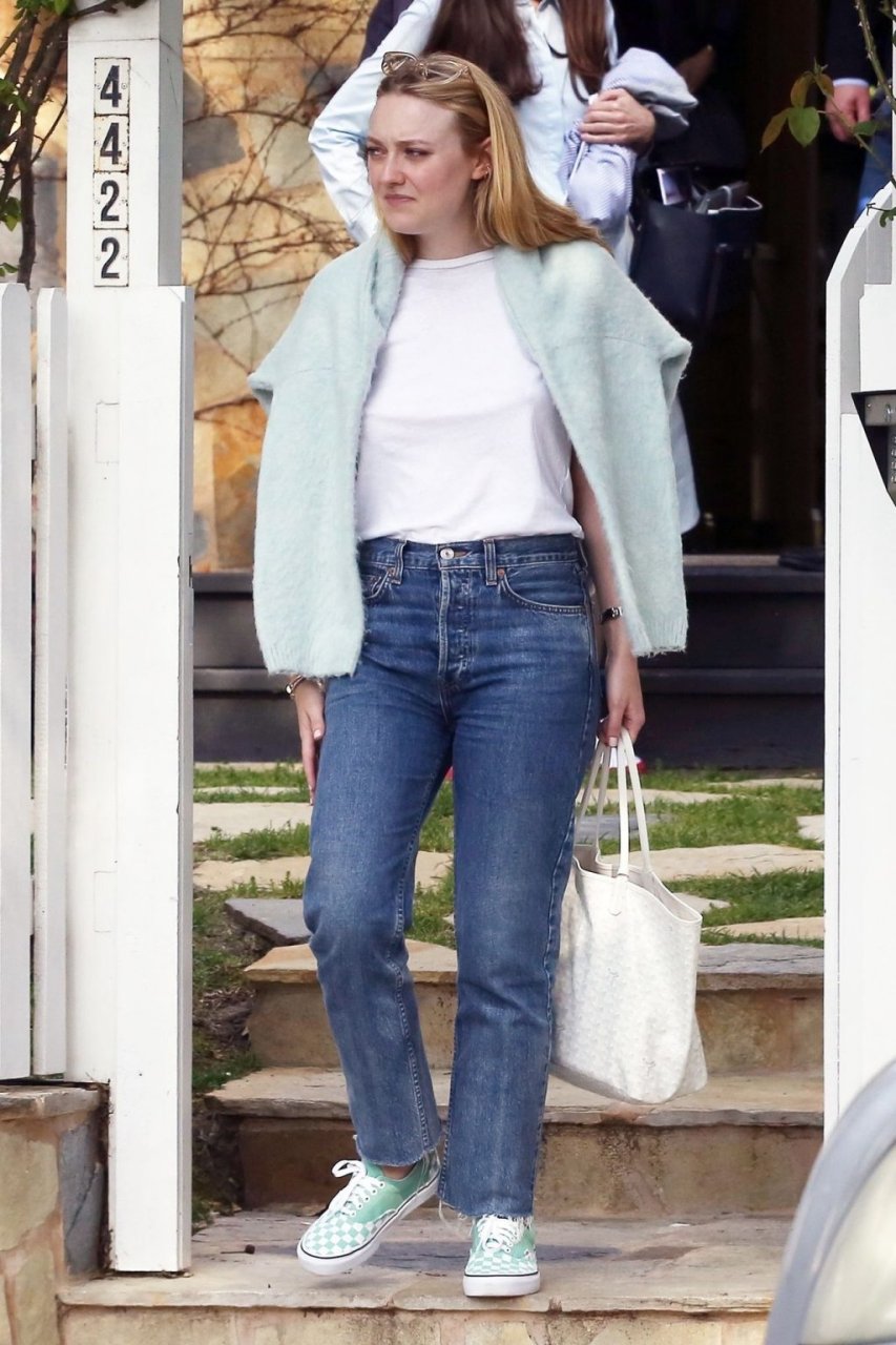 La actriz Dakota Fanning es vista con un contratista en una propiedad inmobiliaria en Toluca Lake, 03/04/2019. La actriz se detiene para tomar un poco de vino antes de regresar a casa. ¿Quizás un brindis de celebración es apropiado?