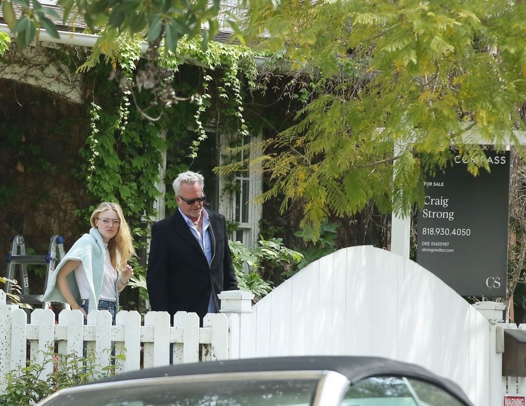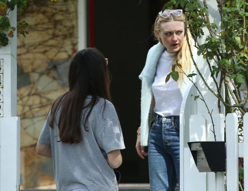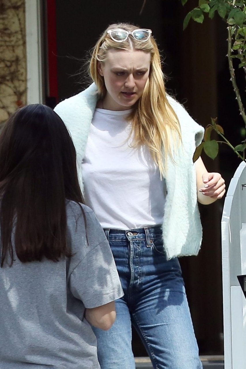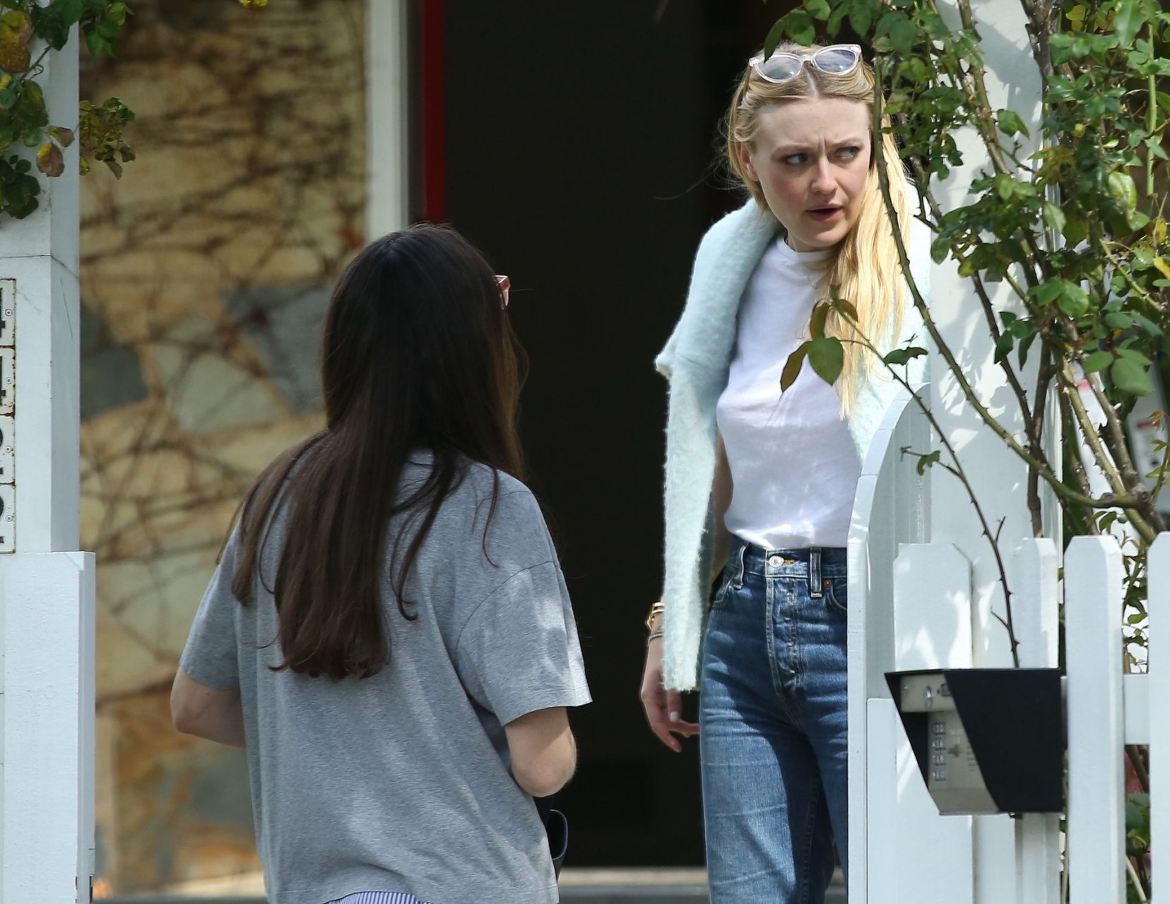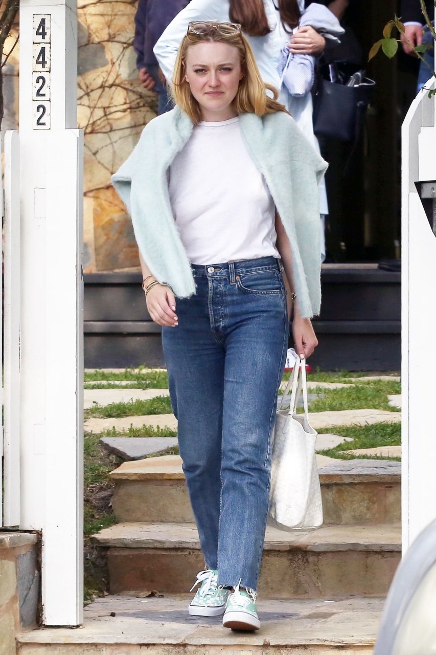 La actriz Dakota Fanning es vista con un contratista en una propiedad inmobiliaria en Toluca Lake, 03/04/2019. La actriz se detiene para tomar un poco de vino antes de regresar a casa. ¿Quizás un brindis de celebración es apropiado?