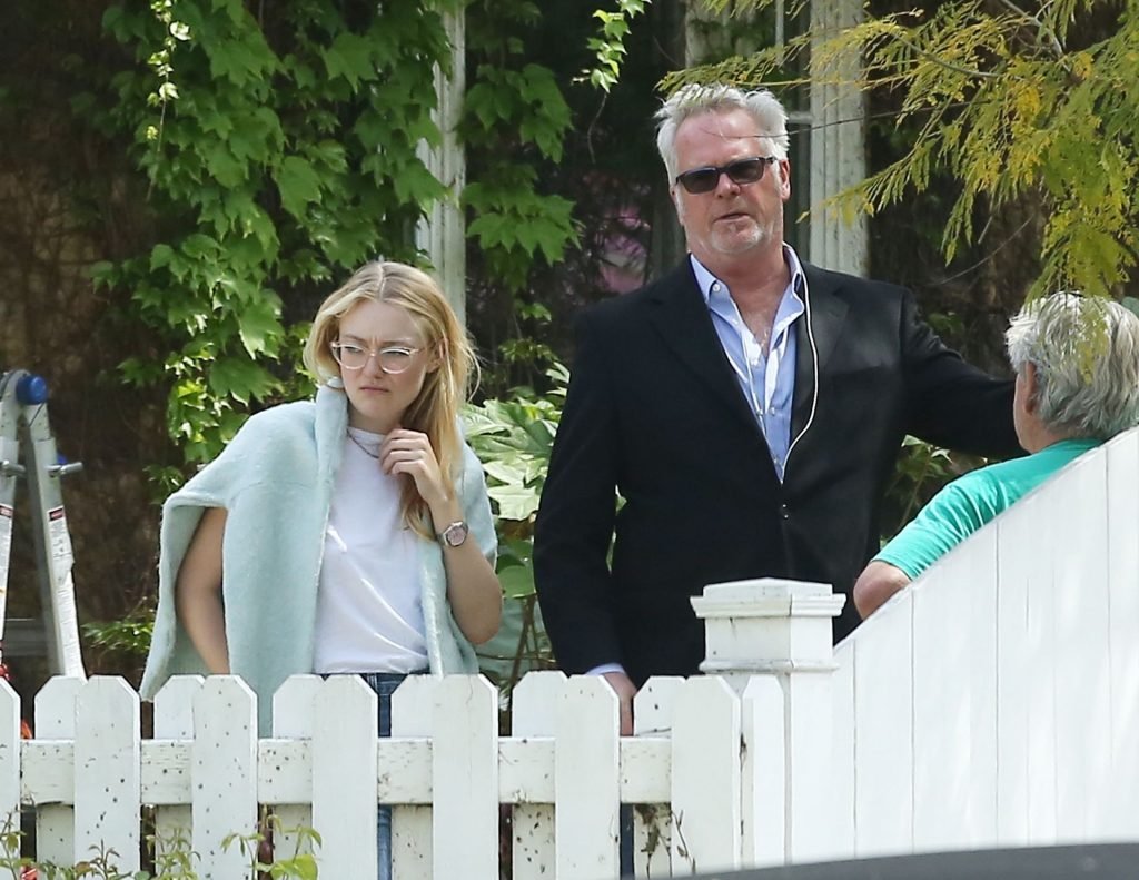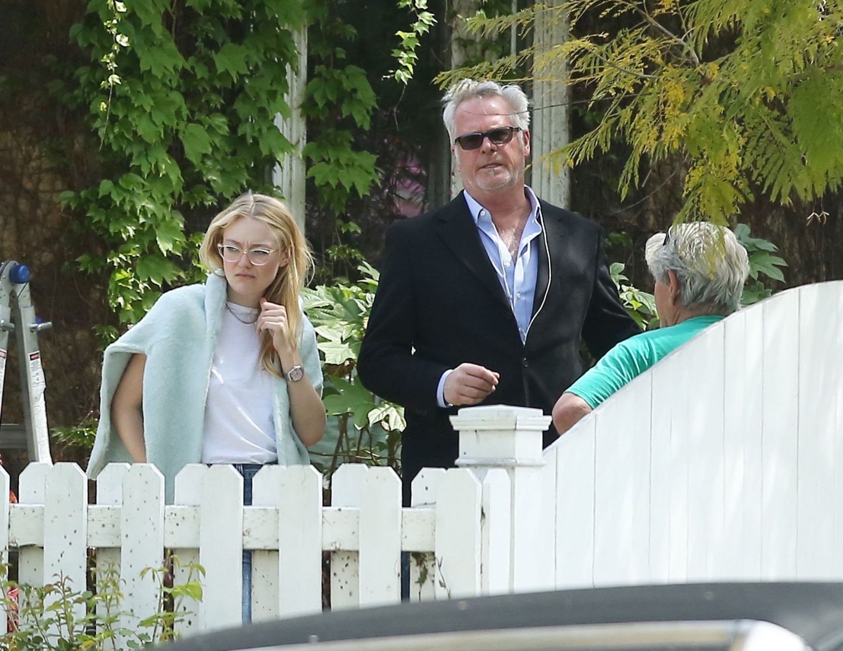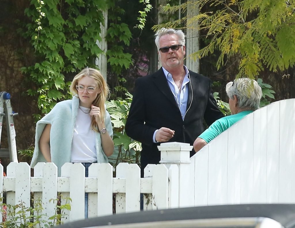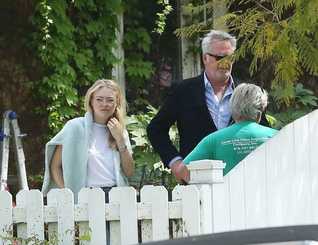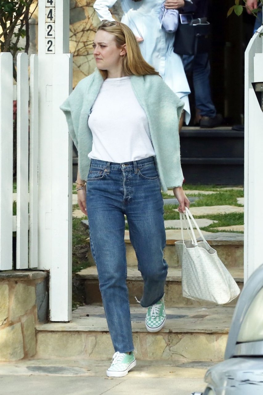La actriz Dakota Fanning es vista con un contratista en una propiedad inmobiliaria en Toluca Lake, 03/04/2019. La actriz se detiene para tomar un poco de vino antes de regresar a casa. ¿Quizás un brindis de celebración es apropiado?