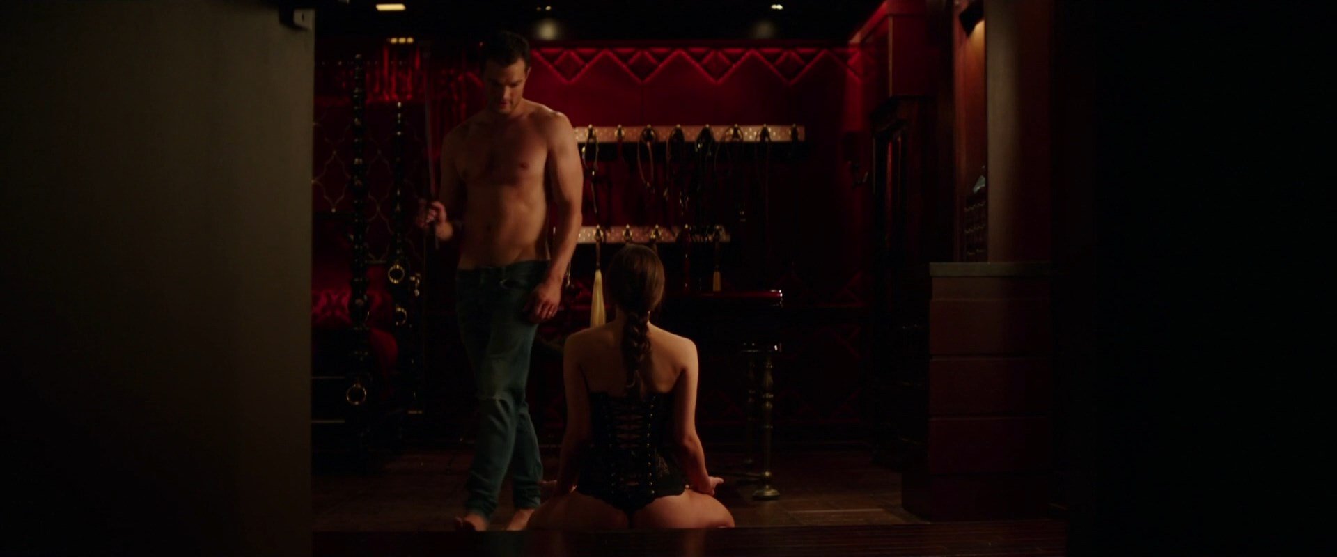 Dakota se quita la ropa hasta quedar en panties caminando hacia la ducha y vemos sus pechos. Vemos sus glúteos en la ducha después de que Dornan se va.