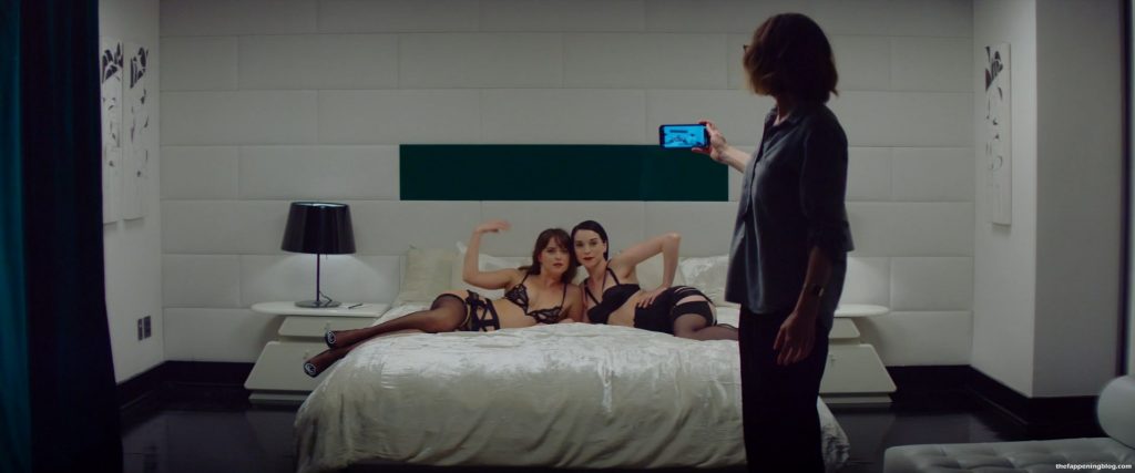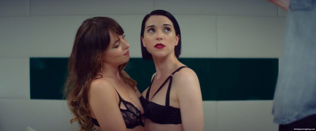 Dakota Johnson está acostada en una cama con lencería sexy mientras la acompaña la música St. Vincent (también conocida como Annie Clark), que lleva una lencería similar. Luego, las chicas adoptan una pose sexy para que alguien les grabe un video. Dakota y St. Vincent se arrodillan frente a frente, mostrando escote mientras se presionan una contra la otra. Finalmente, vemos a las chicas acostadas de lado con sus espaldas tocándose, Dakota mostrando un pastie en el pezón. Dakota está a la izquierda con el cabello más largo.