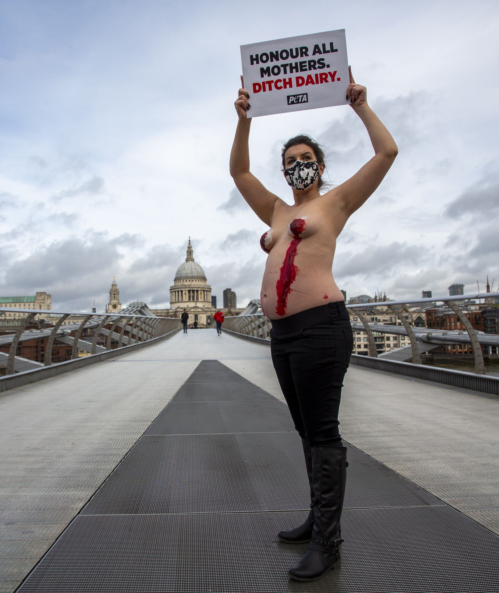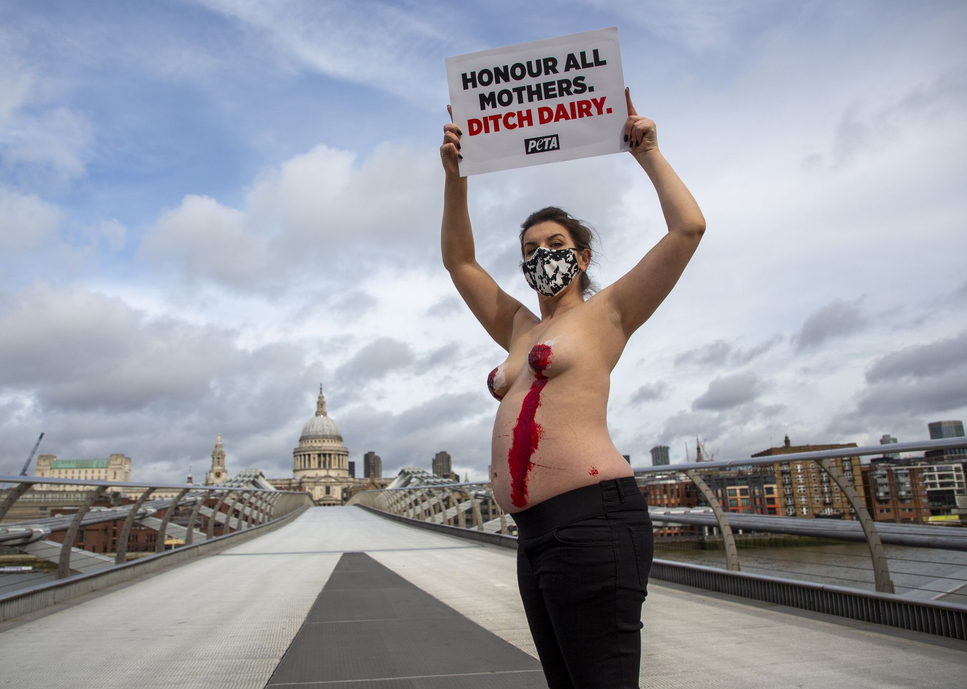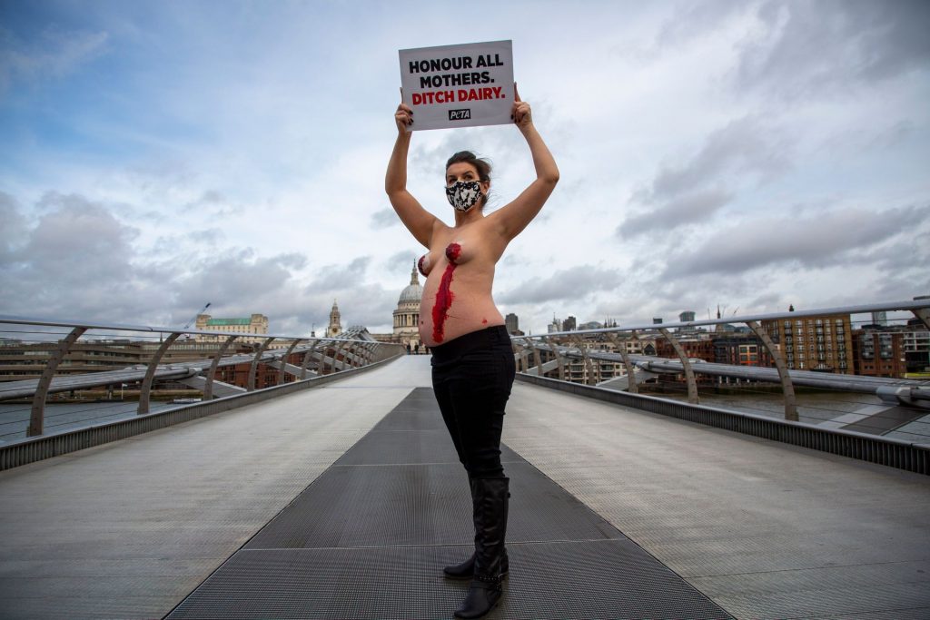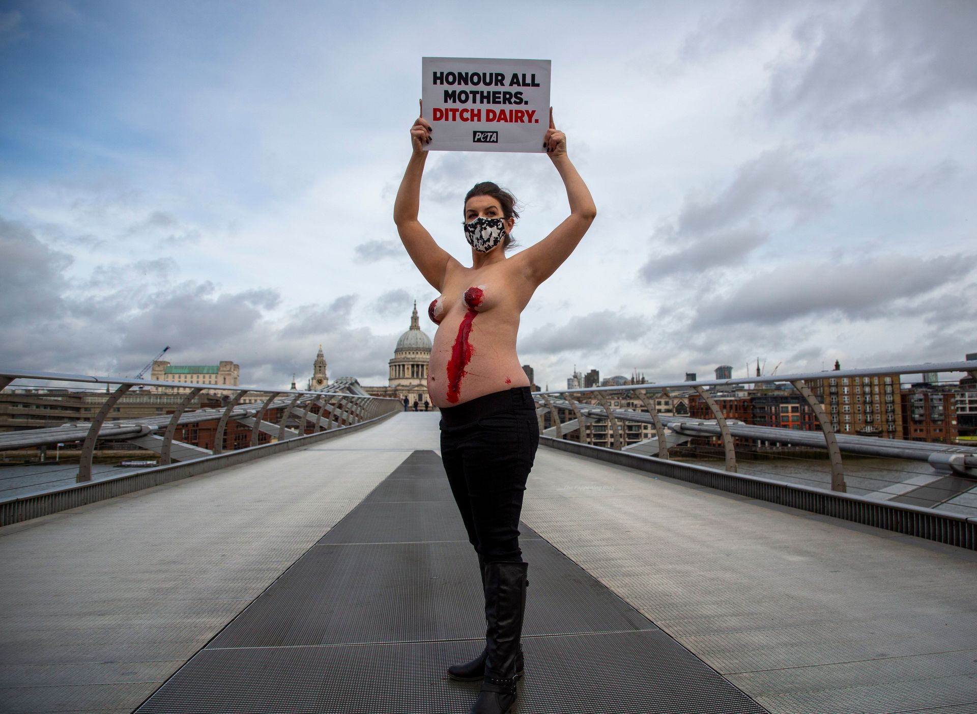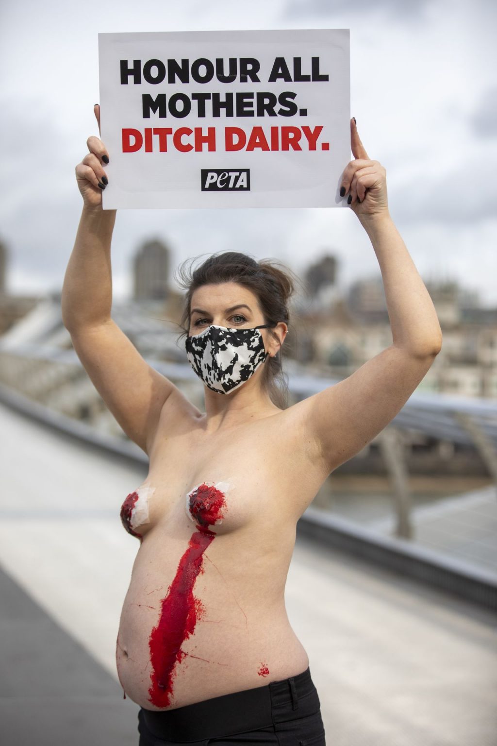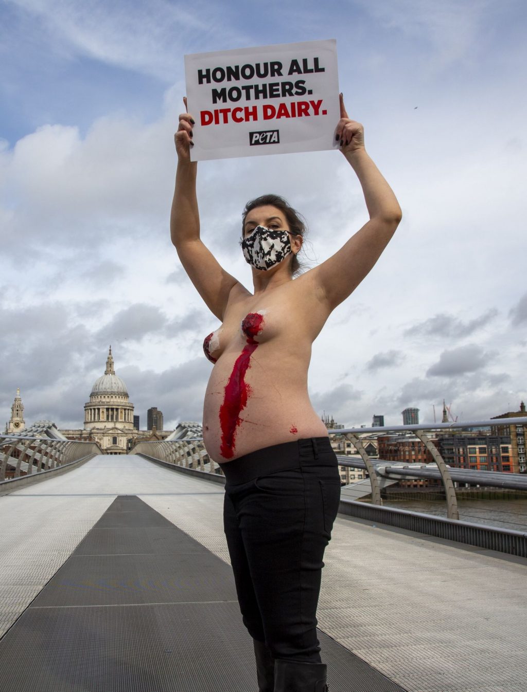 La futura madre Daniella Wood con pezones “sangrantes” participa en una sesión fotográfica de PETA en el Puente del Milenio de Londres para protestar contra la industria láctea en el Día de la Madre en Londres (2021).