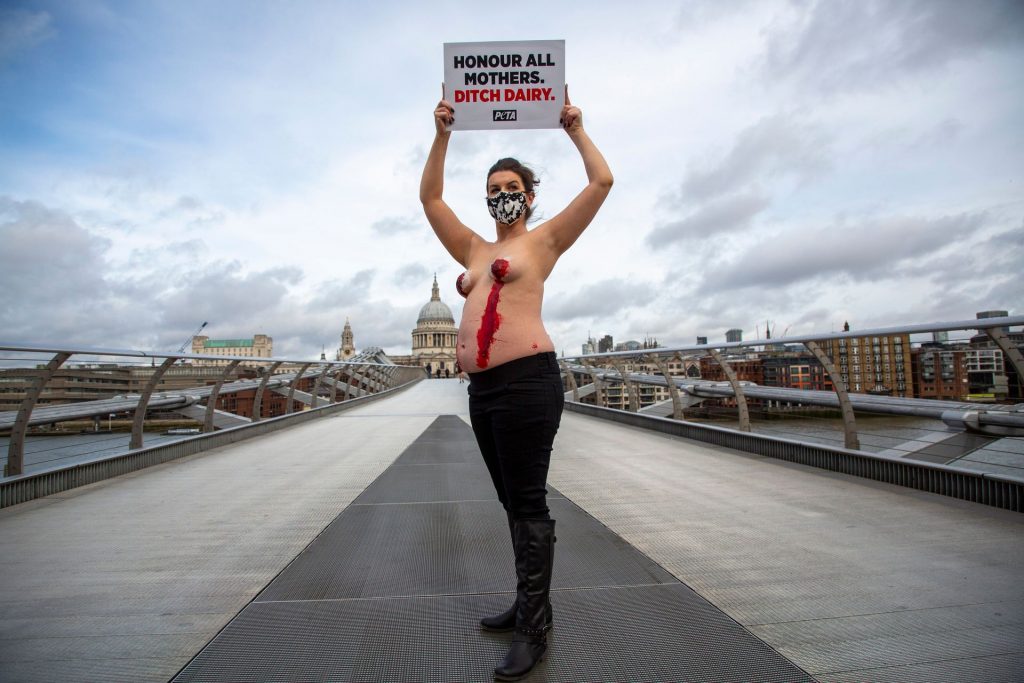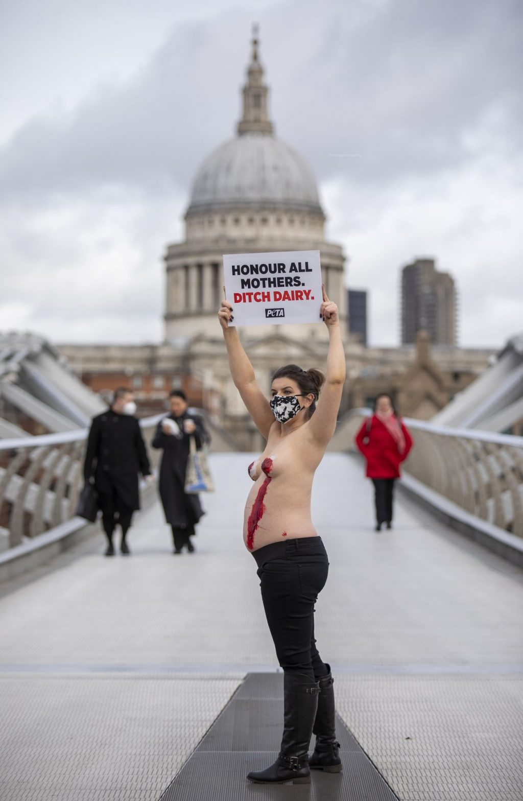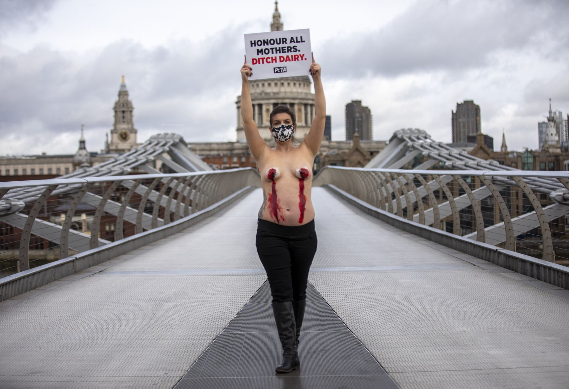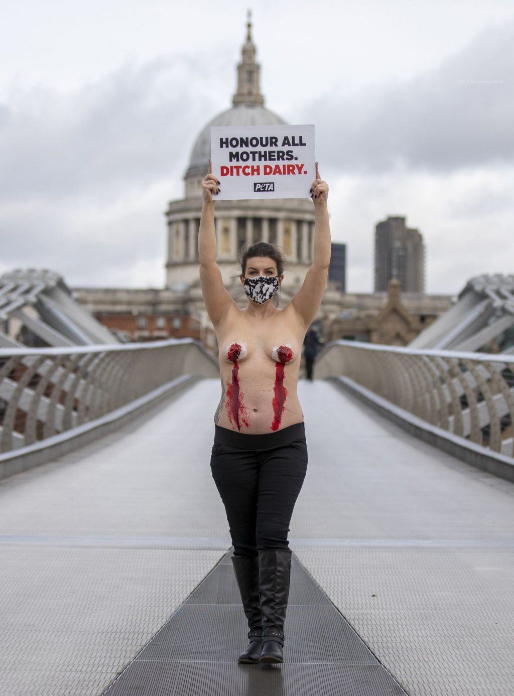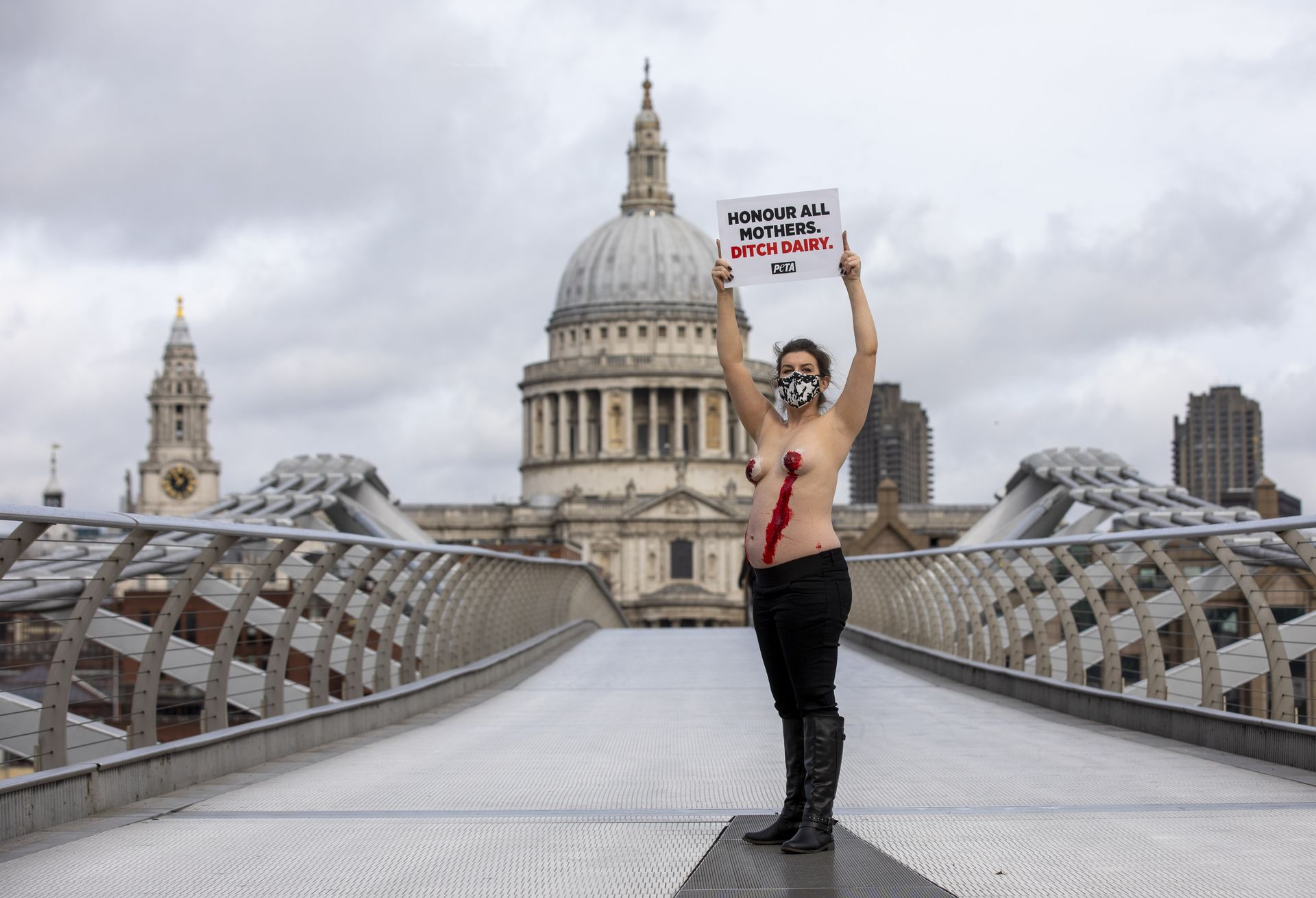 La futura madre Daniella Wood con pezones “sangrantes” participa en una sesión fotográfica de PETA en el Puente del Milenio de Londres para protestar contra la industria láctea en el Día de la Madre en Londres (2021).