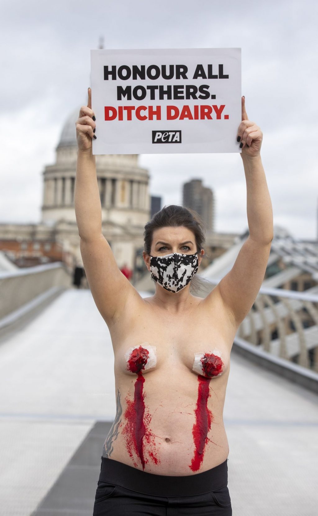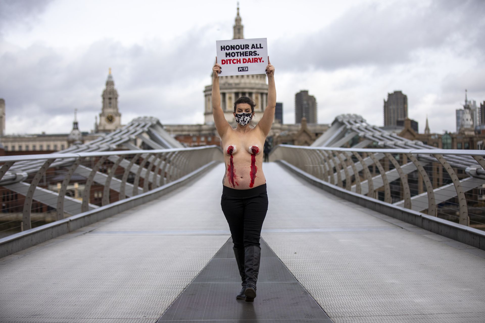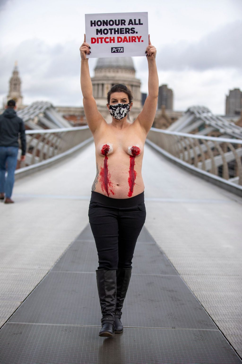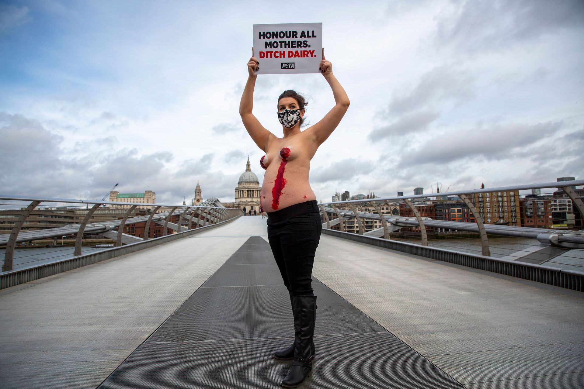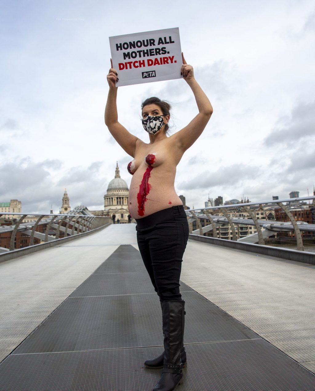 La futura madre Daniella Wood con pezones “sangrantes” participa en una sesión fotográfica de PETA en el Puente del Milenio de Londres para protestar contra la industria láctea en el Día de la Madre en Londres (2021).