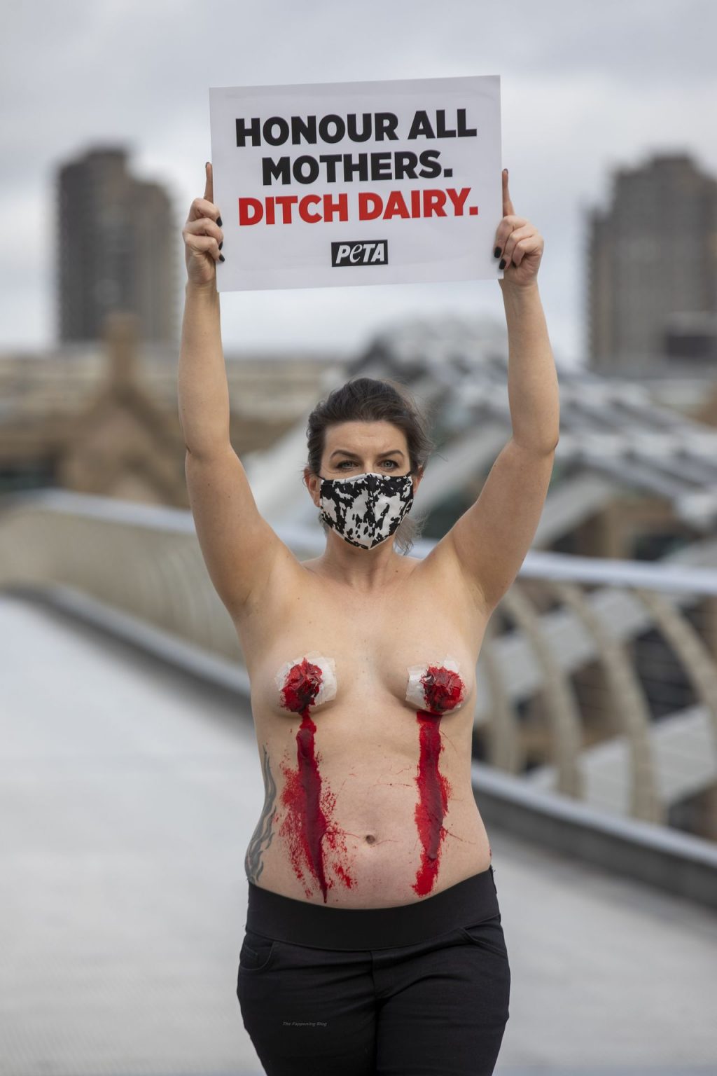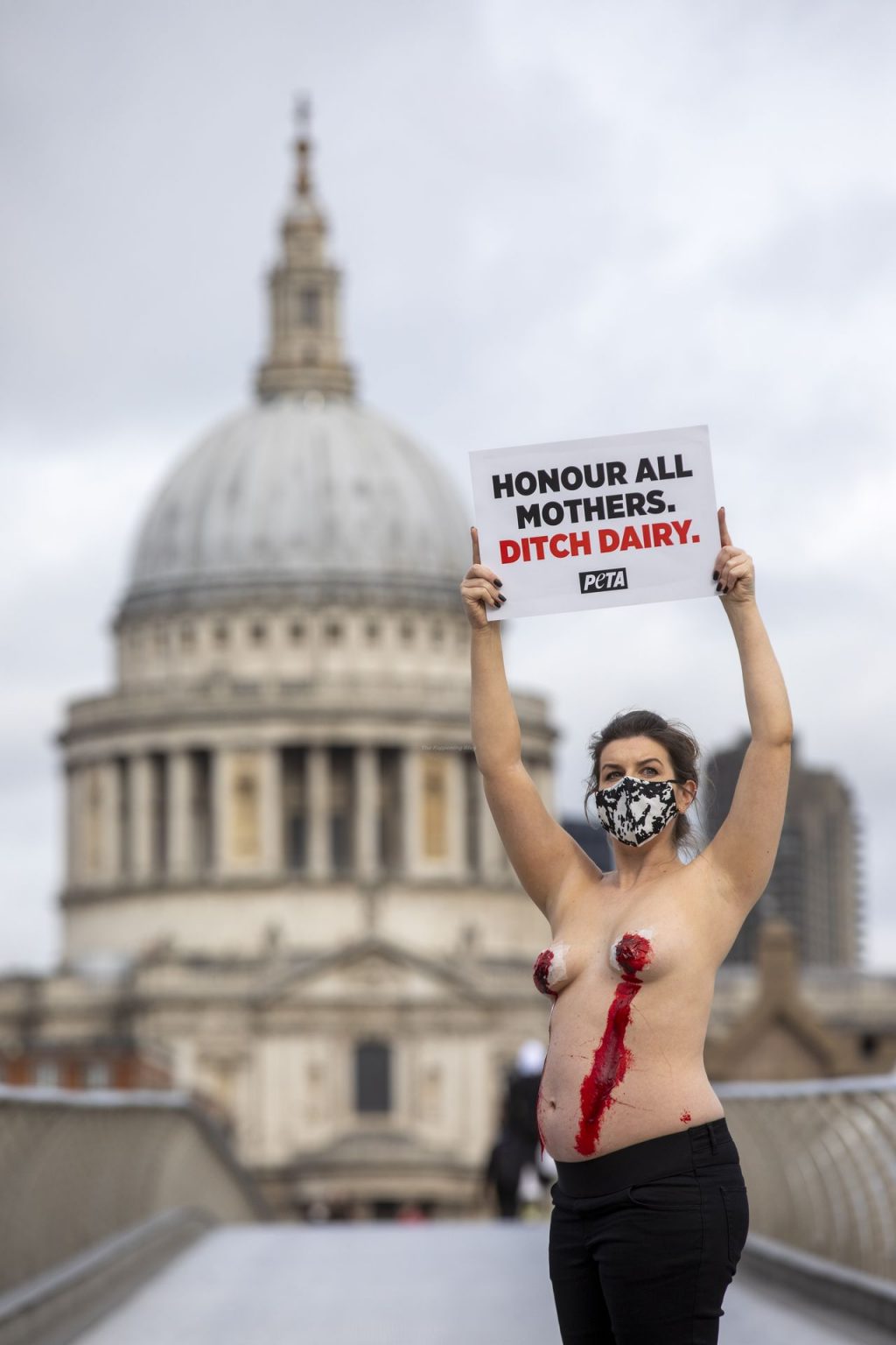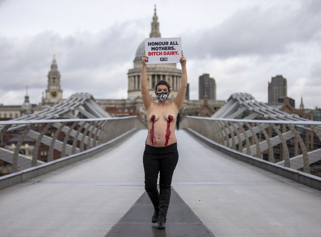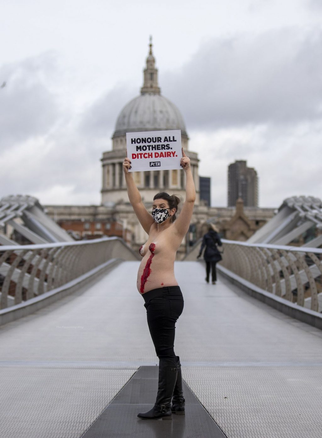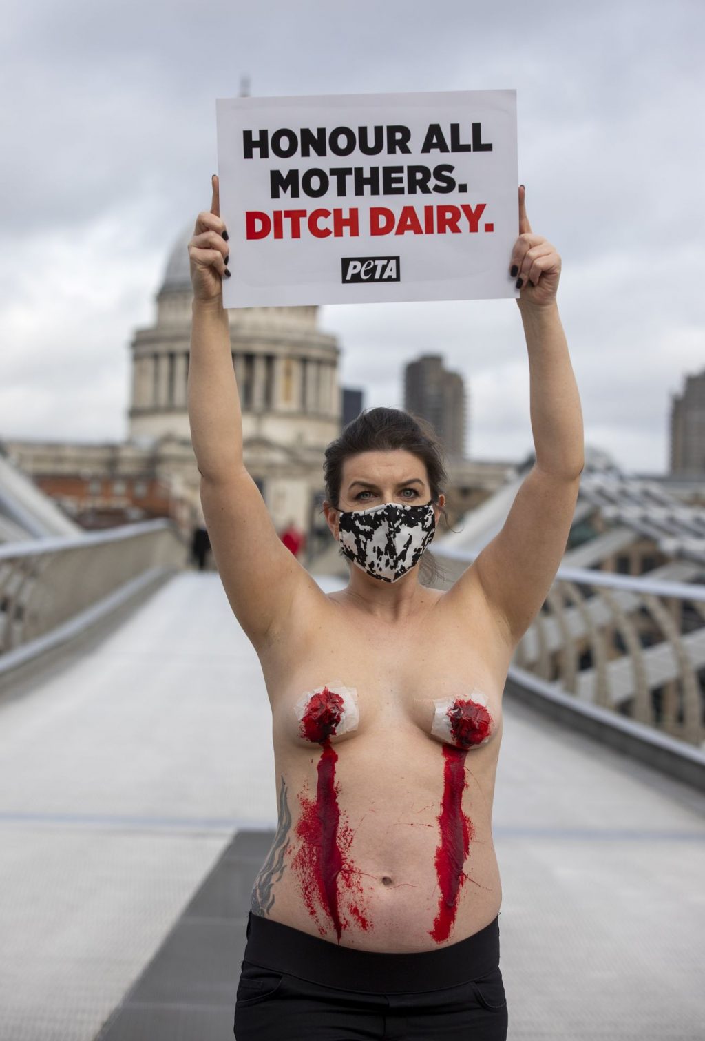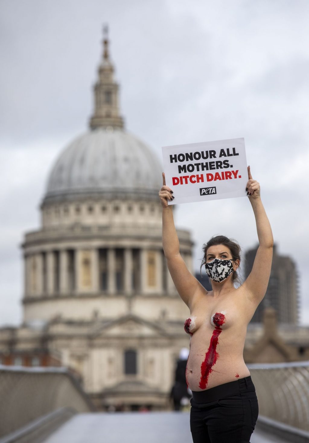 La futura madre Daniella Wood con pezones “sangrantes” participa en una sesión fotográfica de PETA en el Puente del Milenio de Londres para protestar contra la industria láctea en el Día de la Madre en Londres (2021).