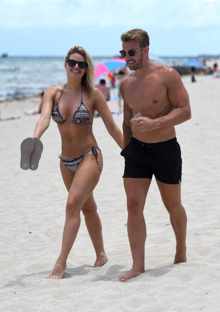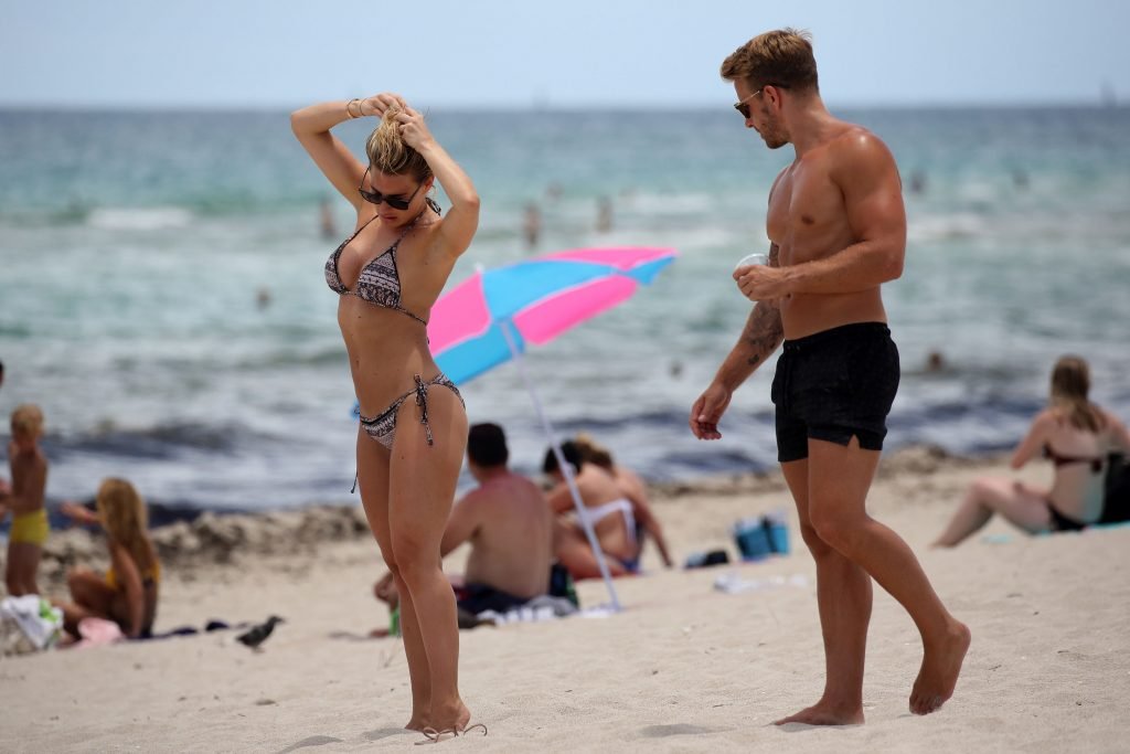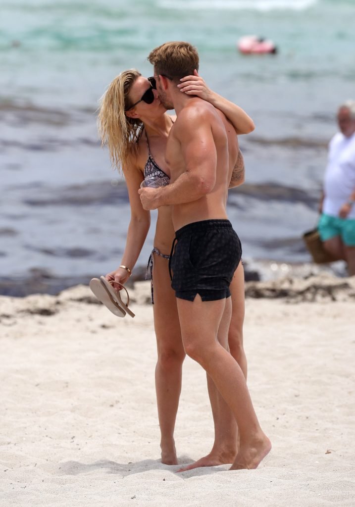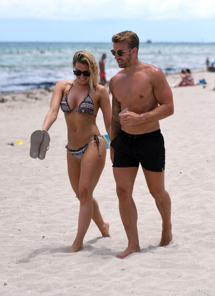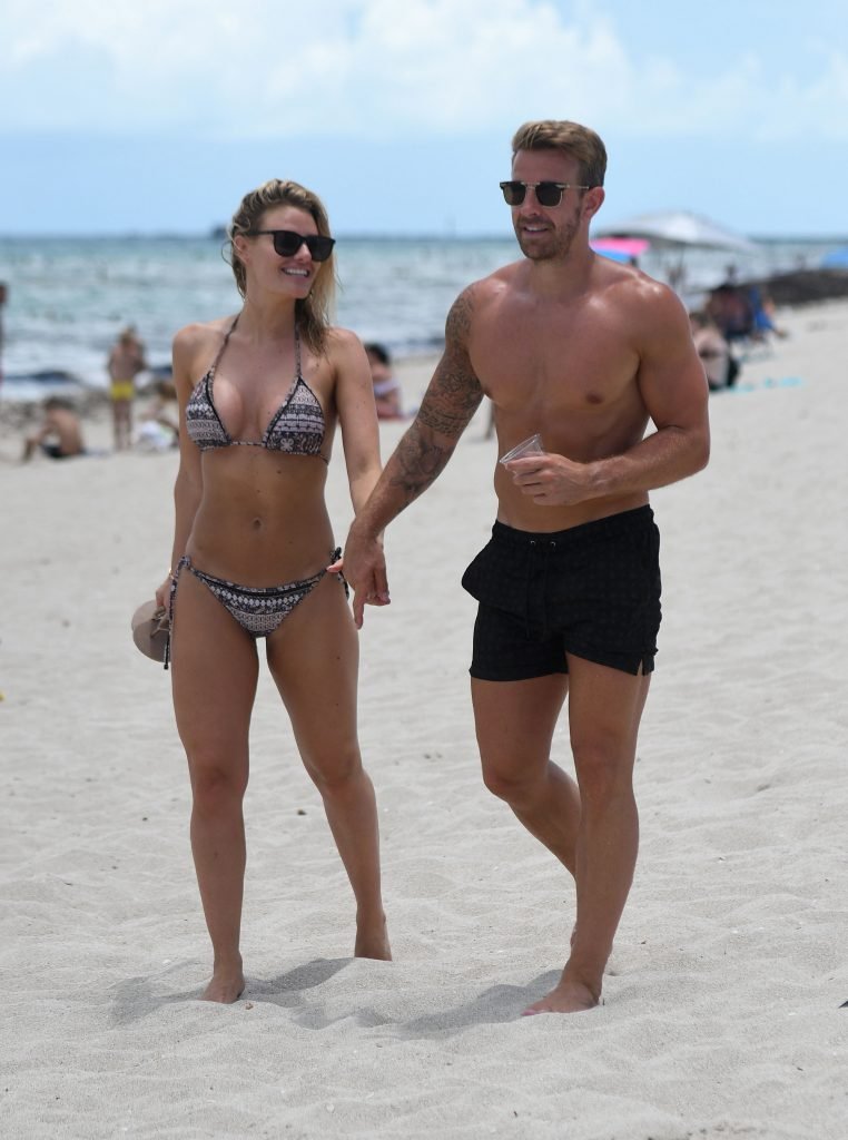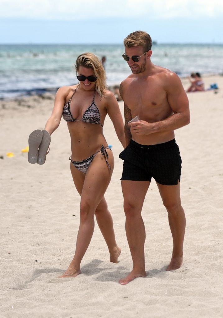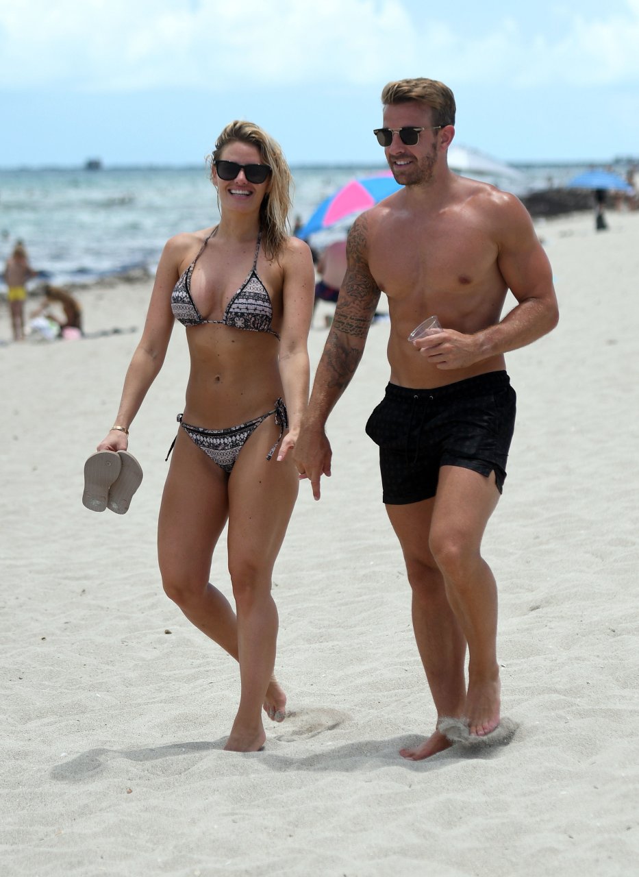 La ex estrella de TOWIE Danielle Armstrong (30) y su novio Daniel Spiller muestran sus cuerpos en la playa y mucho PDA en Miami Beach, Florida, 26/06/2018. El ex futbolista no pudo mantener sus manos alejadas de su novia en bikini mientras demostraban que su relación sigue fuerte durante sus vacaciones llenas de sol.