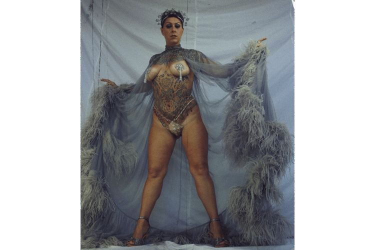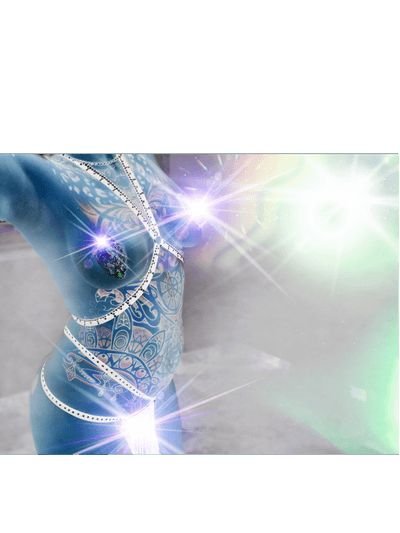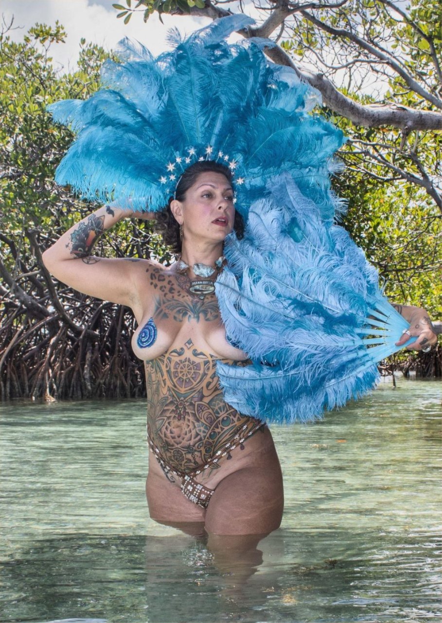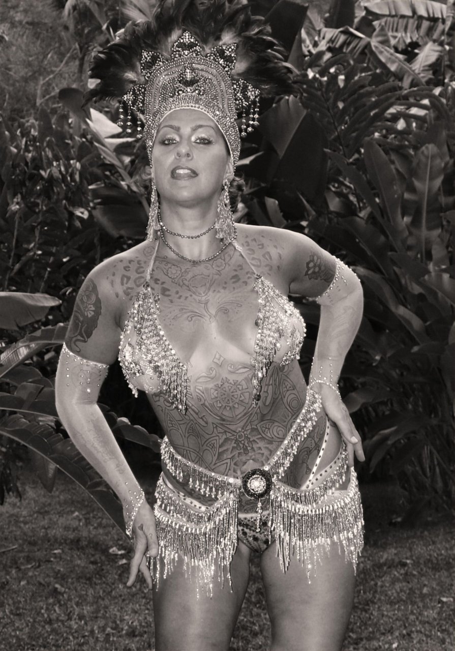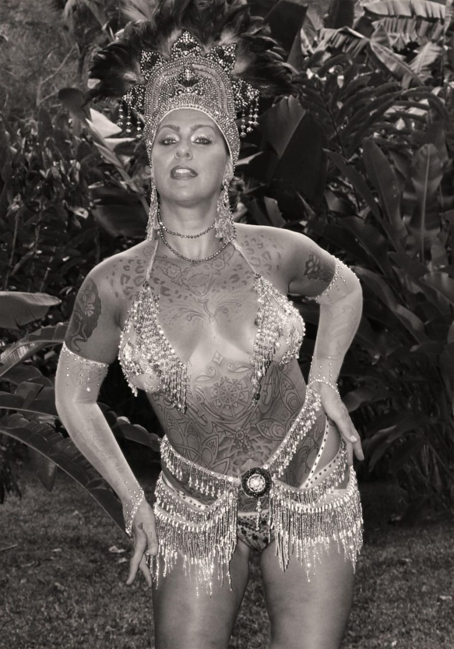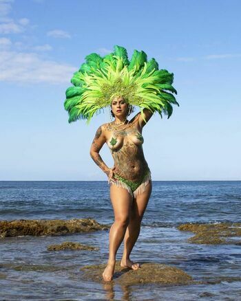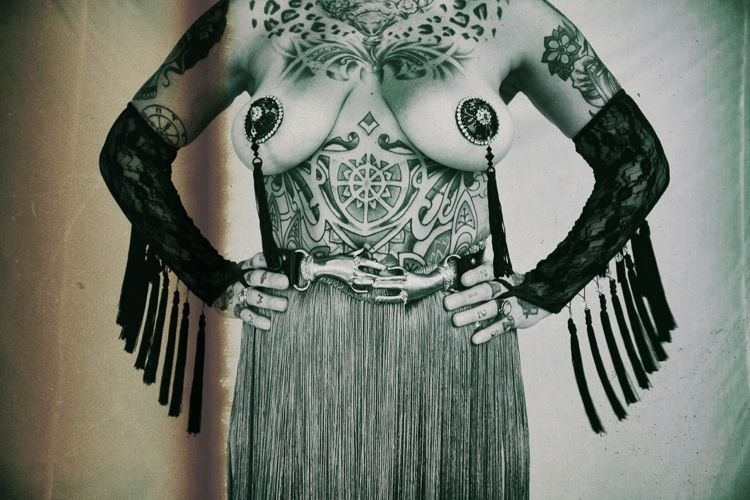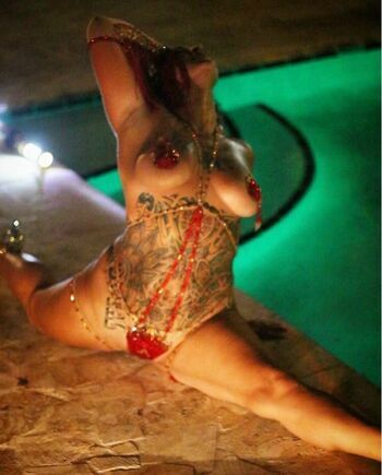Demasiados tatuajes, aunque en realidad se ve mejor con una camiseta sin mangas y jeans azules que con tanga y cubrepezones.