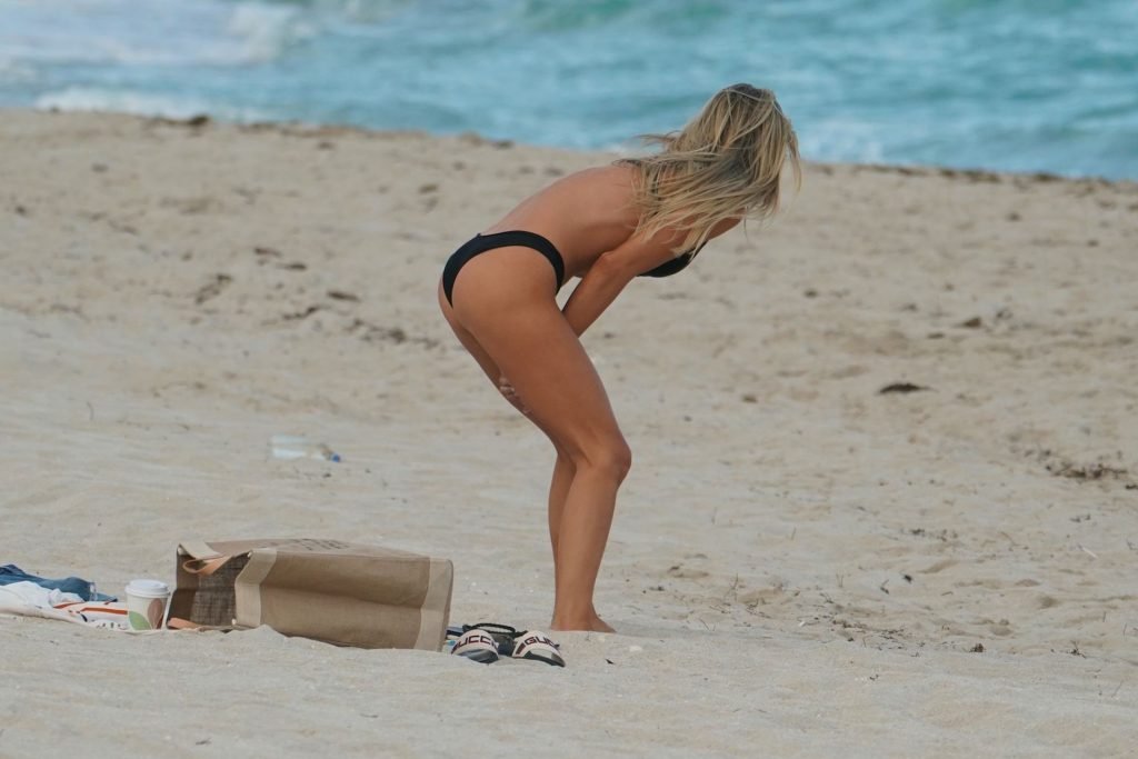 La modelo canadiense Danielle Knudson fue vista en un bikini tanga negro con su amiga, la guapa alemana/croata Jelena Cikoja en la playa de Miami Beach, 12/08/2018.