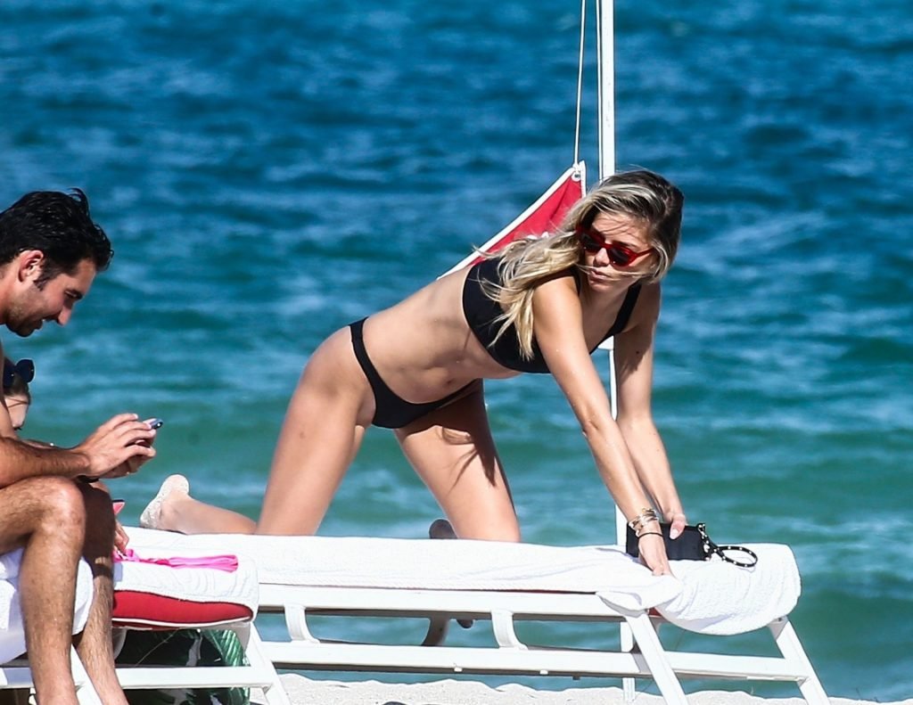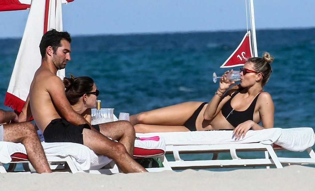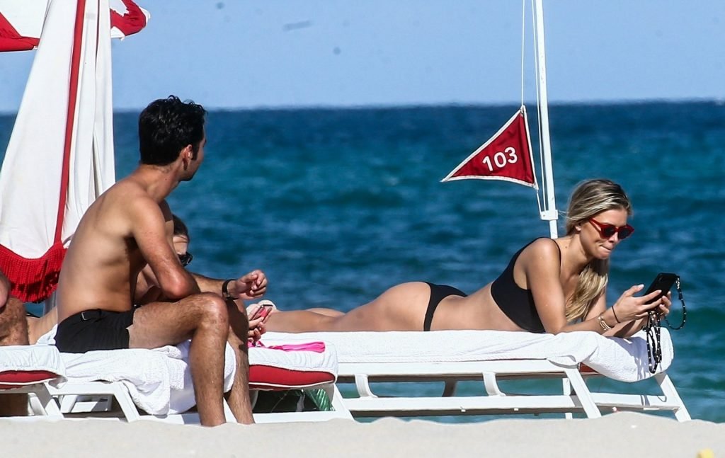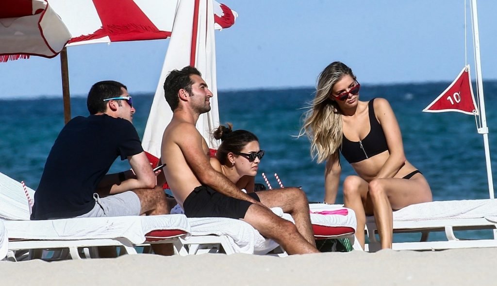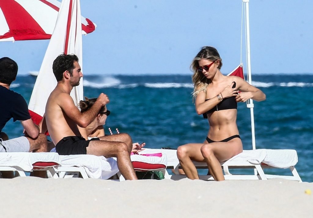 Danielle Knudson disfruta de una relajante tarde de domingo con un acompañante masculino en Miami Beach, 03/03/2019. La modelo canadiense se bronceó en unas tumbonas mientras disfrutaba de algunas bebidas frías.