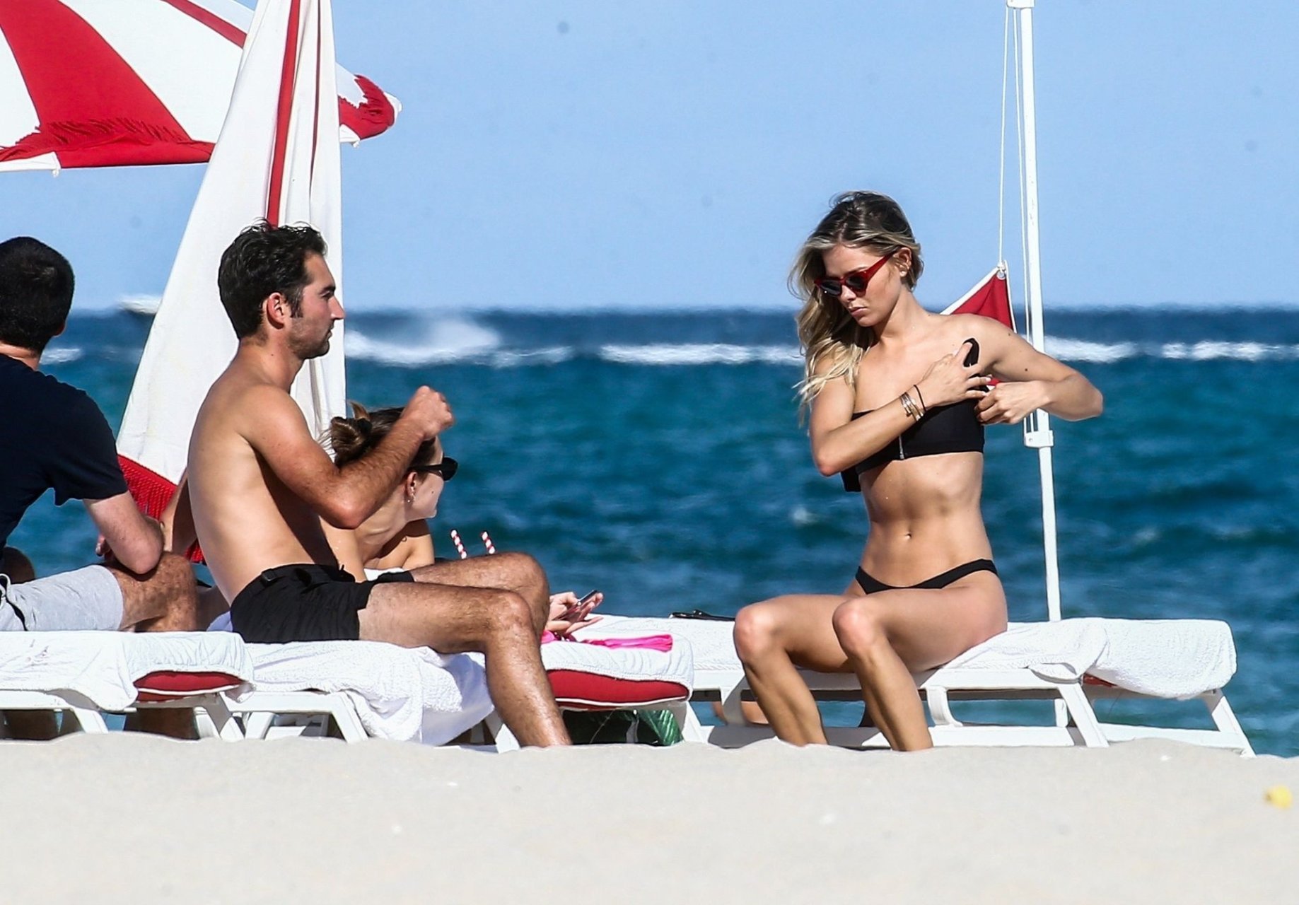 Danielle Knudson disfruta de una relajante tarde de domingo con un acompañante masculino en Miami Beach, 03/03/2019. La modelo canadiense se bronceó en unas tumbonas mientras disfrutaba de algunas bebidas frías.