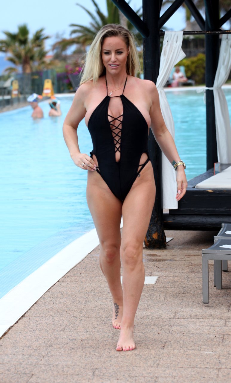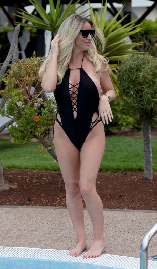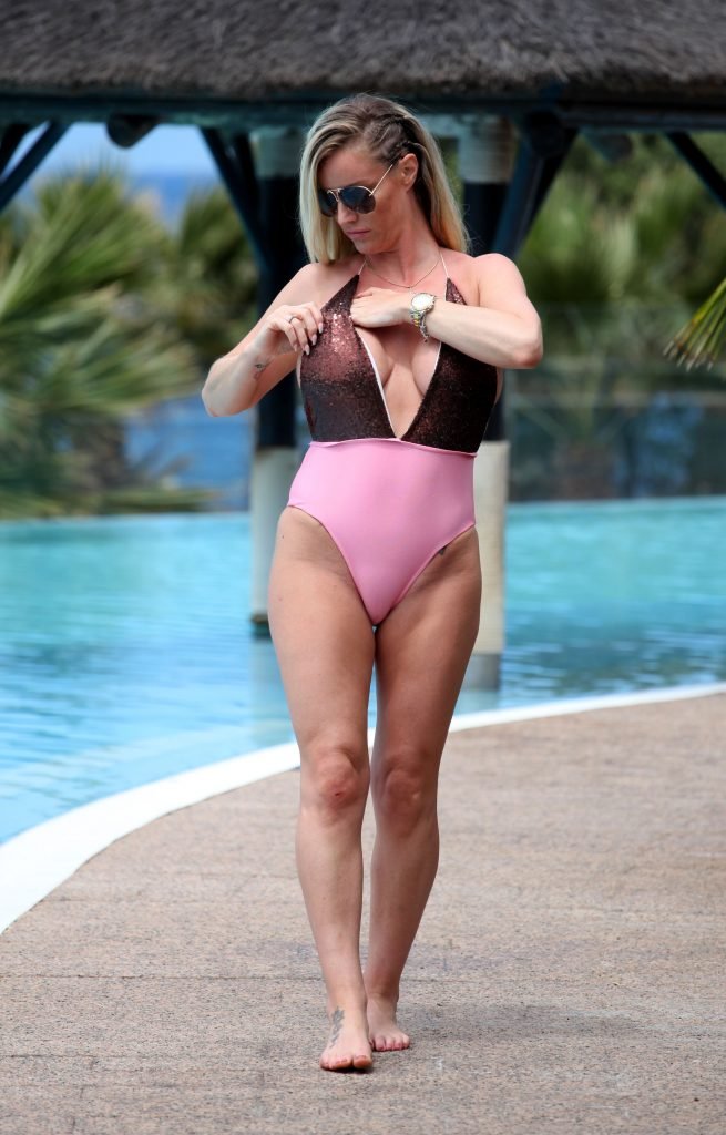 Danielle Mason muestra los resultados de su reciente pérdida de peso, mientras lucha con su traje de baño tomando el sol en España, 01/05/2018. La modelo de glamour, actriz y presentadora de televisión Danielle tuvo dificultades para contener sus atributos al mostrar un pezón mientras ajustaba su traje de baño.