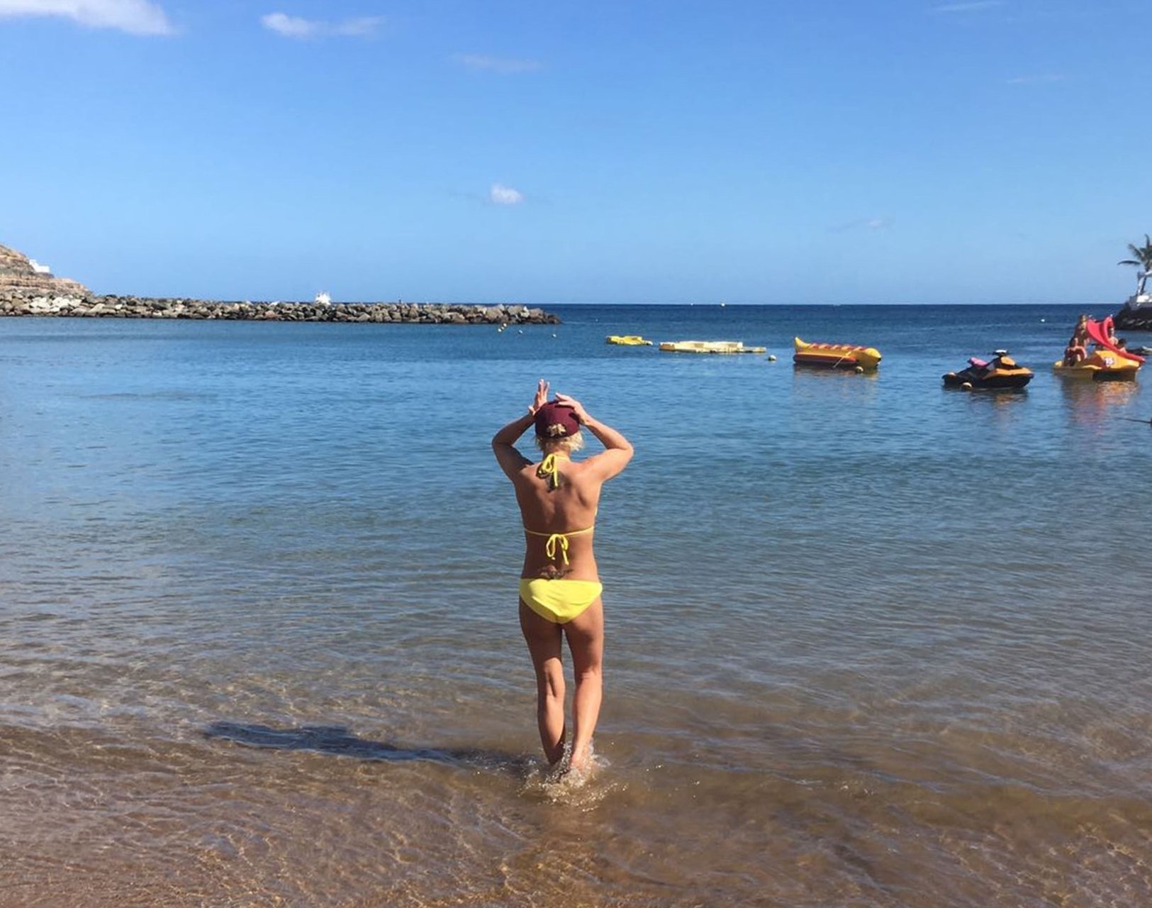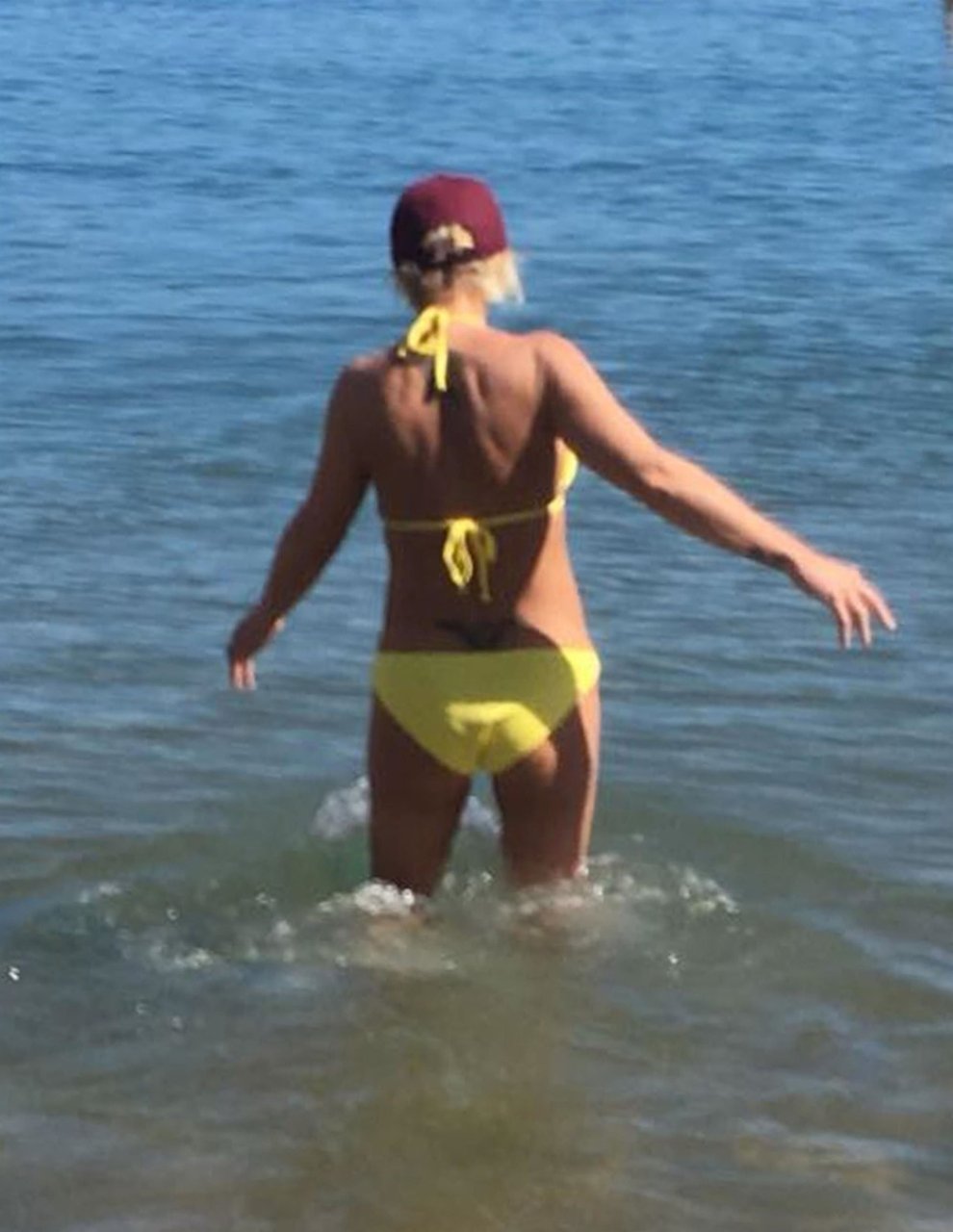 Ex-adicta británica a las drogas, actriz y estrella de telerrealidad Danniella Westbrook disfruta de un baño en el mar mientras pasa el día tomando el sol con su bikini amarillo en las playas de España, 05/04/2018.