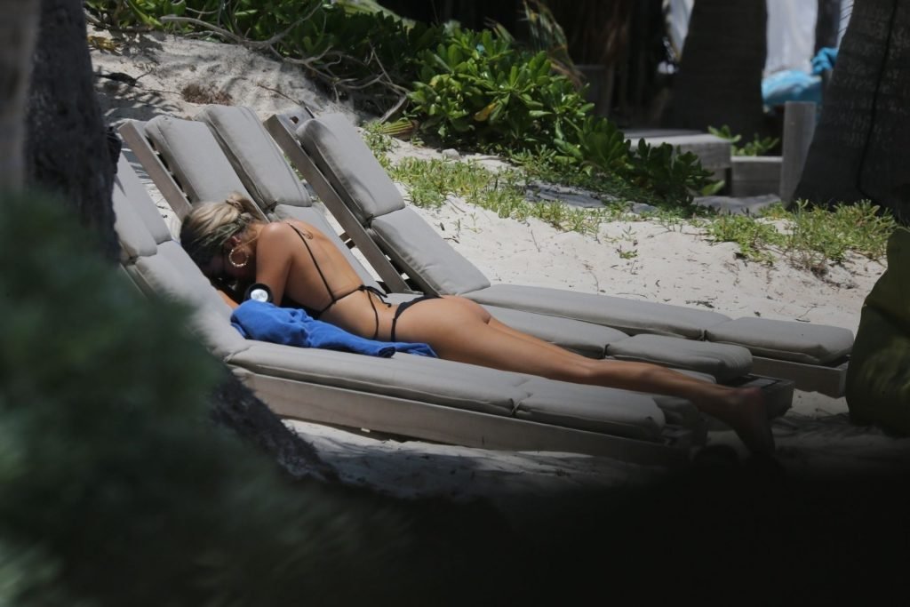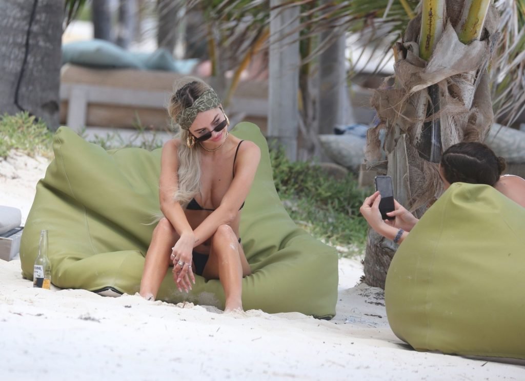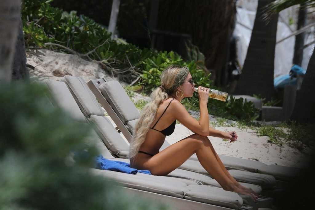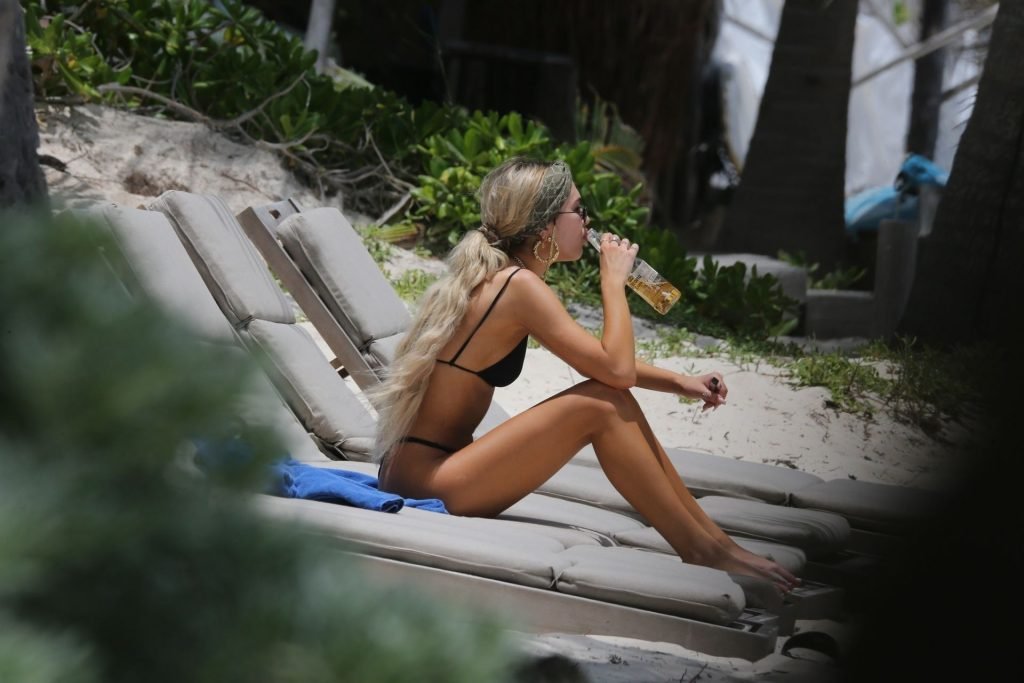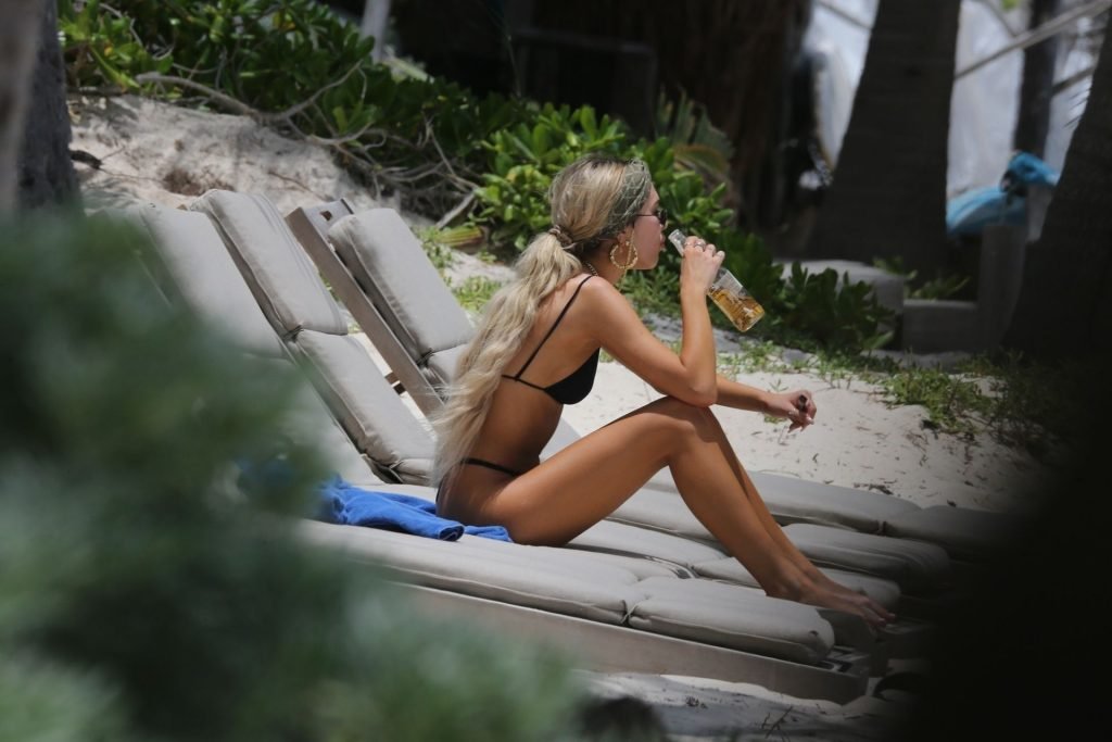 Modelo y hija de los actores Lisa Rinna y Harry Hamlin, Delilah Belle Hamlin muestra su figura esbelta con un diminuto bikini negro y extensiones de cabello rubio mientras disfruta de una cerveza Corona en la playa de Tulum, 01/05/2019. Después de leer y relajarse, la joven modelo toma algunas fotos con una amiga.