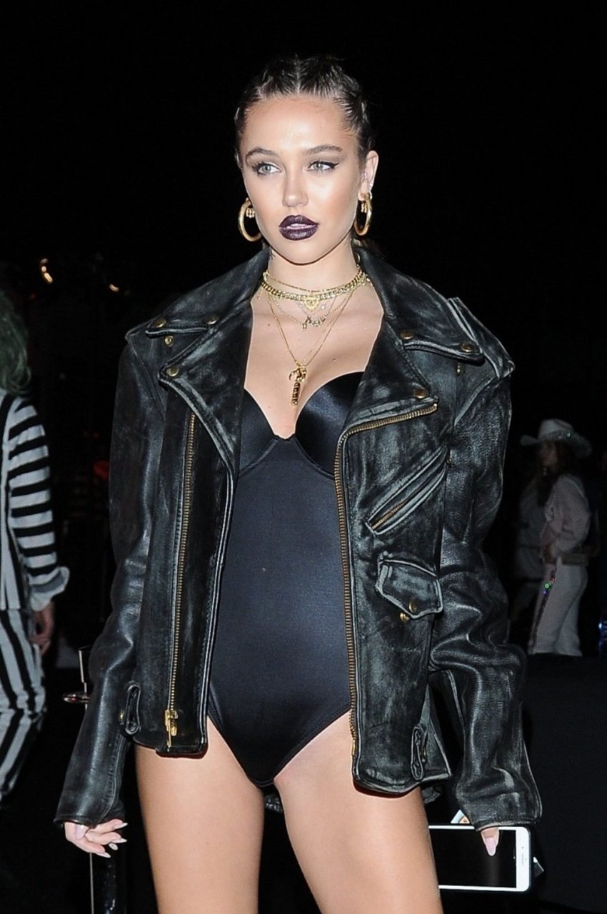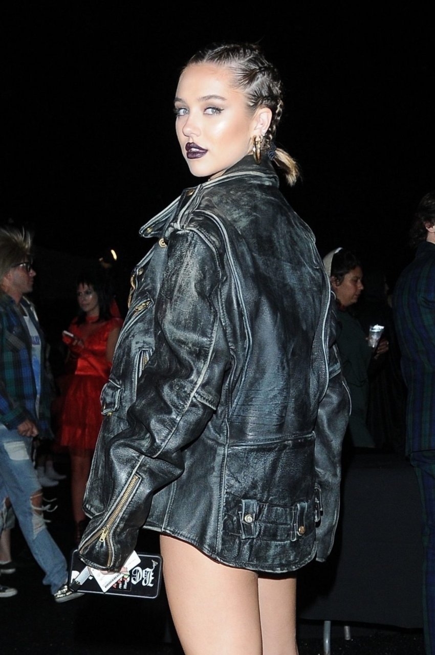 La estrella de Instagram Delilah Belle Hamlin (20) luce un look sexy en la fiesta de Halloween de Just Jared en West Hollywood, 27/10/2018. Se la vio posando con un body, botas y una chaqueta mientras celebra antes de la Noche de Brujas.