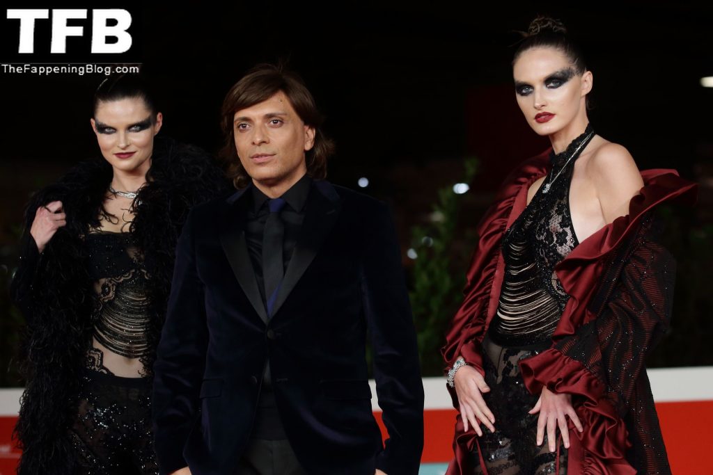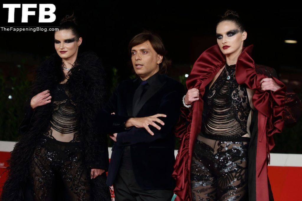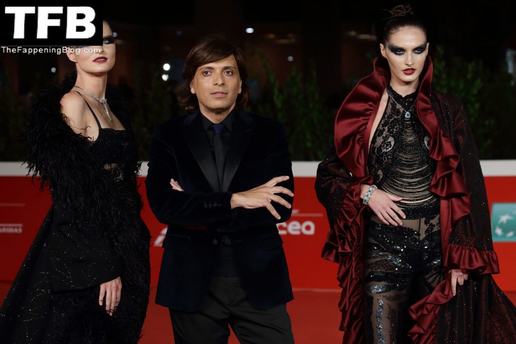 La diseñadora de moda italiana Anton Giulio Grande presenta dos vestidos de su última colección en la alfombra roja del Festival de Cine de Roma, 22/10/2021.