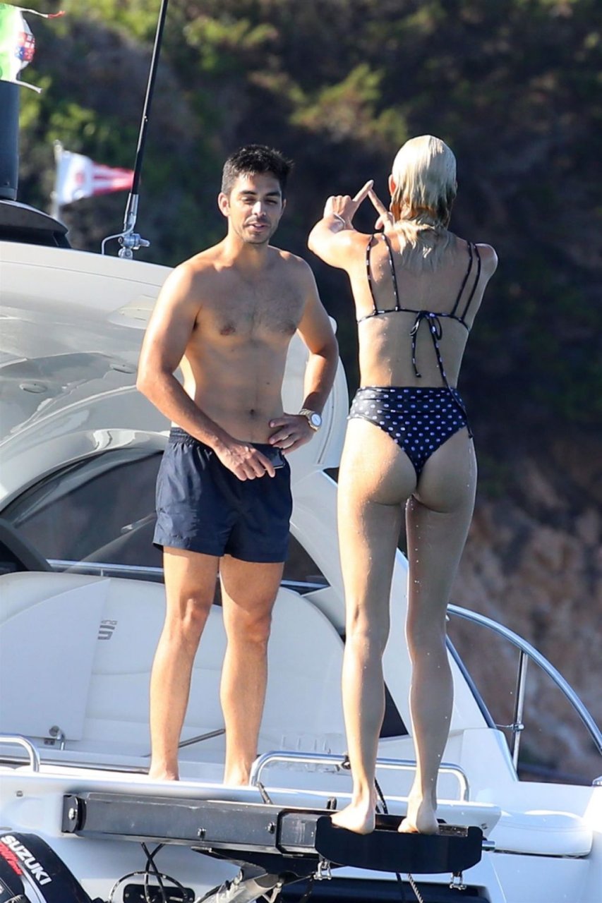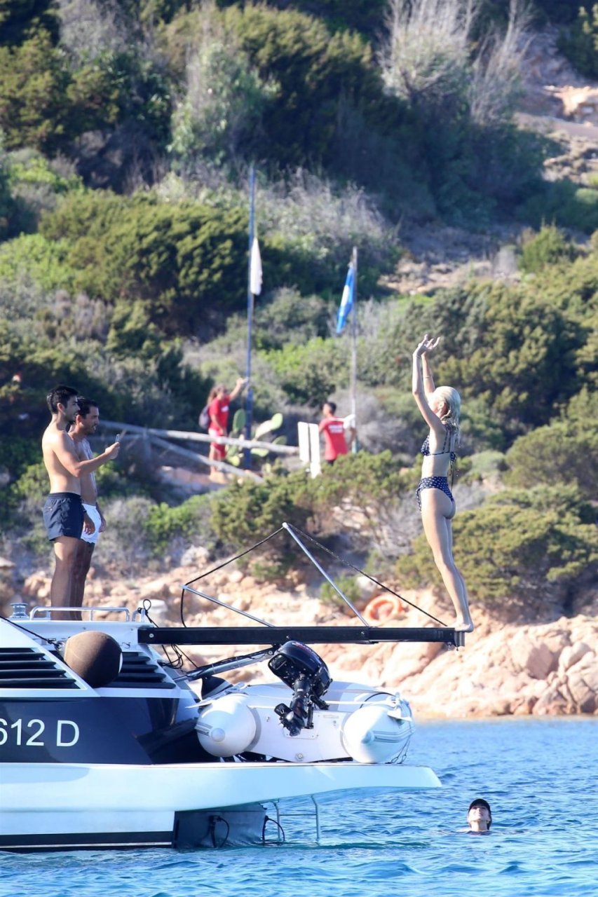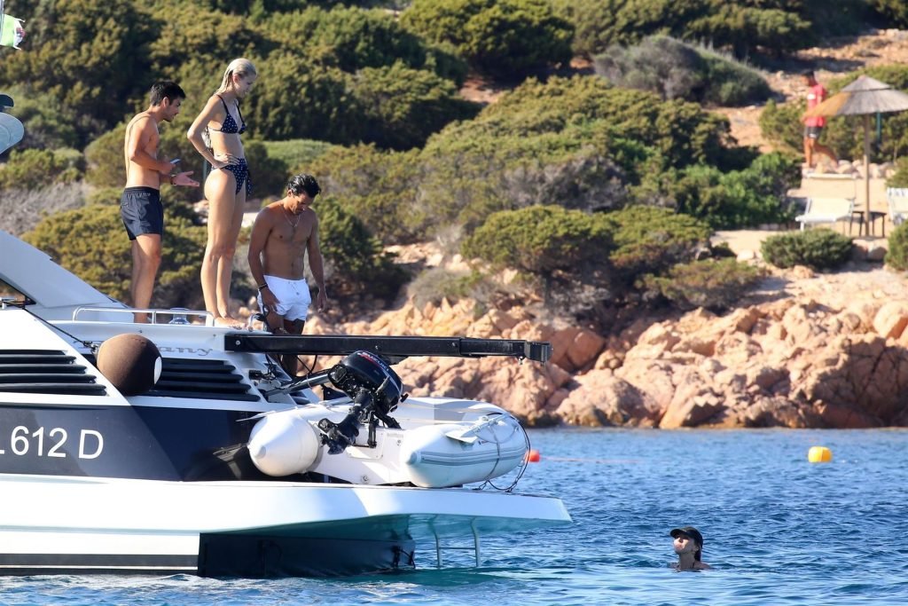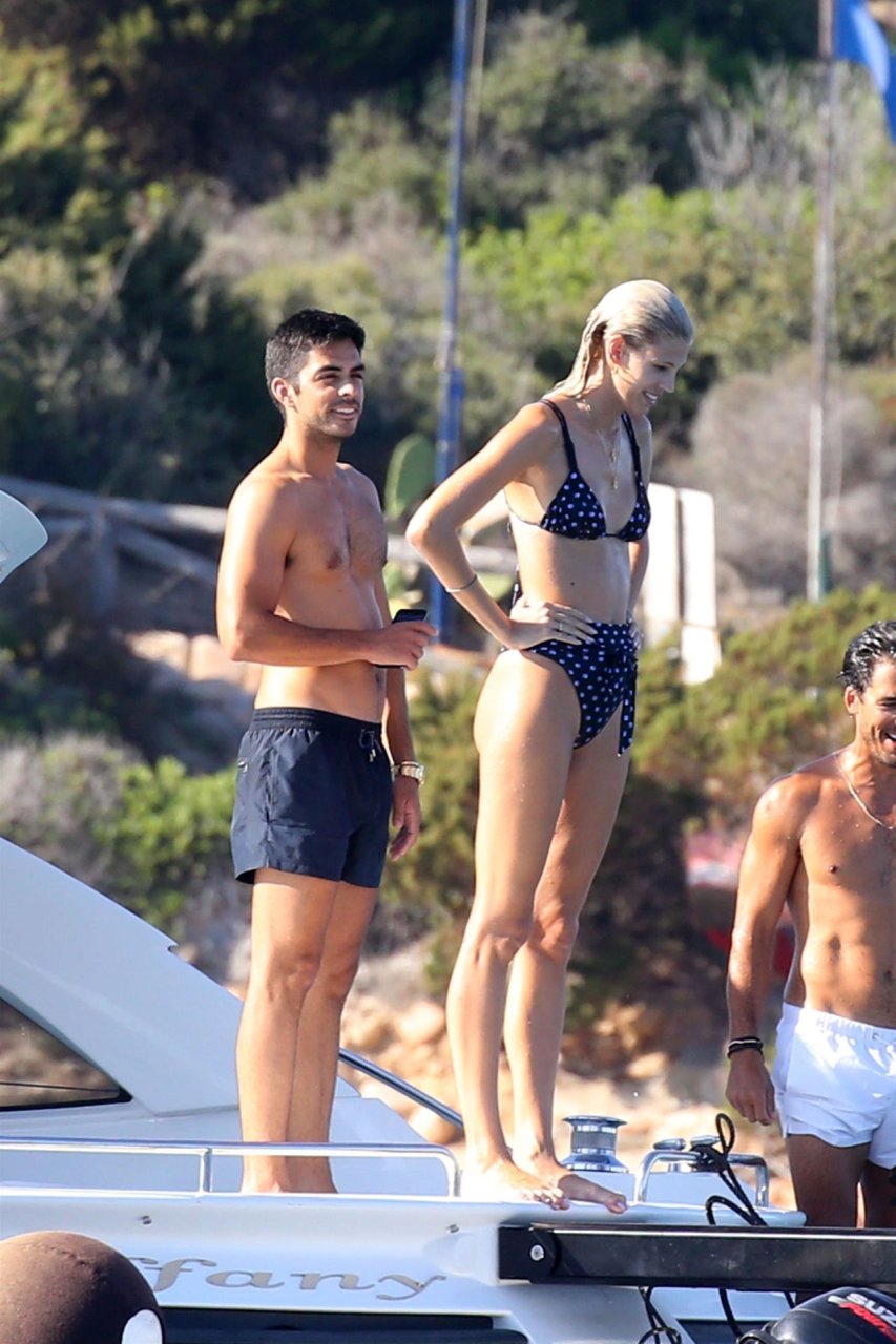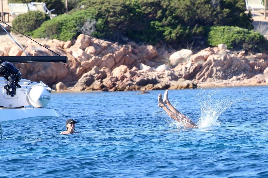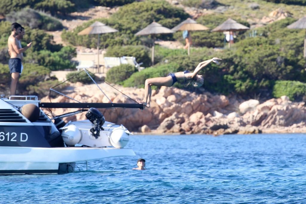 La modelo de Victoria’s Secret Devon Windsor y su novio Johnny Dex disfrutan de sus vacaciones en un yate en la isla La Maddalena, Cerdeña, Italia, 11/08/2019. La pareja causa sensación al lanzarse desde el barco al agua fresca. Devon muestra sus habilidades de buceo mientras realiza trucos en el agua. La pareja termina su día relajándose y abrazándose en el yate.