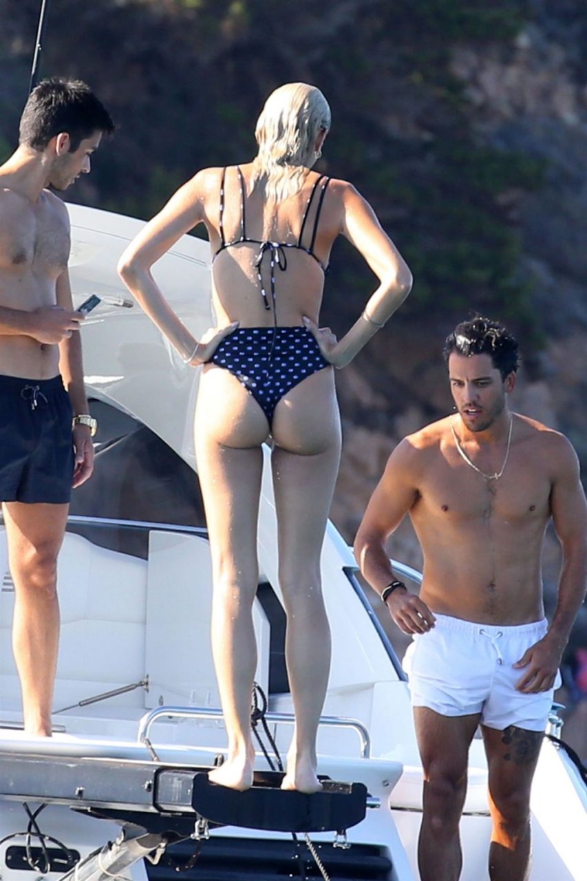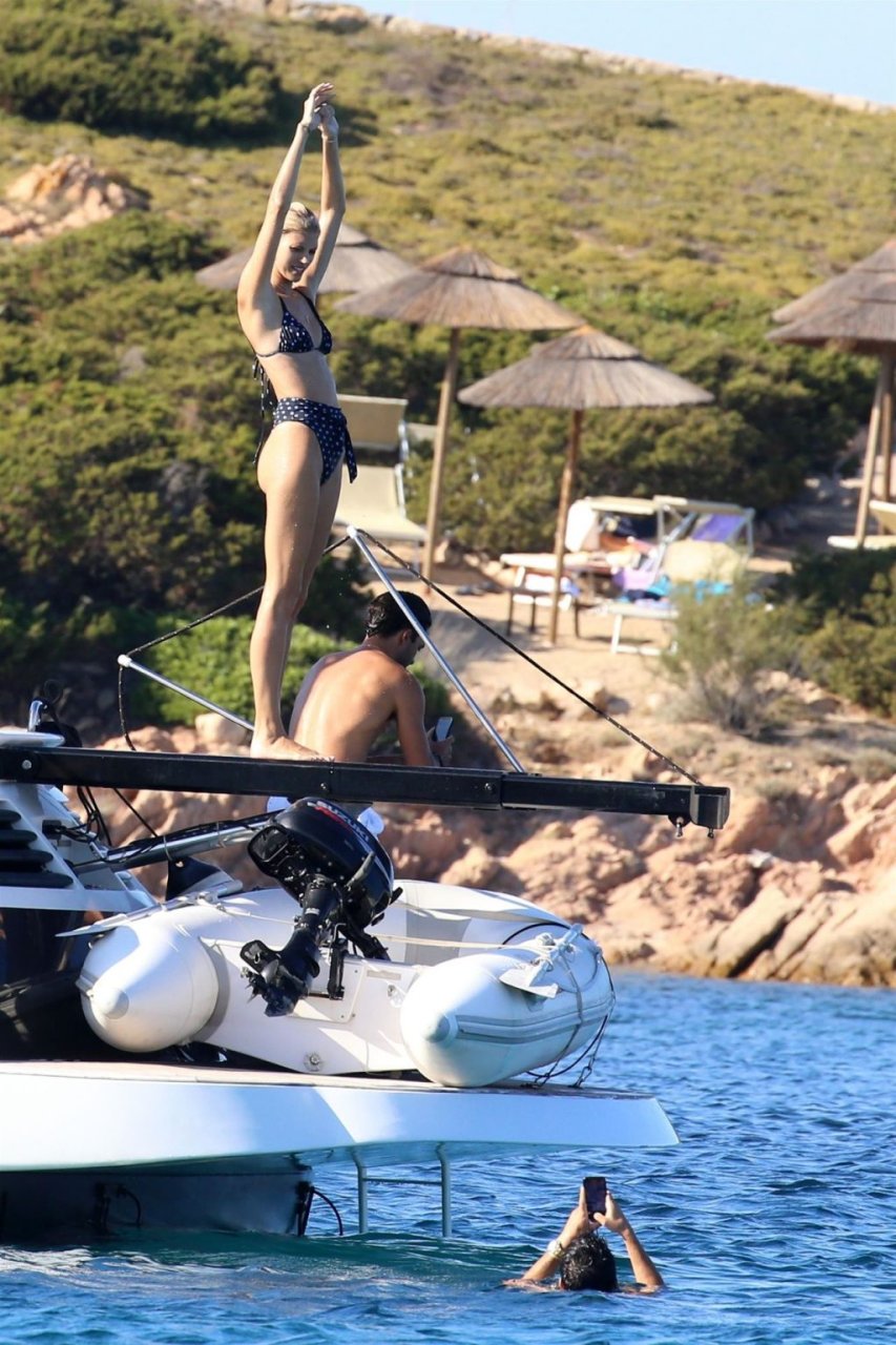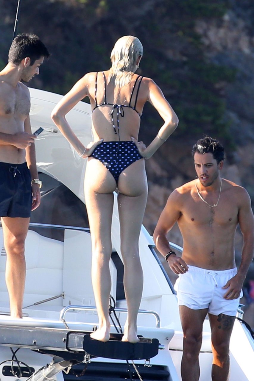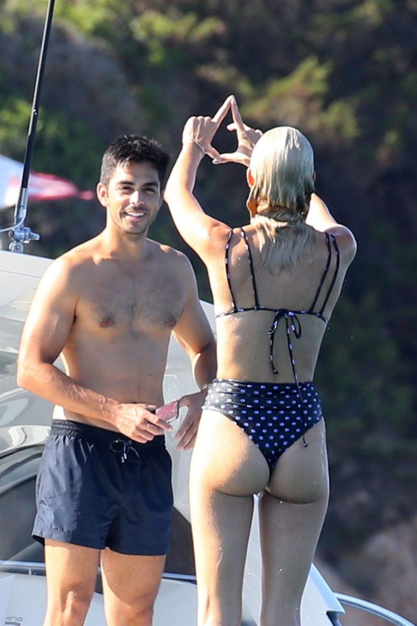 La modelo de Victoria’s Secret Devon Windsor y su novio Johnny Dex disfrutan de sus vacaciones en un yate en la isla La Maddalena, Cerdeña, Italia, 11/08/2019. La pareja causa sensación al lanzarse desde el barco al agua fresca. Devon muestra sus habilidades de buceo mientras realiza trucos en el agua. La pareja termina su día relajándose y abrazándose en el yate.
