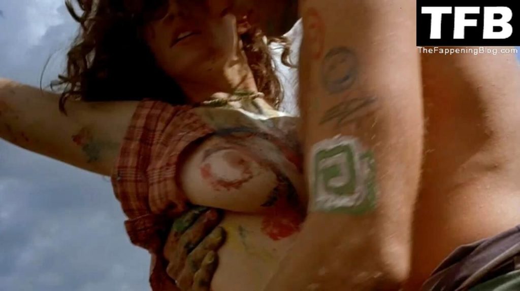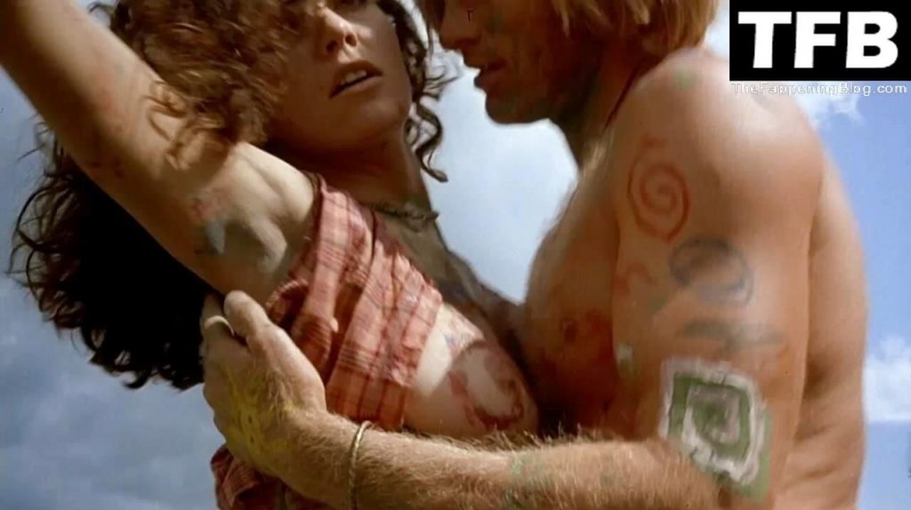Diane Lane gira en los brazos de un hombre, su camisa abierta revelando su pecho derecho desnudo con algo de pintura corporal.