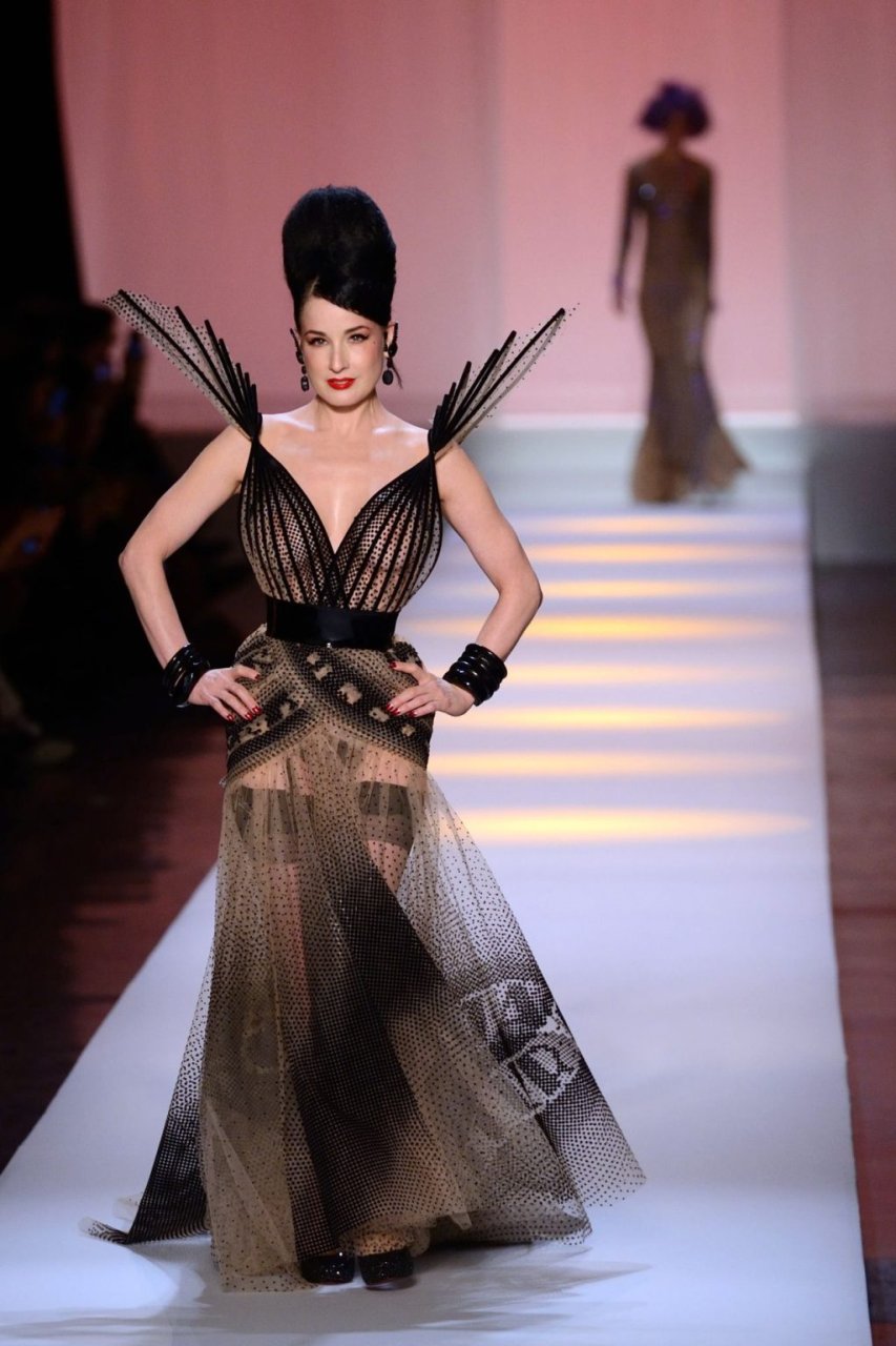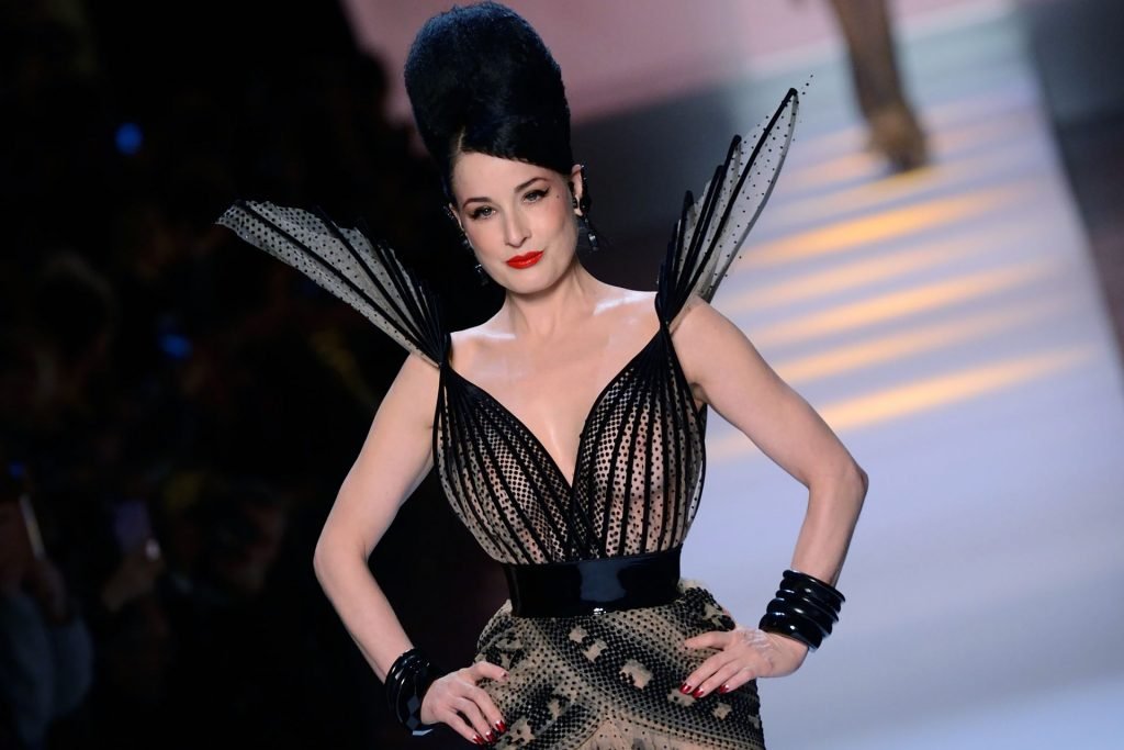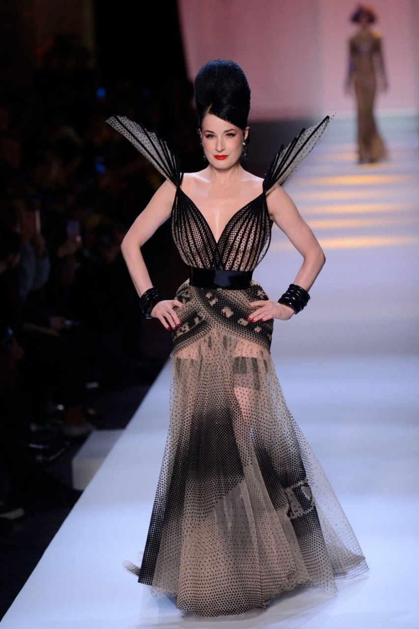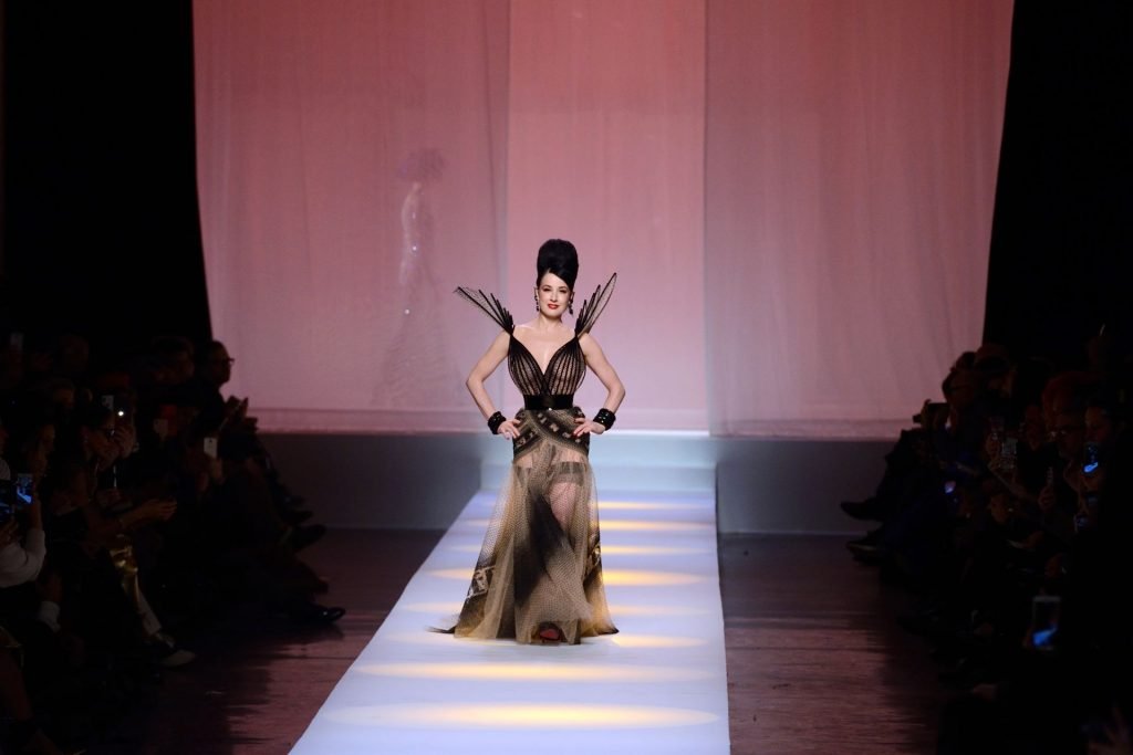 Bailarina burlesca voluptuosa, modelo y diseñadora de moda Dita Von Teese desfila con un vestido transparente para el desfile de Jean-Paul Gaultier Haute Couture Primavera/Verano 2019 durante la Semana de la Moda de París, 23/01/2019.