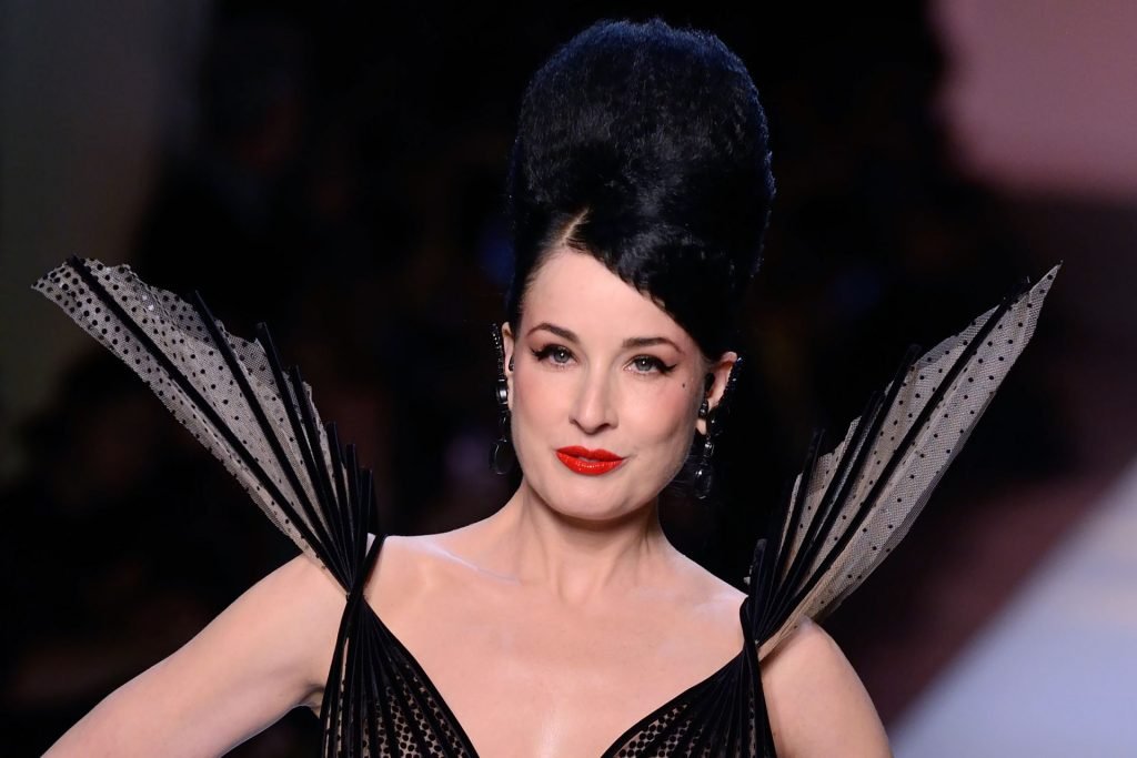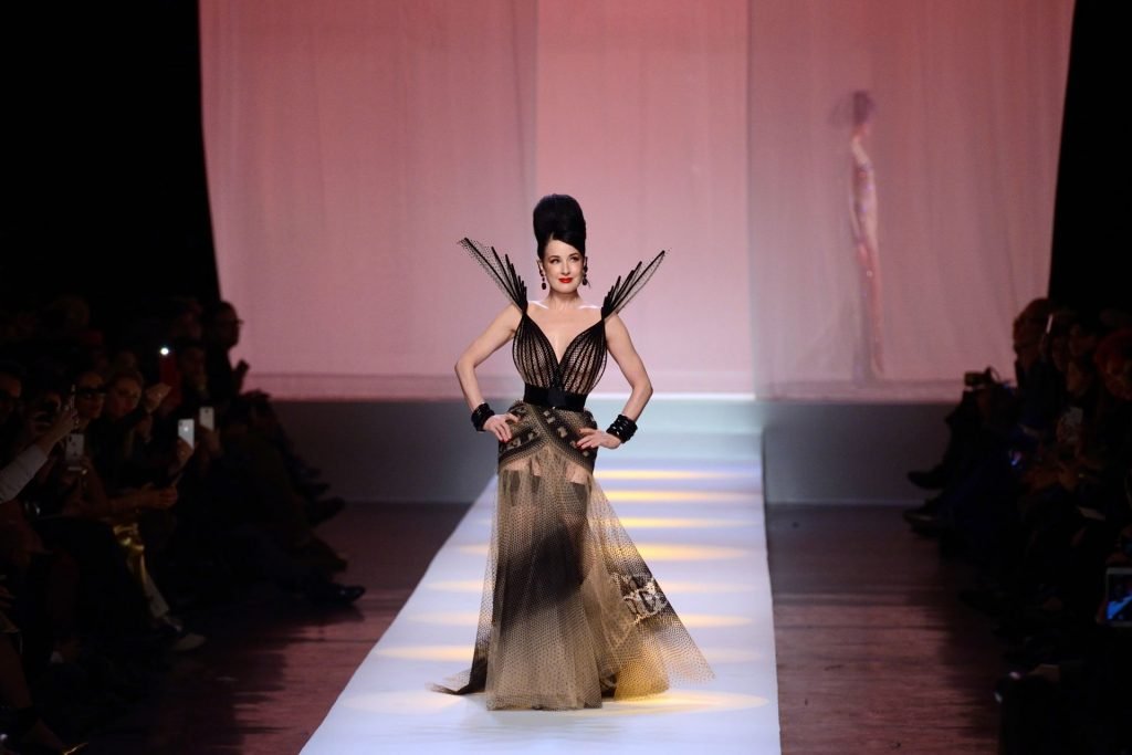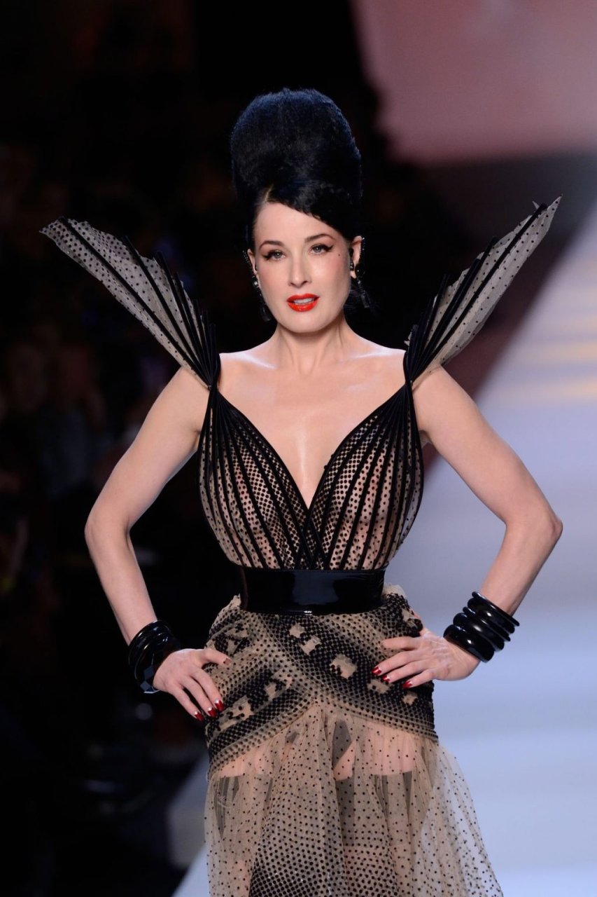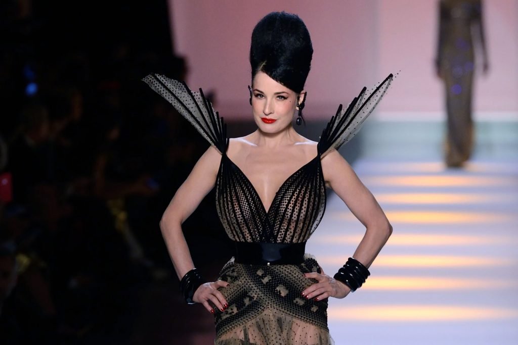 Bailarina burlesca voluptuosa, modelo y diseñadora de moda Dita Von Teese desfila con un vestido transparente para el desfile de Jean-Paul Gaultier Haute Couture Primavera/Verano 2019 durante la Semana de la Moda de París, 23/01/2019.