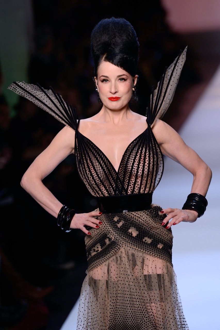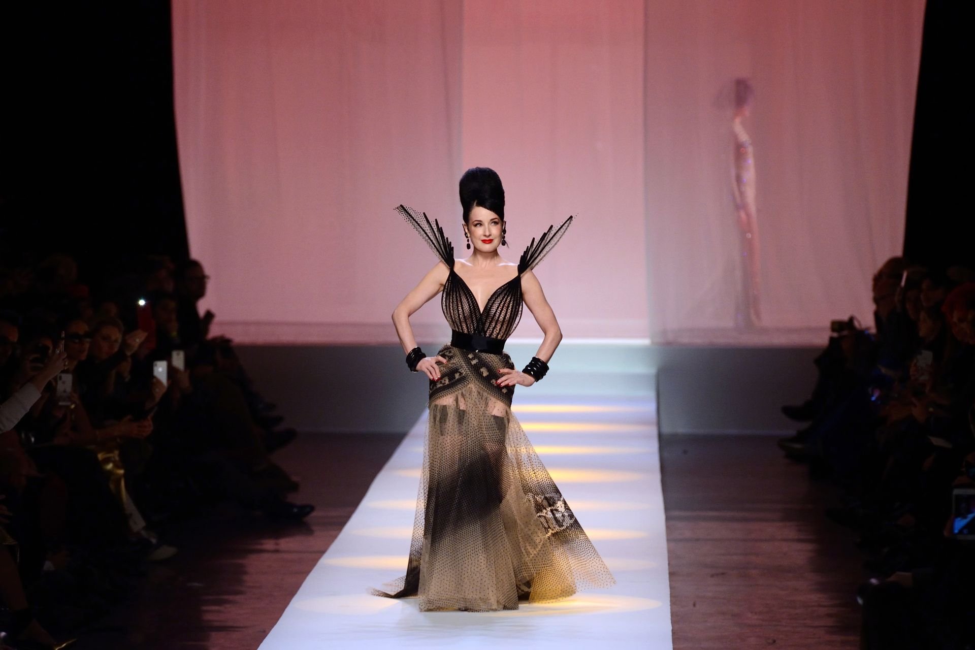 Bailarina burlesca voluptuosa, modelo y diseñadora de moda Dita Von Teese desfila con un vestido transparente para el desfile de Jean-Paul Gaultier Haute Couture Primavera/Verano 2019 durante la Semana de la Moda de París, 23/01/2019.