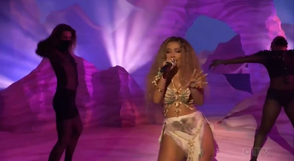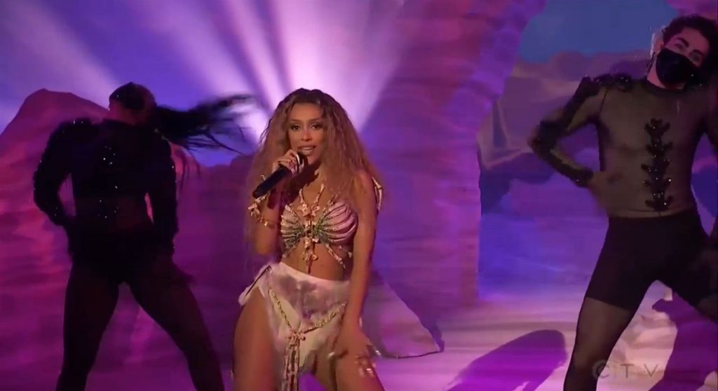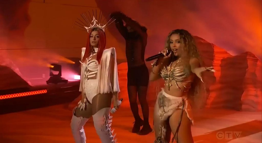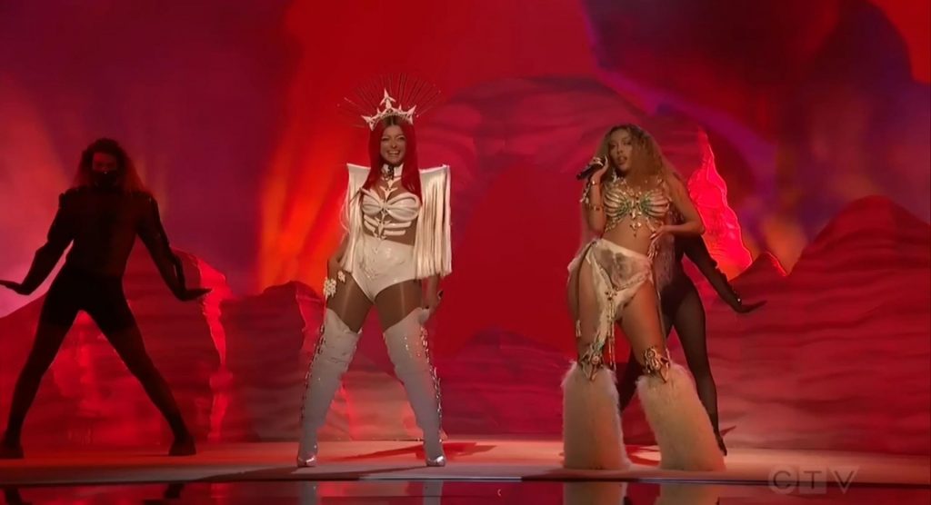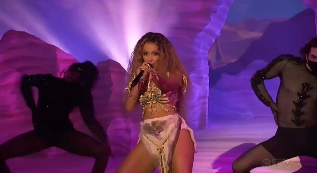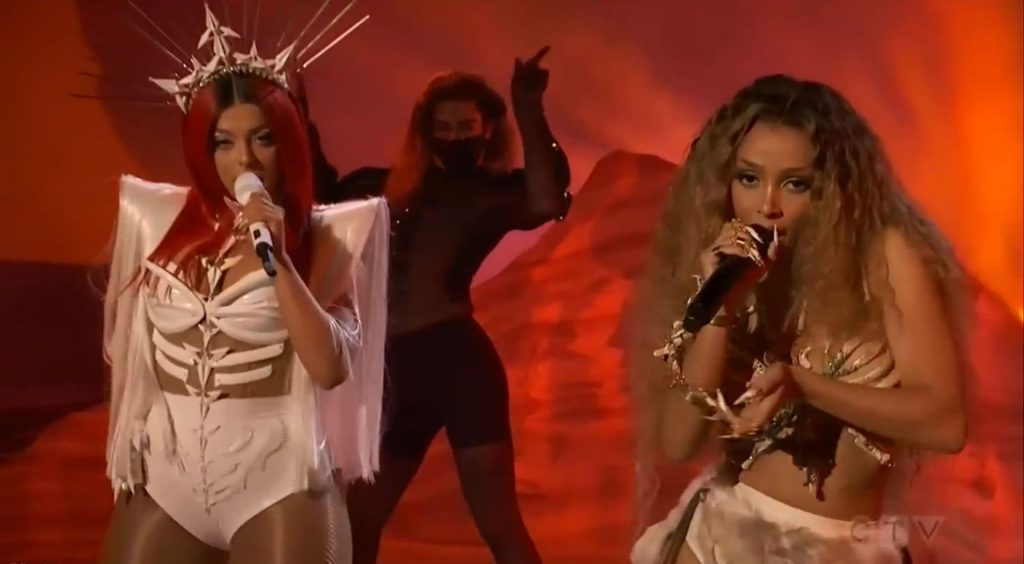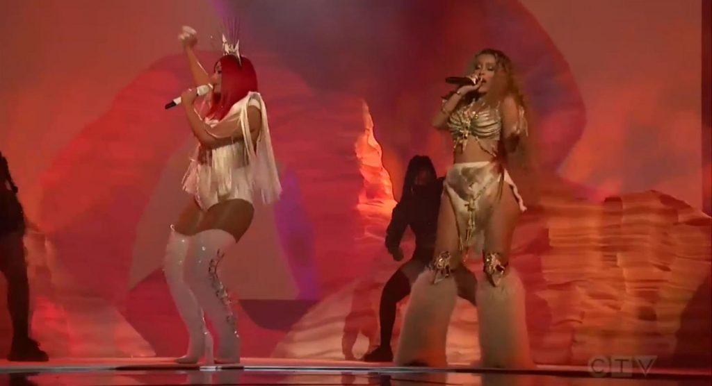 Las dos regresaron a la época de las mujeres cavernícolas con el fondo en el escenario, una de las muchas eras cubiertas en el video musical de la canción, con una actuación enérgica del pegajoso tema pop. La pareja navegó el escenografía rocosa con disfraces ingeniosos y enormes peinados, mientras los bailarines de fondo enmascarados danzaban a su alrededor. Rexha lució un conjunto blanco más futurista con hombros estructurados, una gran corona con puntas y botas altas hasta el muslo, mientras que Doja optó por un look de mujer cavernícola con un top tipo bikini y pantalones con borde peludo. La moda, combinada con el fondo cavernoso, fue tan parte de la actuación como las propias cantantes.