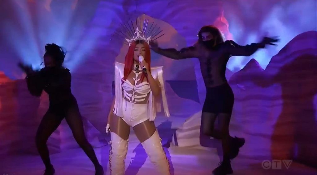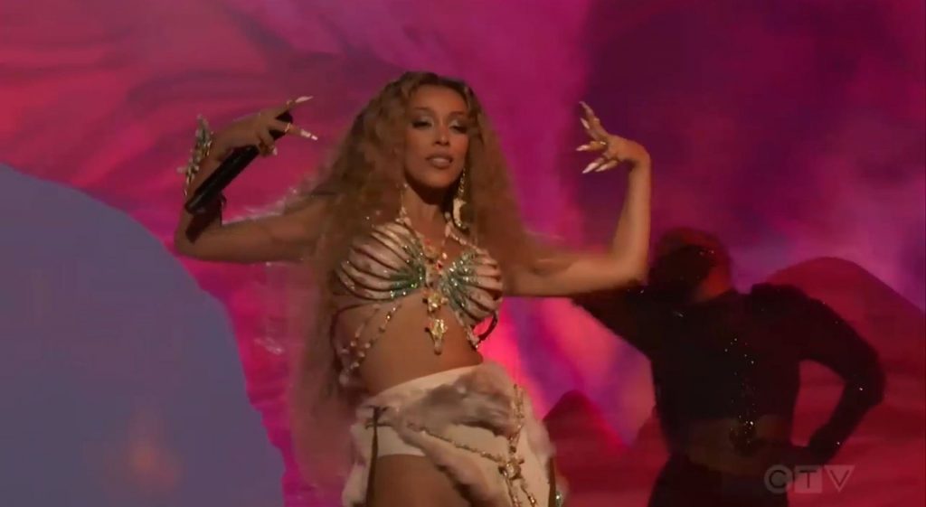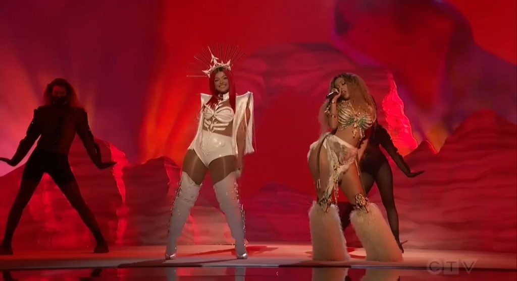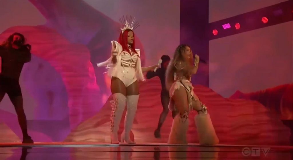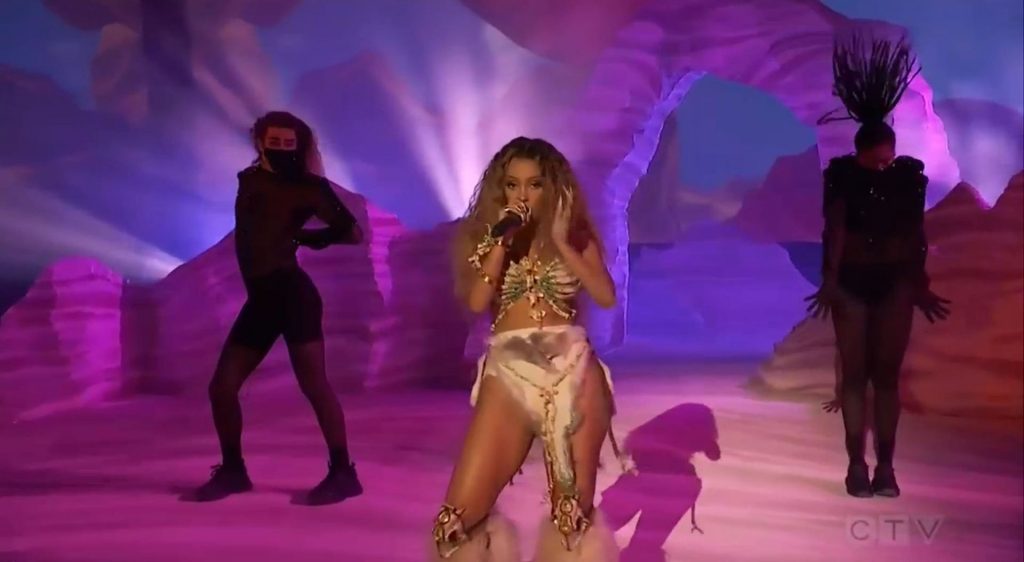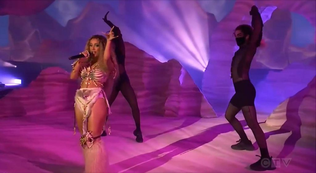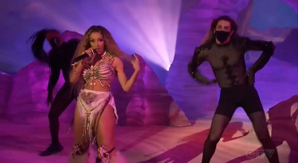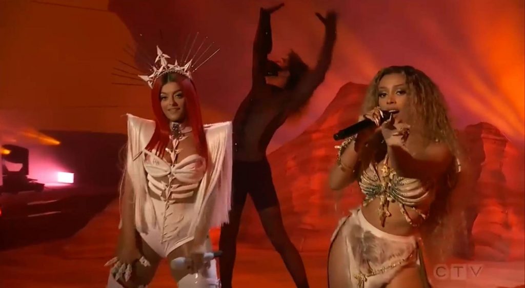Las dos regresaron a la época de las mujeres cavernícolas con el fondo en el escenario, una de las muchas eras cubiertas en el video musical de la canción, con una actuación enérgica del pegajoso tema pop. La pareja navegó el escenografía rocosa con disfraces ingeniosos y enormes peinados, mientras los bailarines de fondo enmascarados danzaban a su alrededor. Rexha lució un conjunto blanco más futurista con hombros estructurados, una gran corona con puntas y botas altas hasta el muslo, mientras que Doja optó por un look de mujer cavernícola con un top tipo bikini y pantalones con borde peludo. La moda, combinada con el fondo cavernoso, fue tan parte de la actuación como las propias cantantes.
