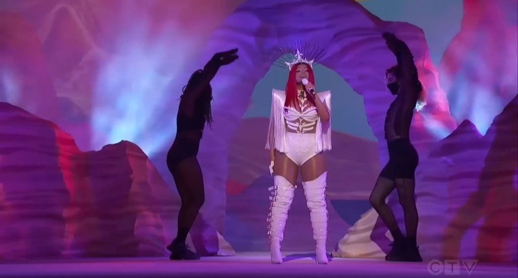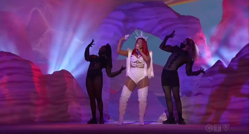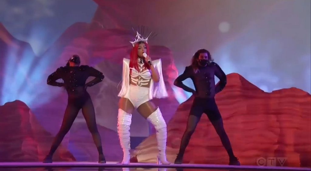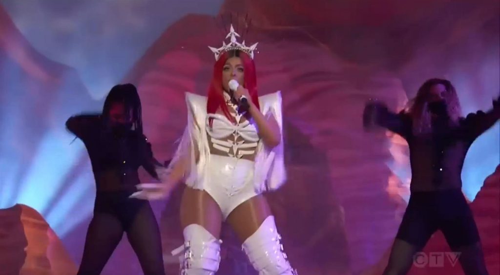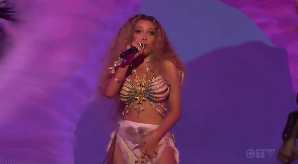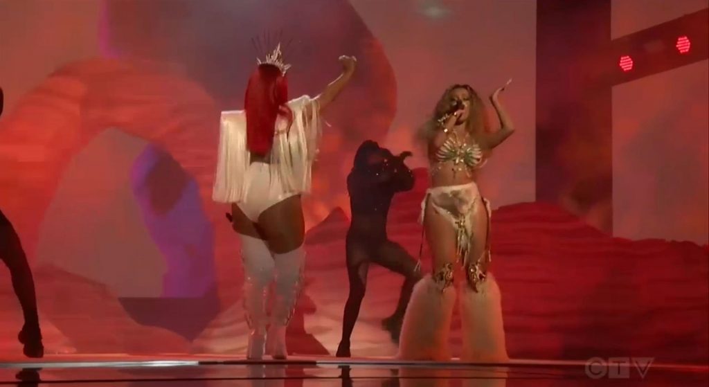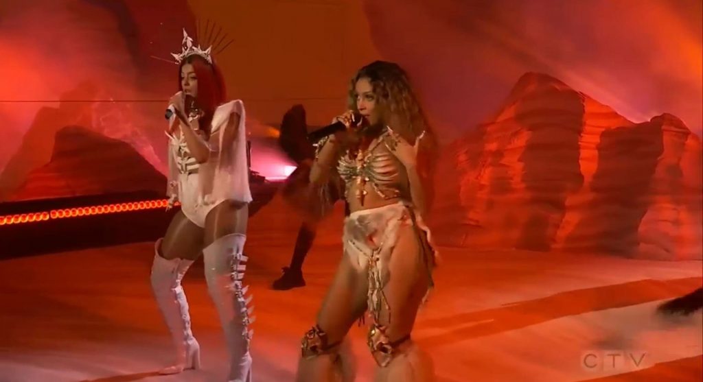 Las dos regresaron a la época de las mujeres cavernícolas con el fondo en el escenario, una de las muchas eras cubiertas en el video musical de la canción, con una actuación enérgica del pegajoso tema pop. La pareja navegó el escenografía rocosa con disfraces ingeniosos y enormes peinados, mientras los bailarines de fondo enmascarados danzaban a su alrededor. Rexha lució un conjunto blanco más futurista con hombros estructurados, una gran corona con puntas y botas altas hasta el muslo, mientras que Doja optó por un look de mujer cavernícola con un top tipo bikini y pantalones con borde peludo. La moda, combinada con el fondo cavernoso, fue tan parte de la actuación como las propias cantantes.