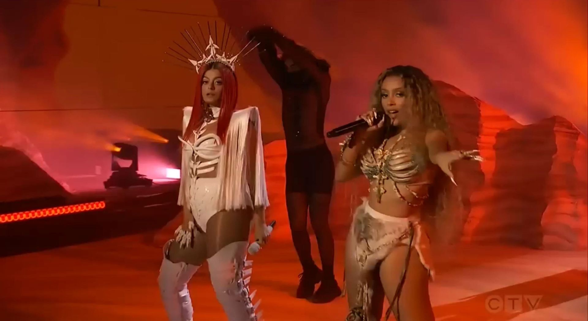 Las dos regresaron a la época de las mujeres cavernícolas con el fondo en el escenario, una de las muchas eras cubiertas en el video musical de la canción, con una actuación enérgica del pegajoso tema pop. La pareja navegó el escenografía rocosa con disfraces ingeniosos y enormes peinados, mientras los bailarines de fondo enmascarados danzaban a su alrededor. Rexha lució un conjunto blanco más futurista con hombros estructurados, una gran corona con puntas y botas altas hasta el muslo, mientras que Doja optó por un look de mujer cavernícola con un top tipo bikini y pantalones con borde peludo. La moda, combinada con el fondo cavernoso, fue tan parte de la actuación como las propias cantantes.