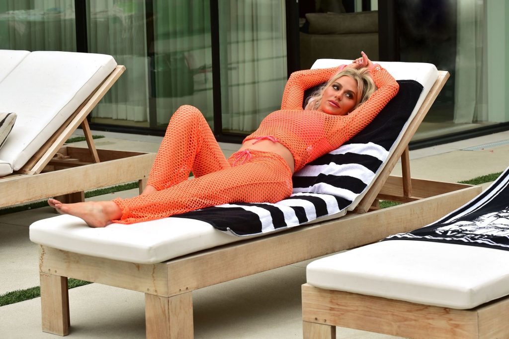 Promocionando una venta actual en su sitio, está promoviendo los pantalones y top de malla neón Camille y el bikini de top y bottom rosa carmesí Teddi. El Camille lleva el nombre de su coprotagonista Camille Grammar y el Teddi de la coprotagonista Teddi Mellencamp.