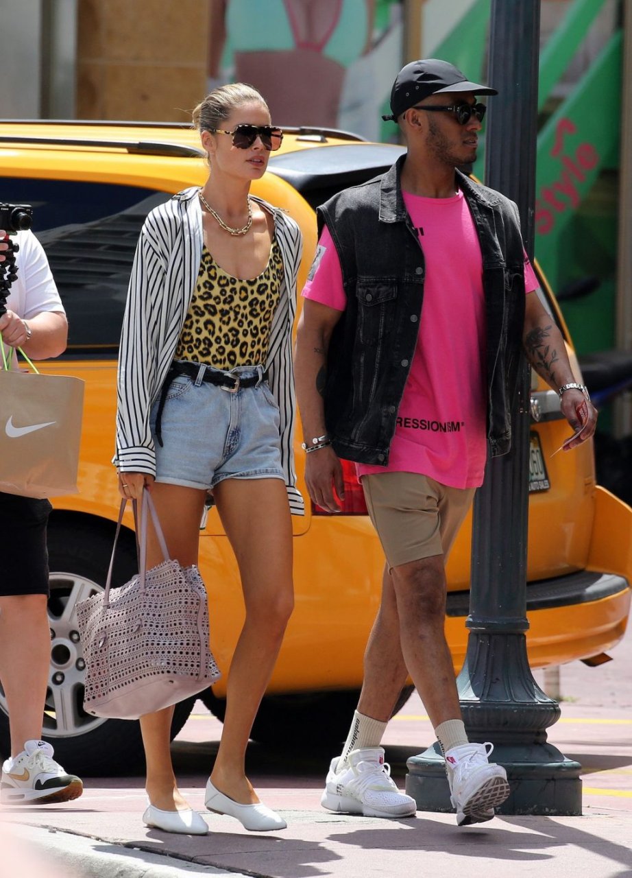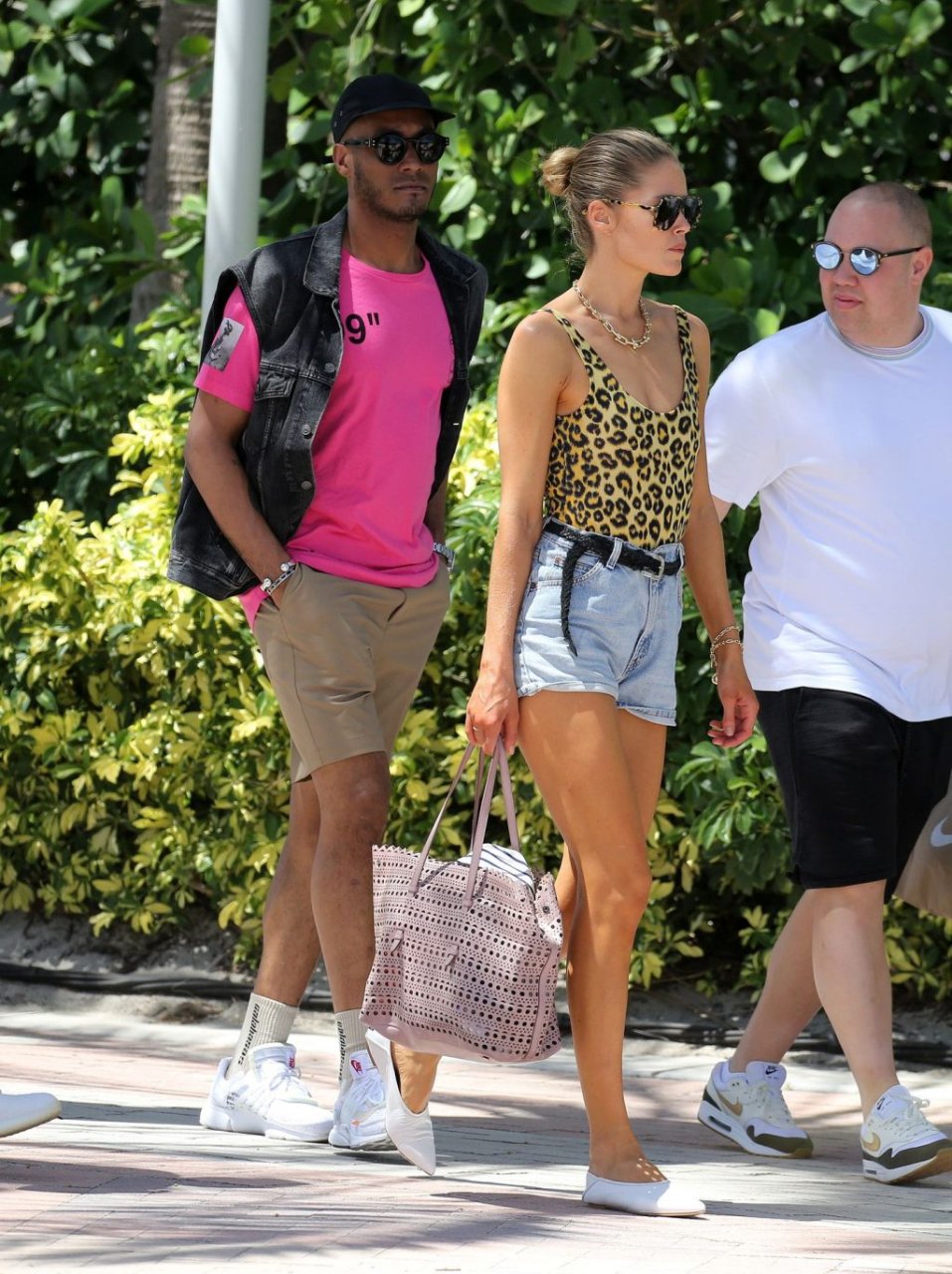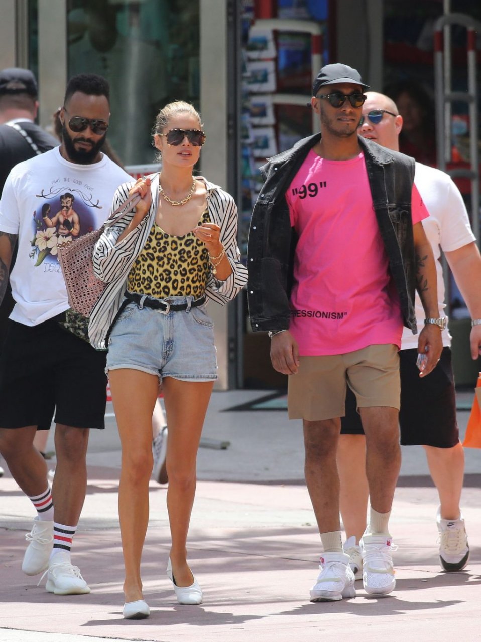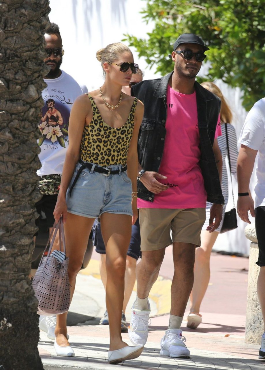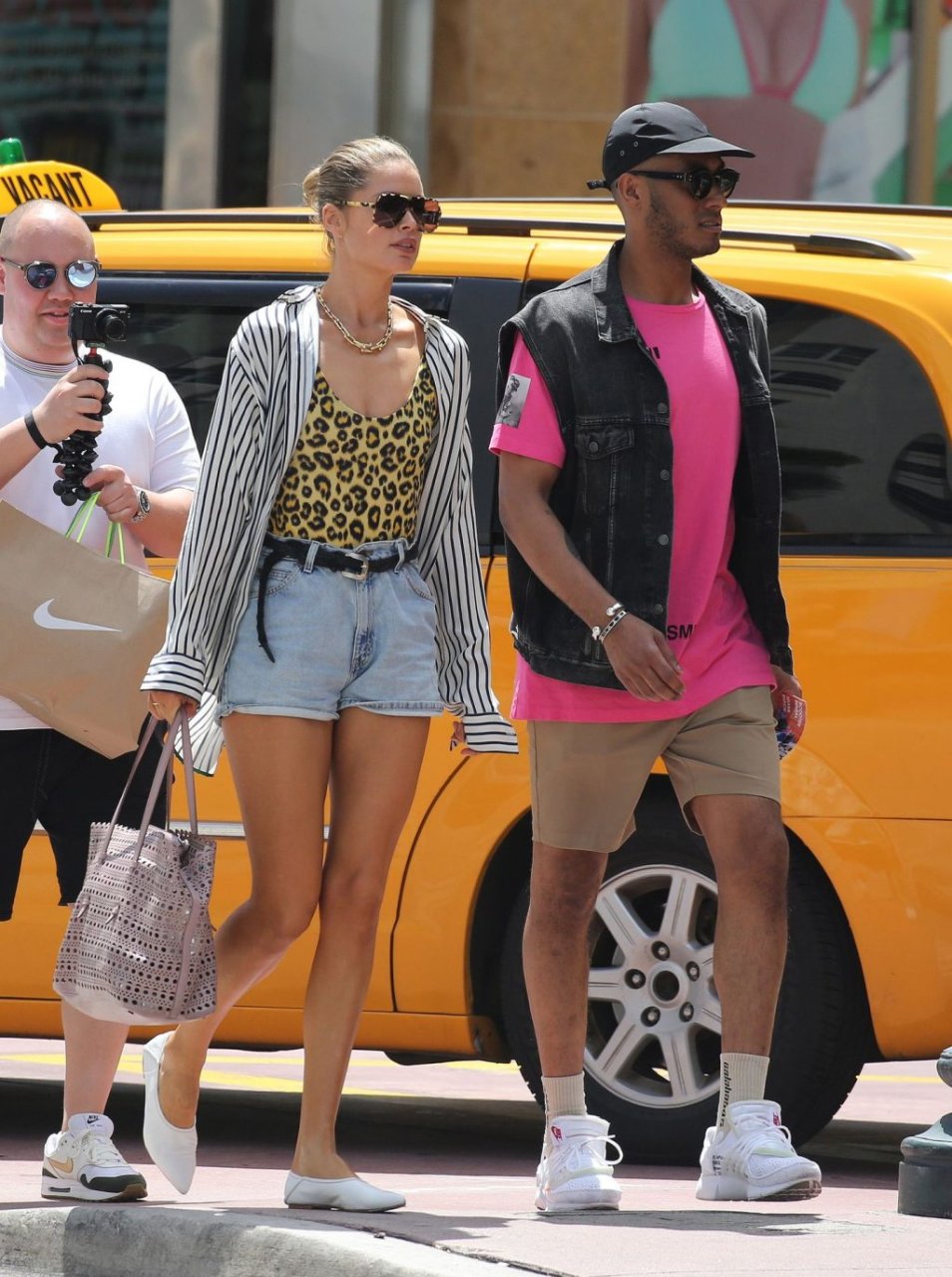 La supermodelo Doutzen Kroes se pone unos shorts de mezclilla y joyas llamativas sobre su traje de baño para dar un paseo por la ciudad con su esposo Sunnery James en Miami, 29/03/2019.