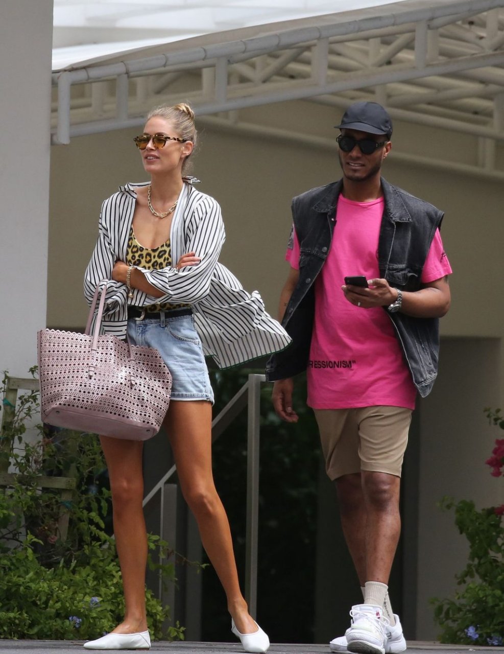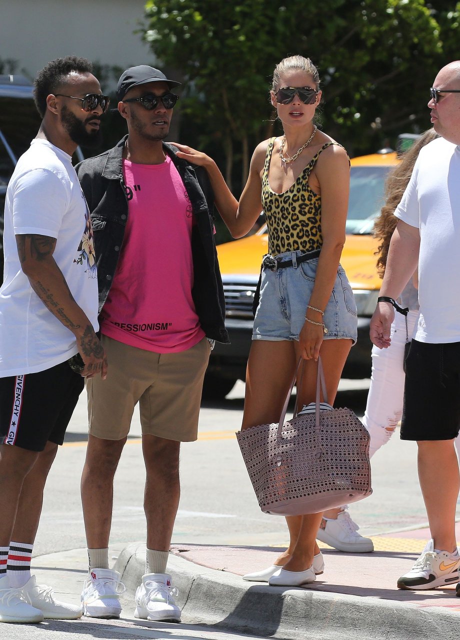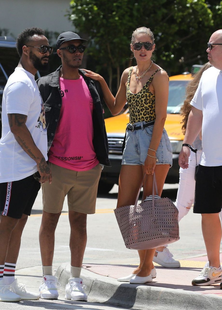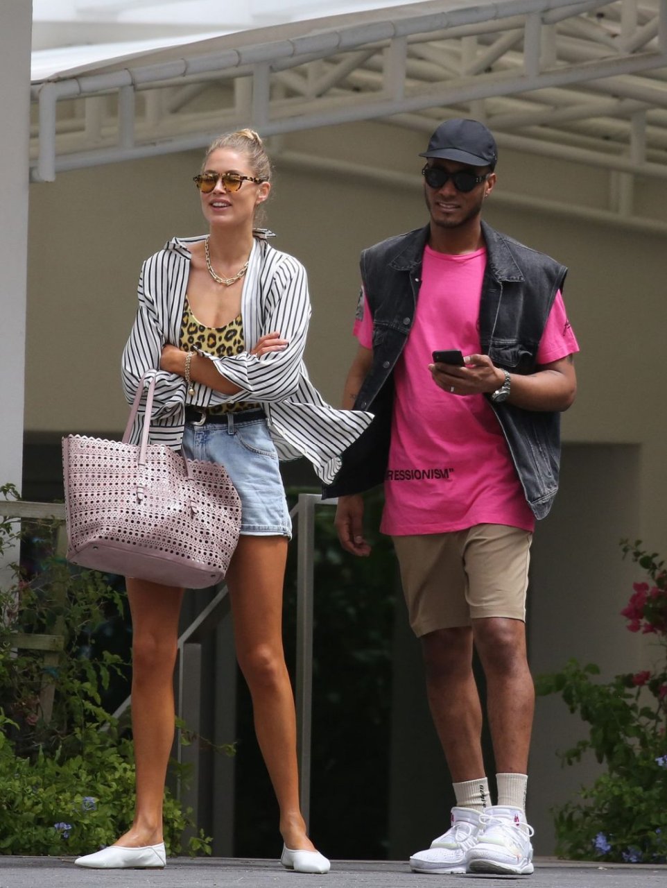 La supermodelo Doutzen Kroes se pone unos shorts de mezclilla y joyas llamativas sobre su traje de baño para dar un paseo por la ciudad con su esposo Sunnery James en Miami, 29/03/2019.
