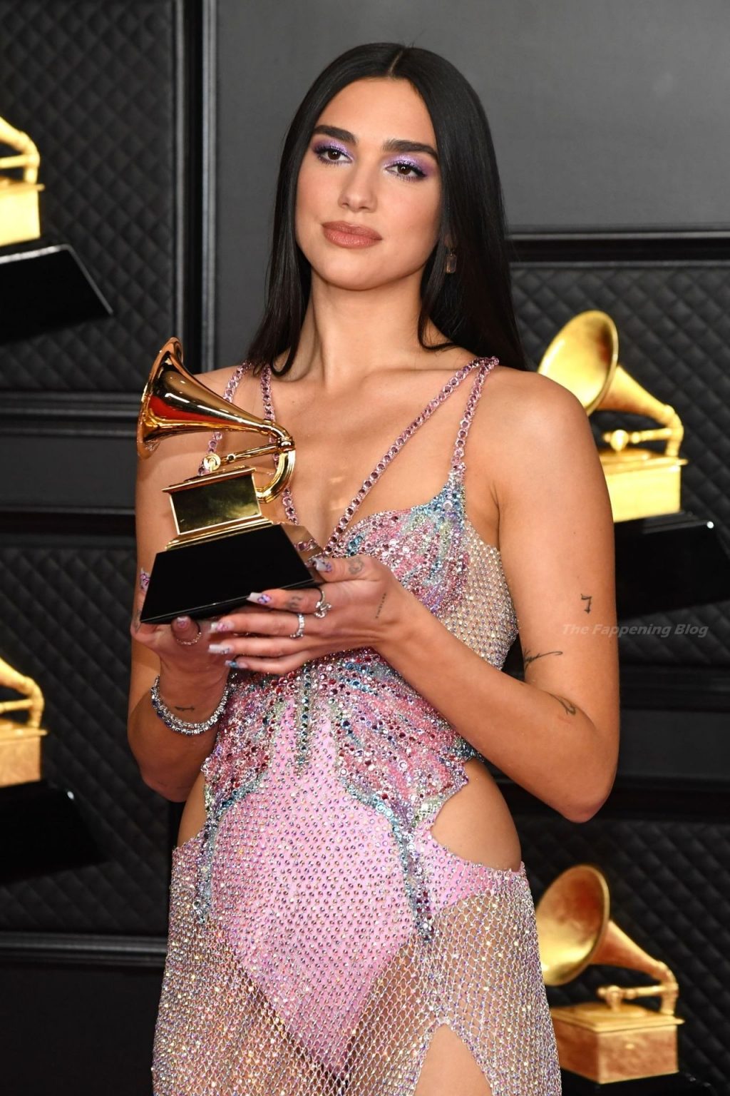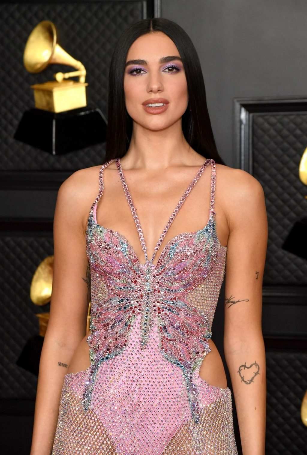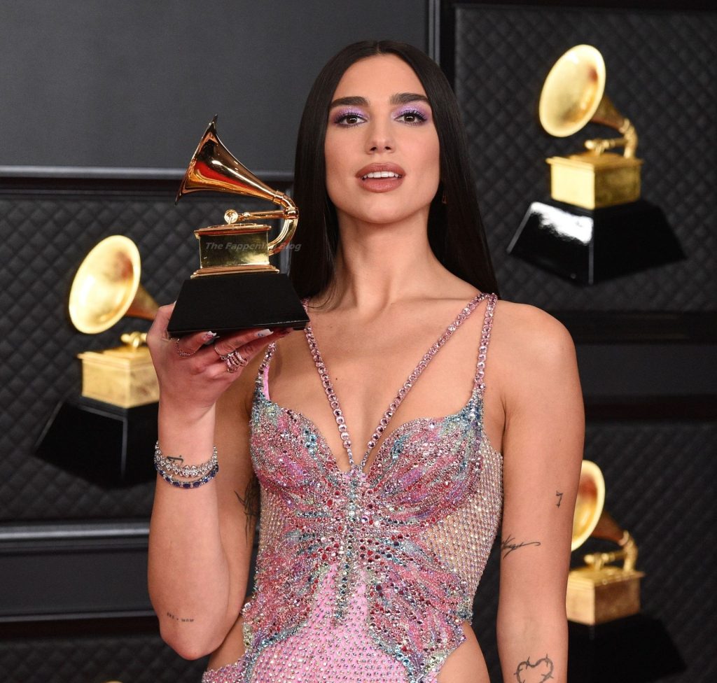 La cantante sin sostén Dua Lipa posa en la alfombra roja y actúa en el escenario en la 63ª Entrega Anual de los Premios Grammy en el Centro de Convenciones de Los Ángeles en LA, 14/03/2021.