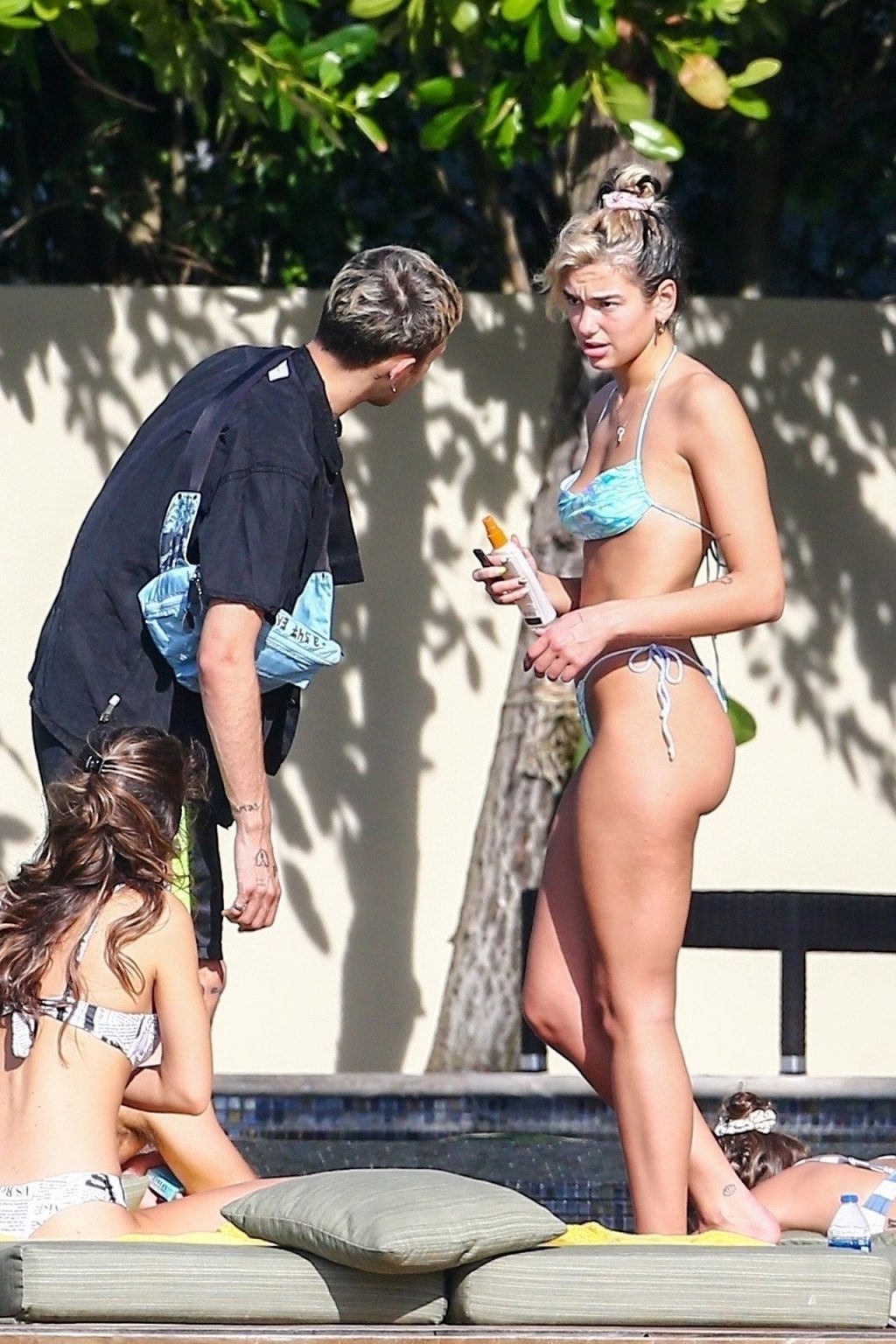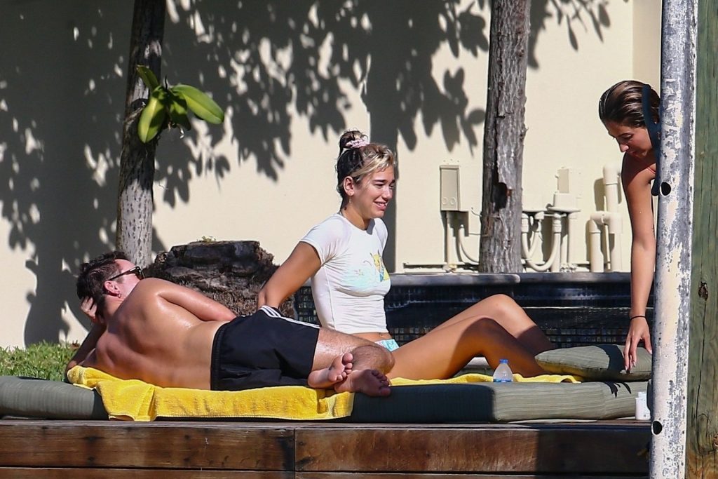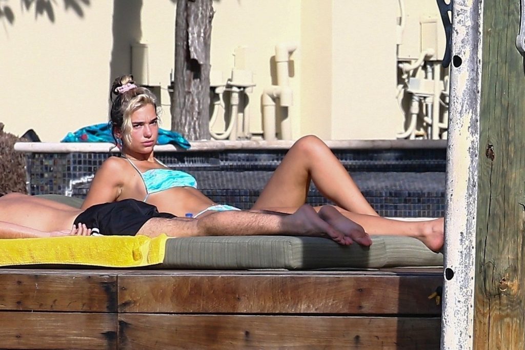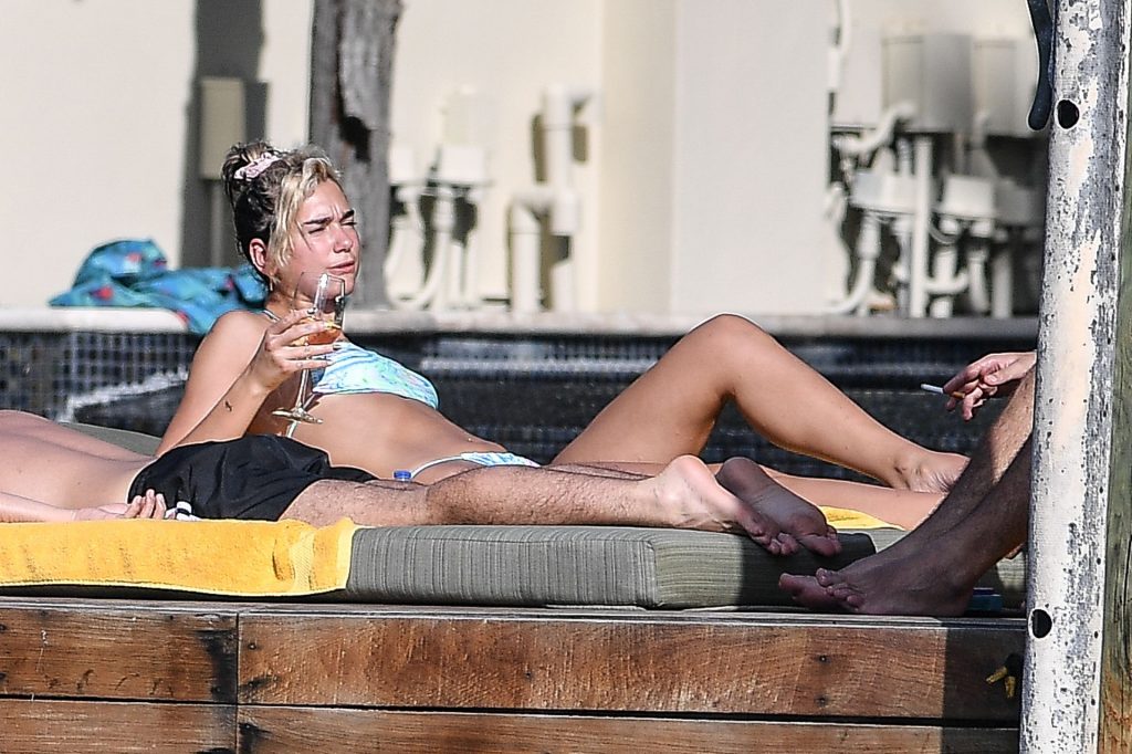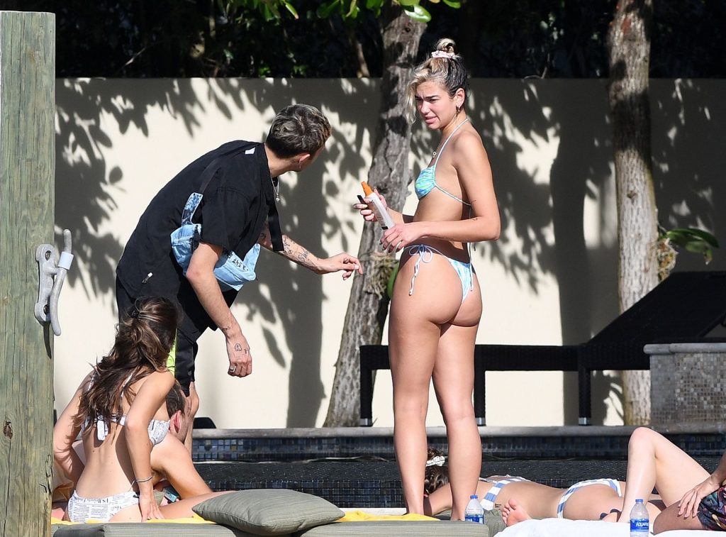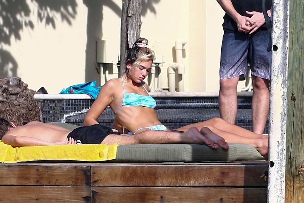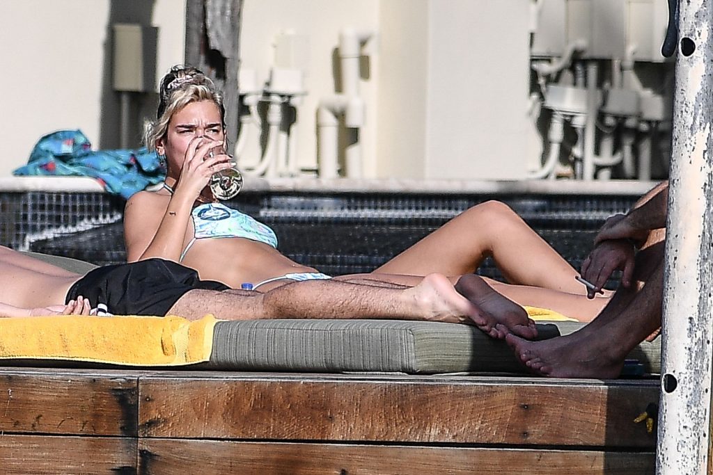 Dua Lipa lleva un bikini diminuto mientras toma el sol con su novio Anwar Hadid en Miami, 01/04/2020. La pareja parece muy enamorada ya que no pueden mantener las manos alejadas el uno del otro mientras se relajan con amigos.