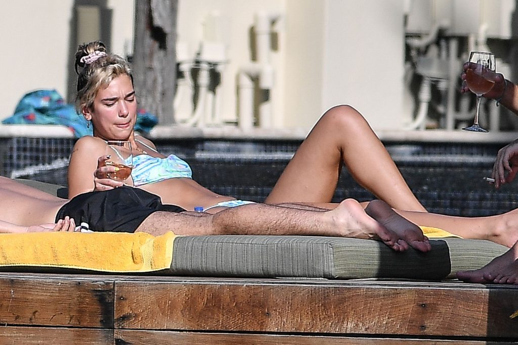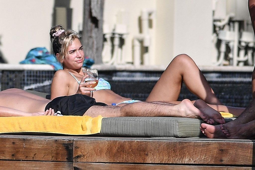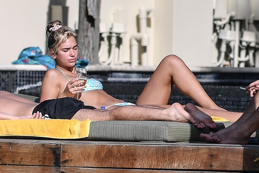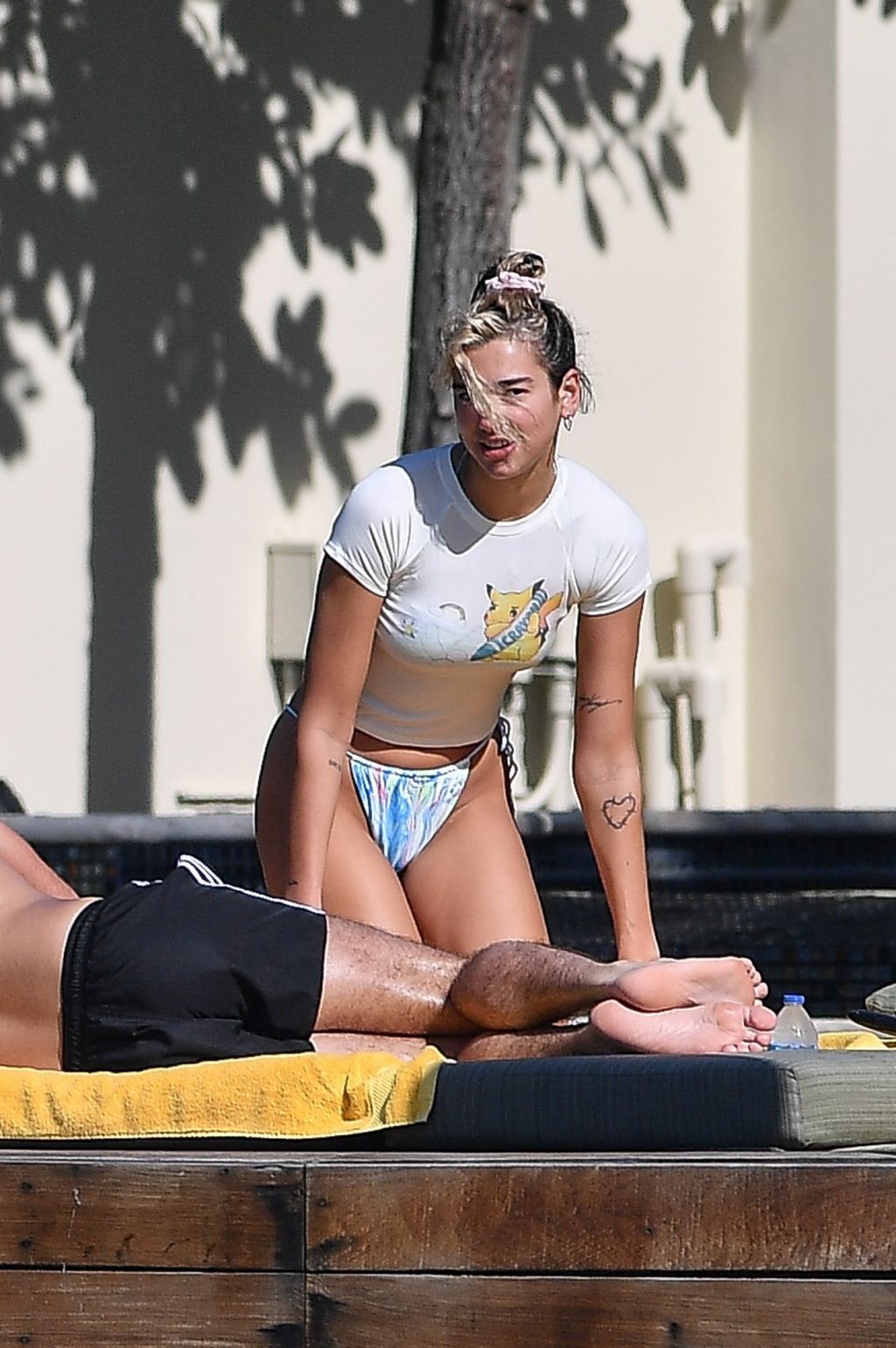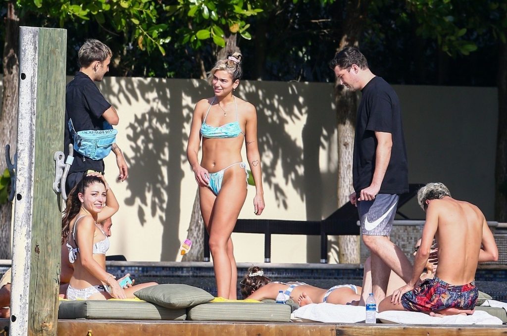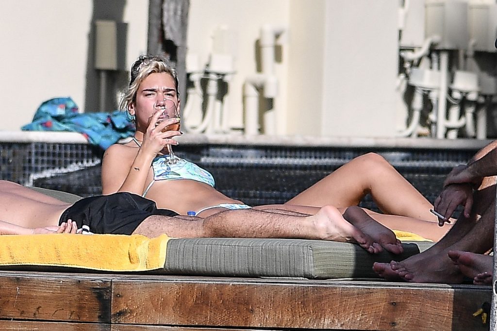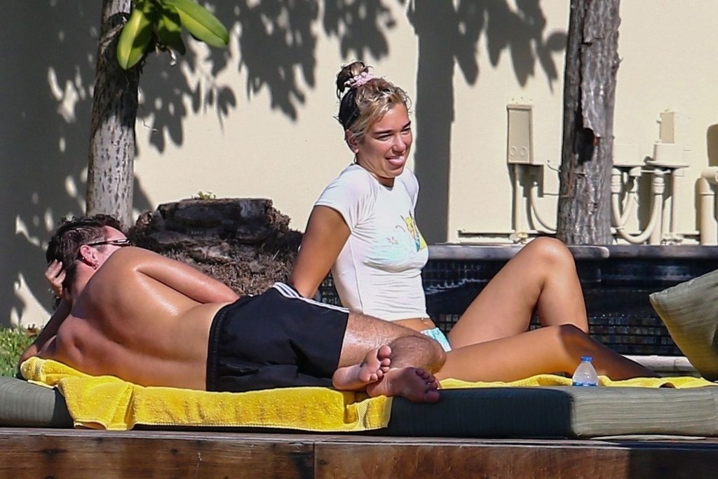 Dua Lipa lleva un bikini diminuto mientras toma el sol con su novio Anwar Hadid en Miami, 01/04/2020. La pareja parece muy enamorada ya que no pueden mantener las manos alejadas el uno del otro mientras se relajan con amigos.