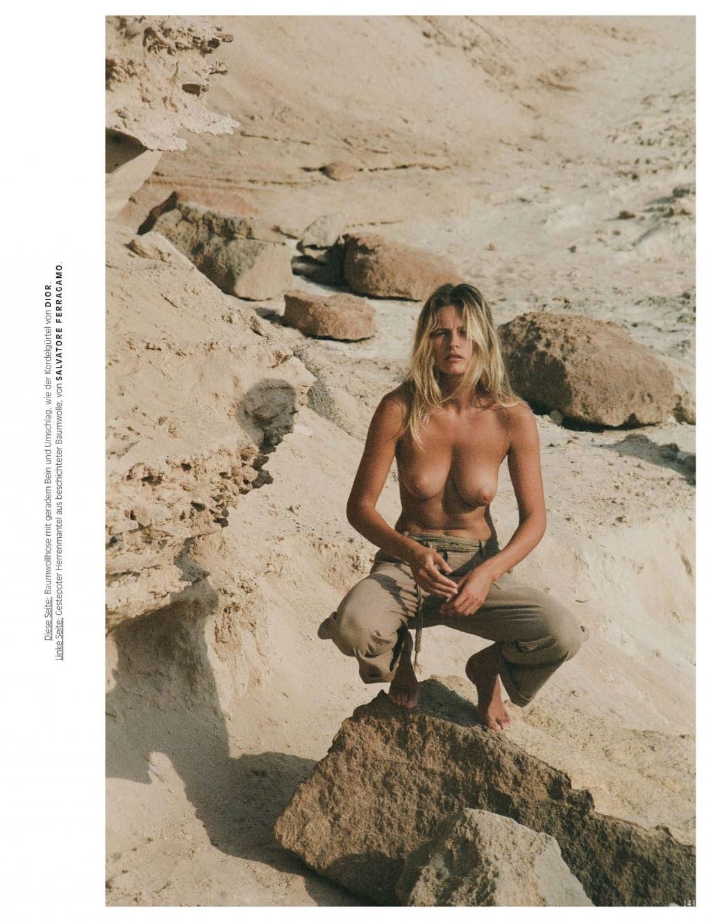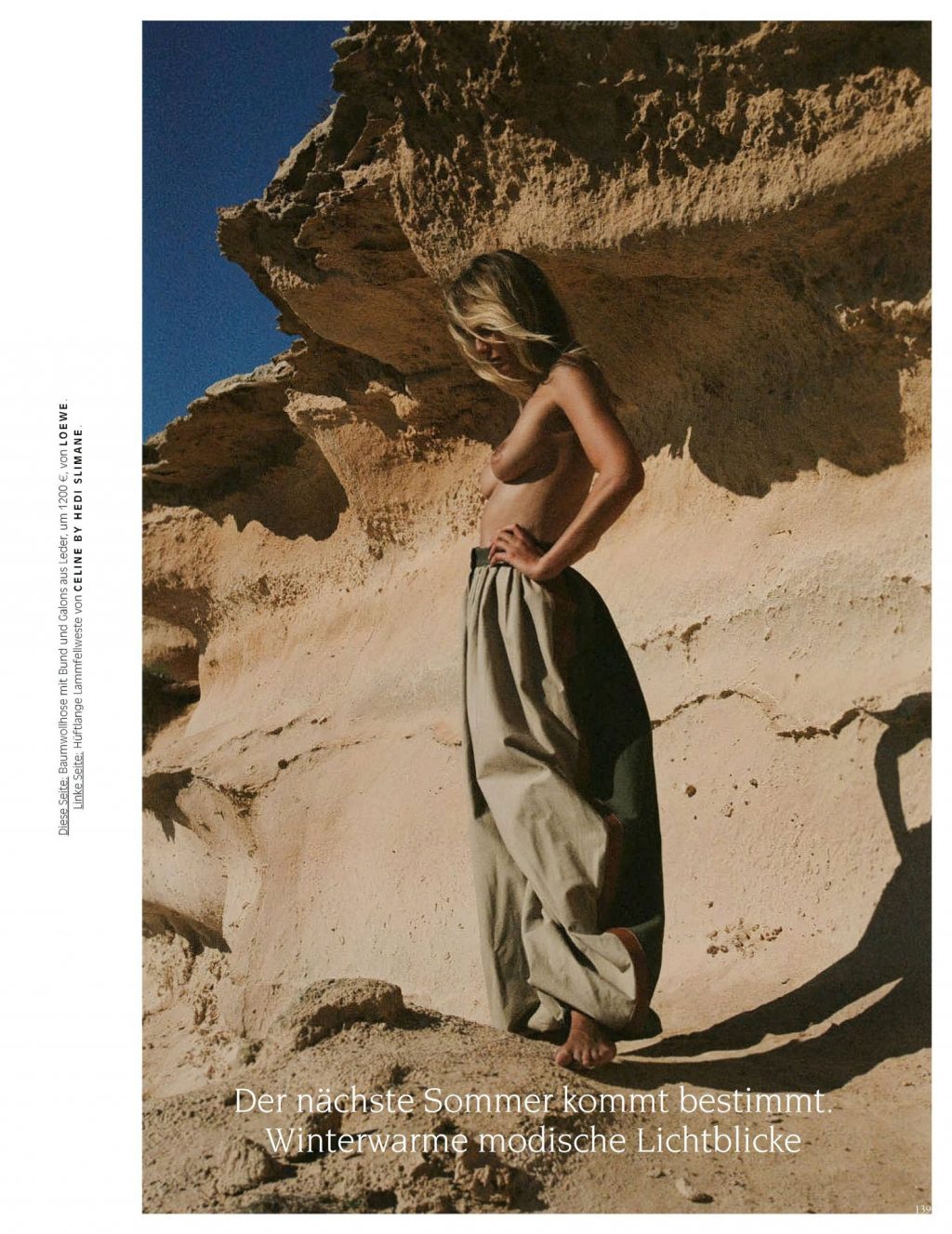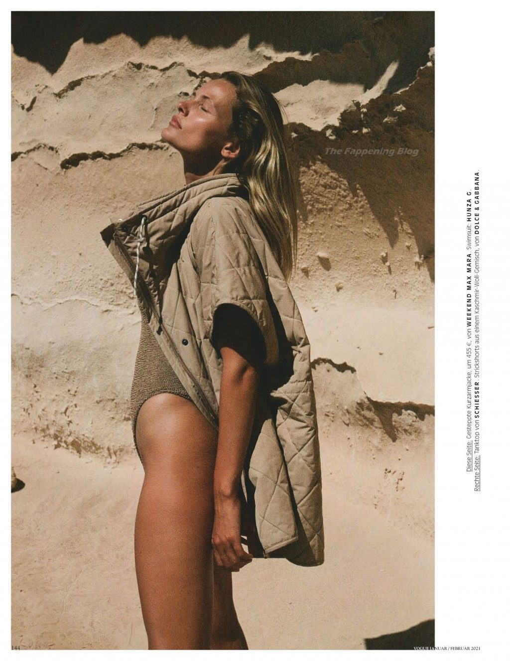 La modelo lituana besada por el sol Edita Vilkeviciute (32) muestra sus pechos desnudos, posando sin camiseta en la playa en una sesión fotográfica de Henrik Purienne para la revista Vogue Alemania, edición de enero/febrero 2021.