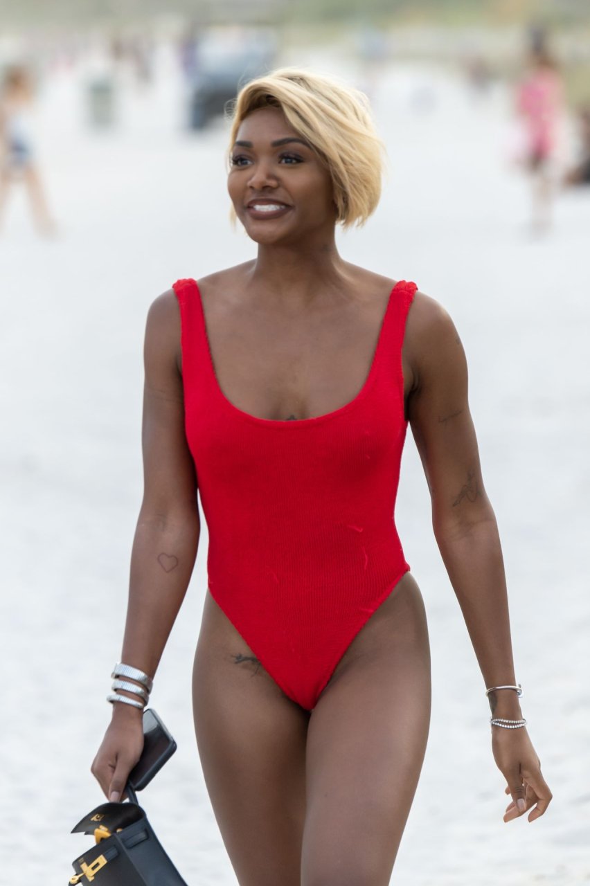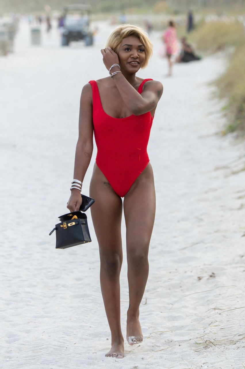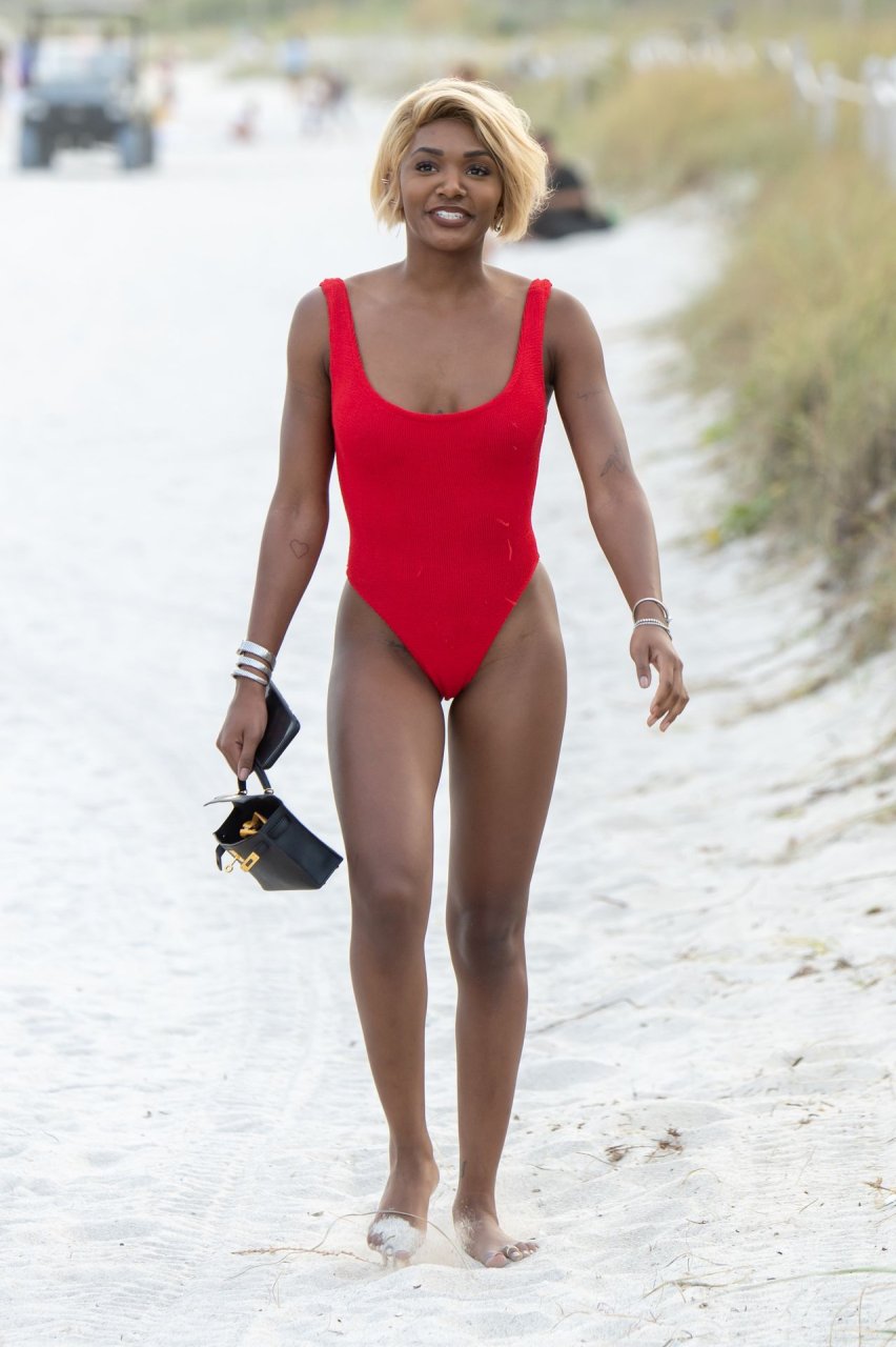 La hija de Magic Johnson, Elisa (24), fue vista usando un traje de baño rojo brillante en Miami Beach, 01/01/2019.