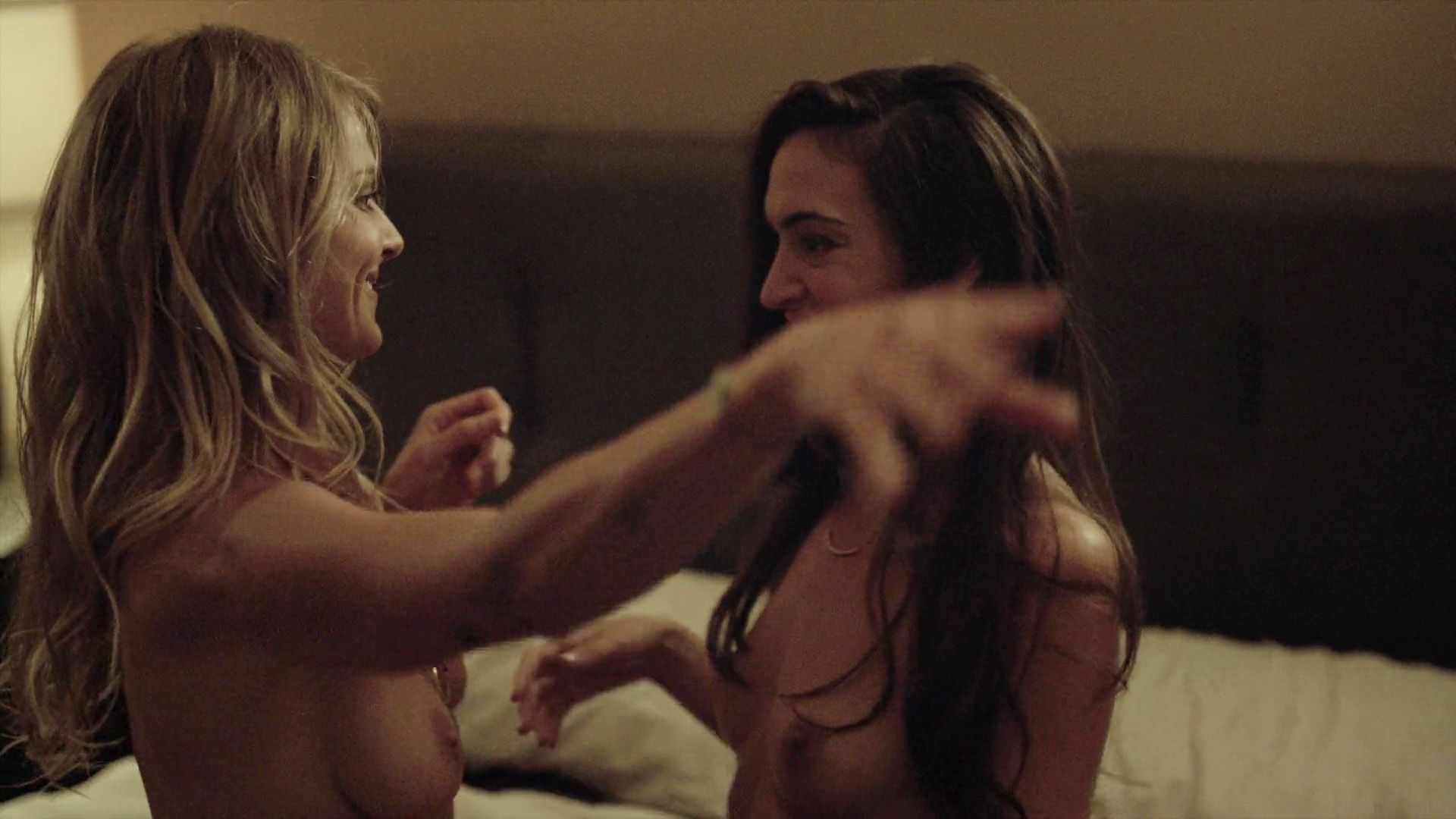 Eliza Coupe is passionately lesbian kissing Teri Andrez on a bed while some guys watch and then first removing Eliza’s white shirt to reveal her breasts, followed by Teri’s black bra to reveal her breasts as well, before they invite one of the guys into the bed with them and roll around kissing him giving us some looks at their asses in thong panties until finally the other guy starts to touch them and join in for a foursome, but then gives up and leaves the room.