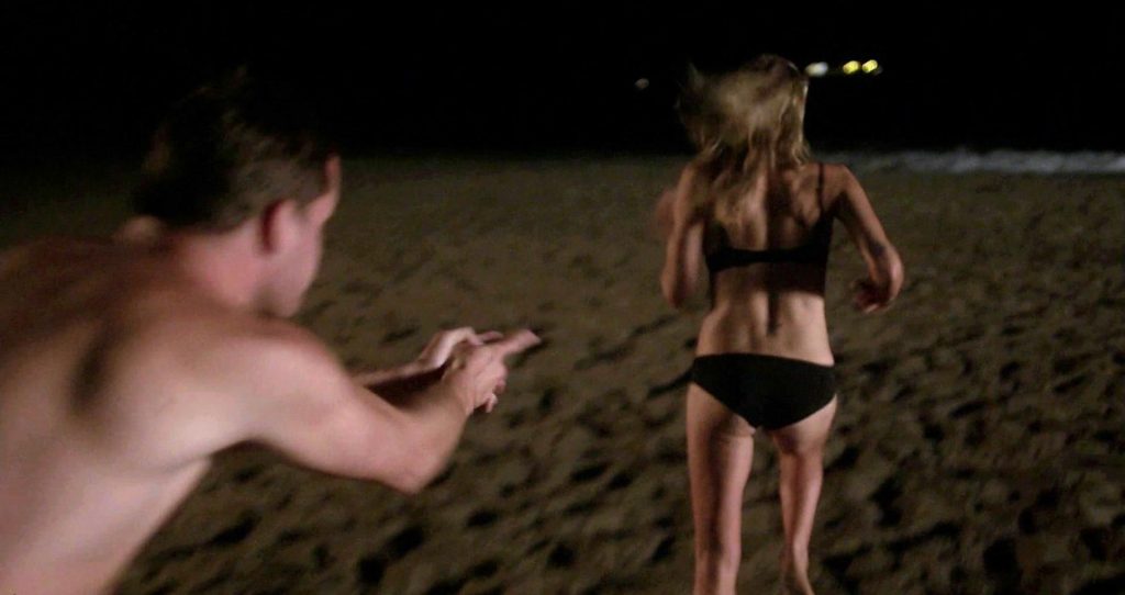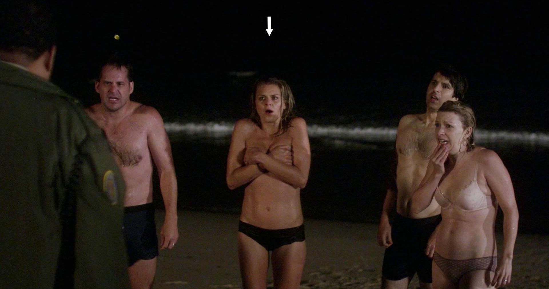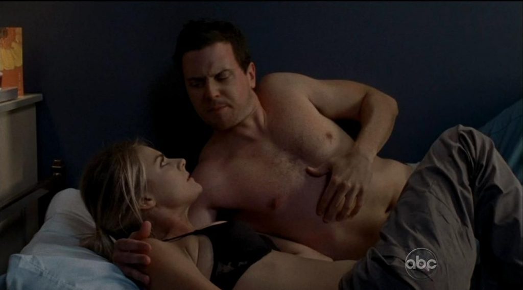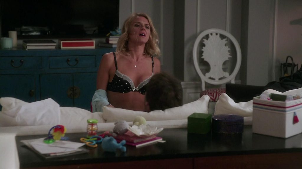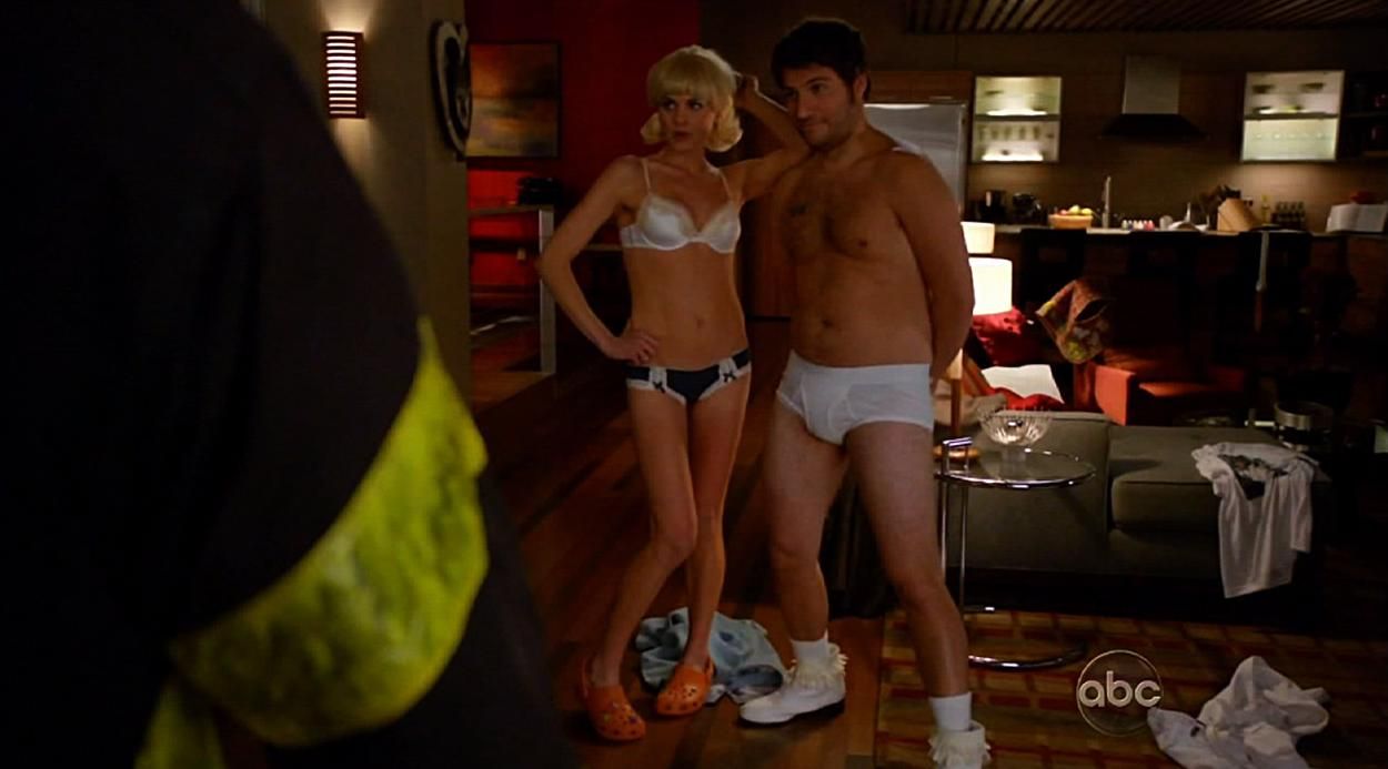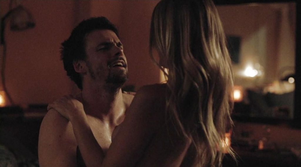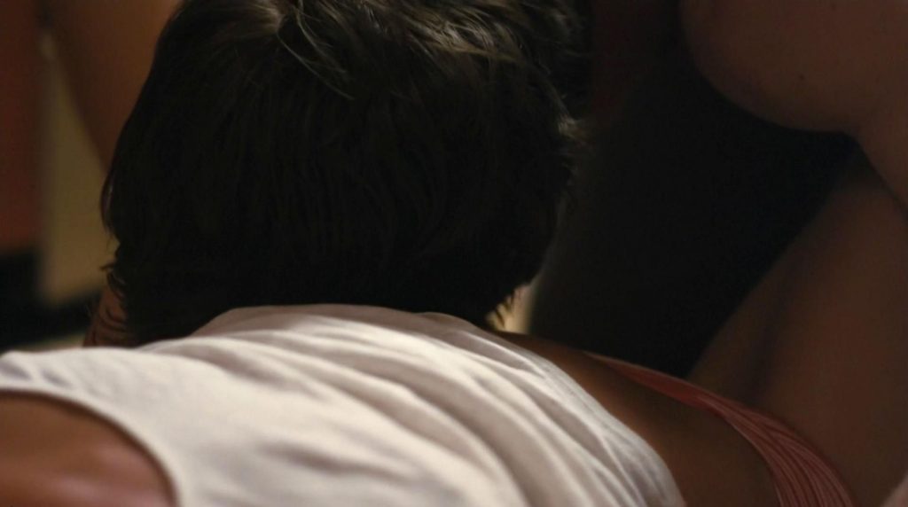 Eliza is seen having sex with a guy in a montage where we see her wearing a white tank top that lets her left nipple peek out into view when she is on her back. This alternates with footage of Eliza in the same tank top kissing the guy, this time with some pink panties on.