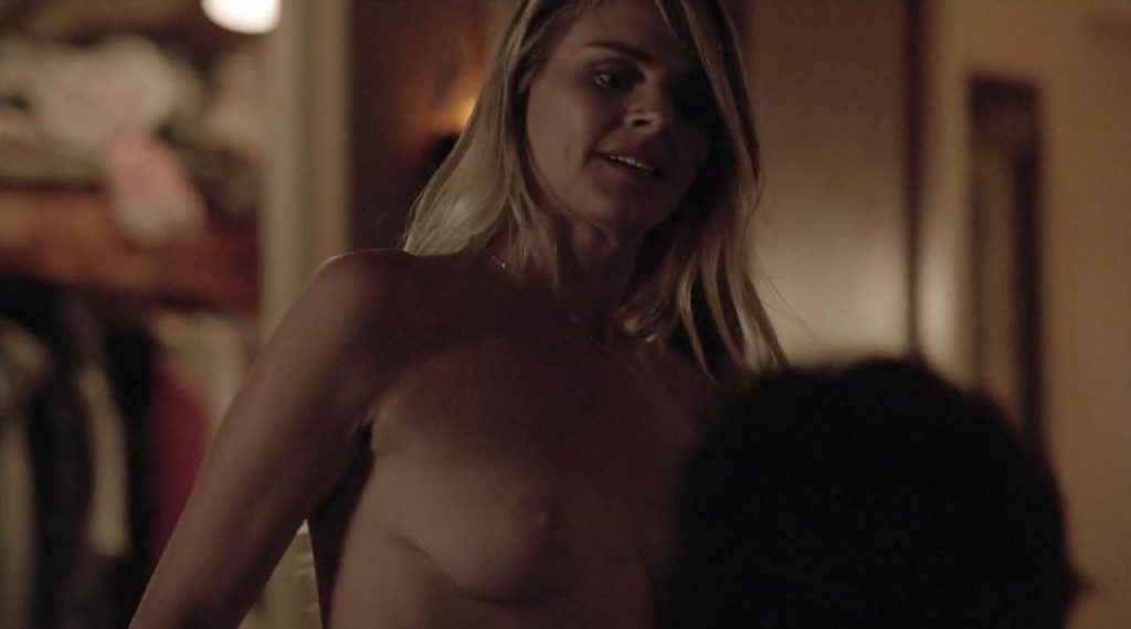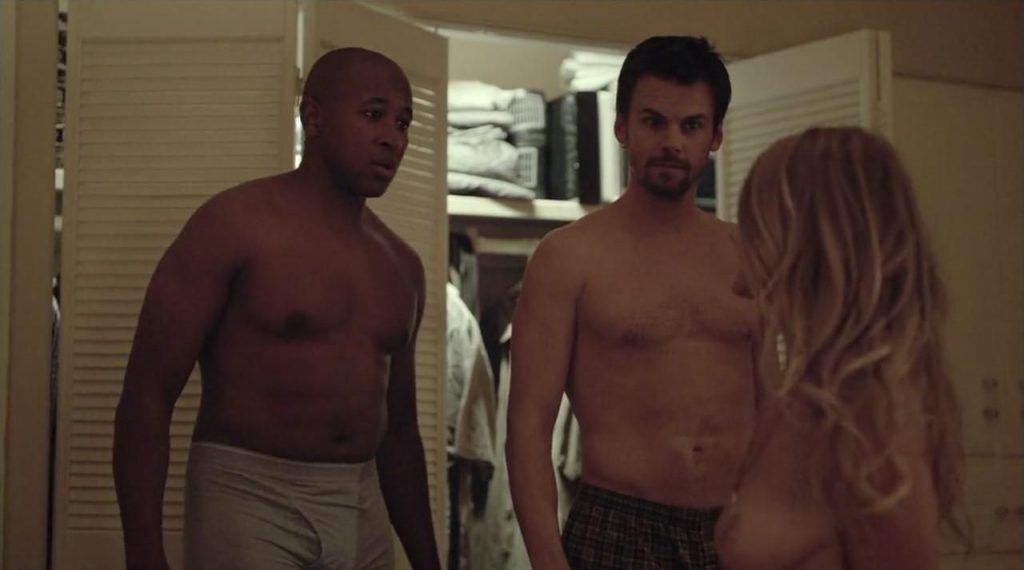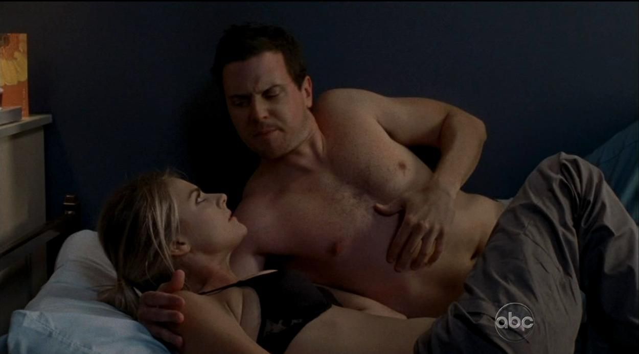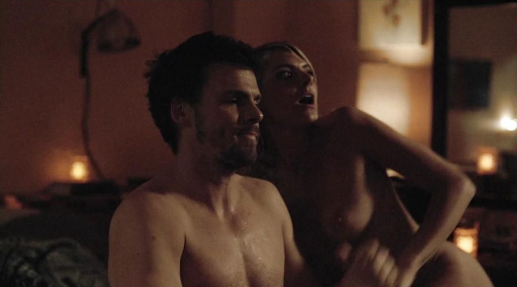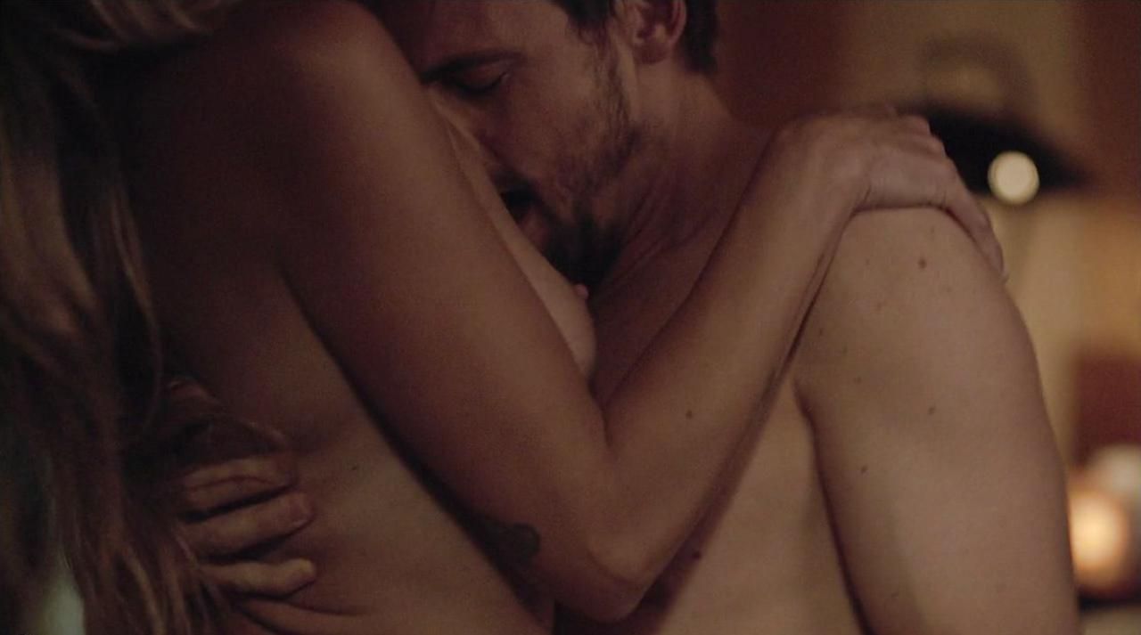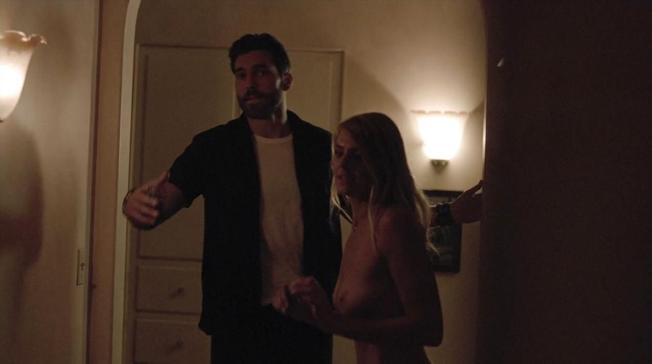 Eliza Coupe is having sex with a guy on the edge of a bed, naked in his lap as she rides him and we see her breasts and butt. She then dismounts and walks into another room naked to talk to a different guy. We see more of her breasts when she turns around and walks back to the bed, where she sits next to the first guy and wraps herself with the covers.